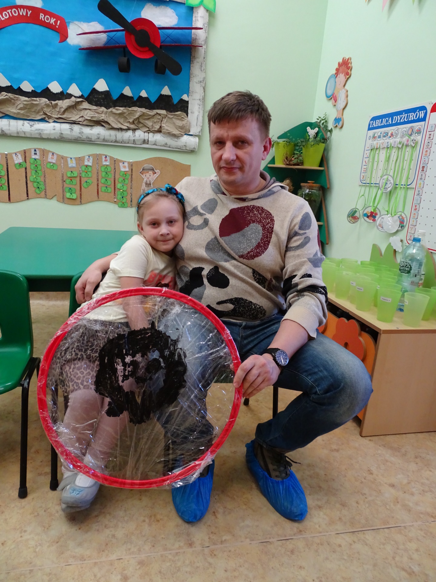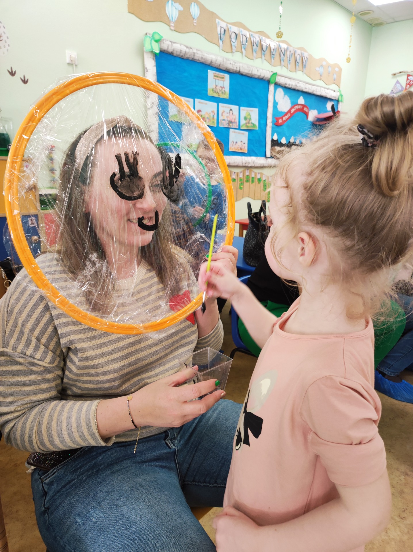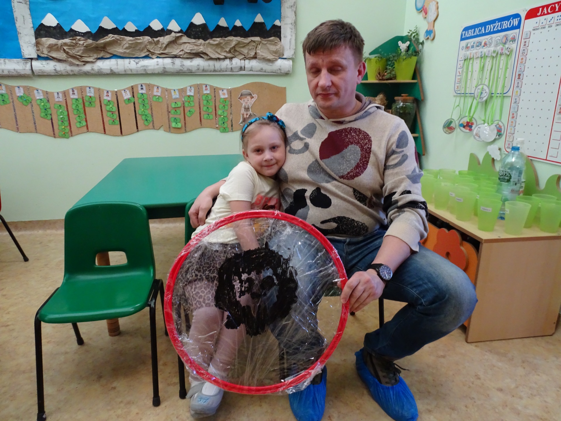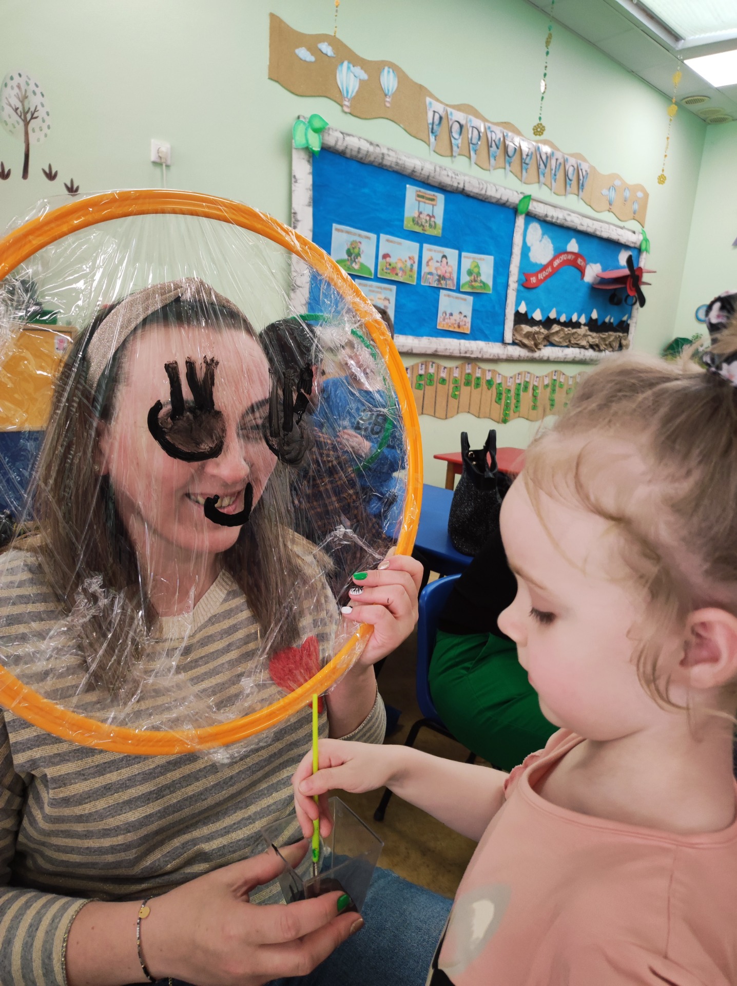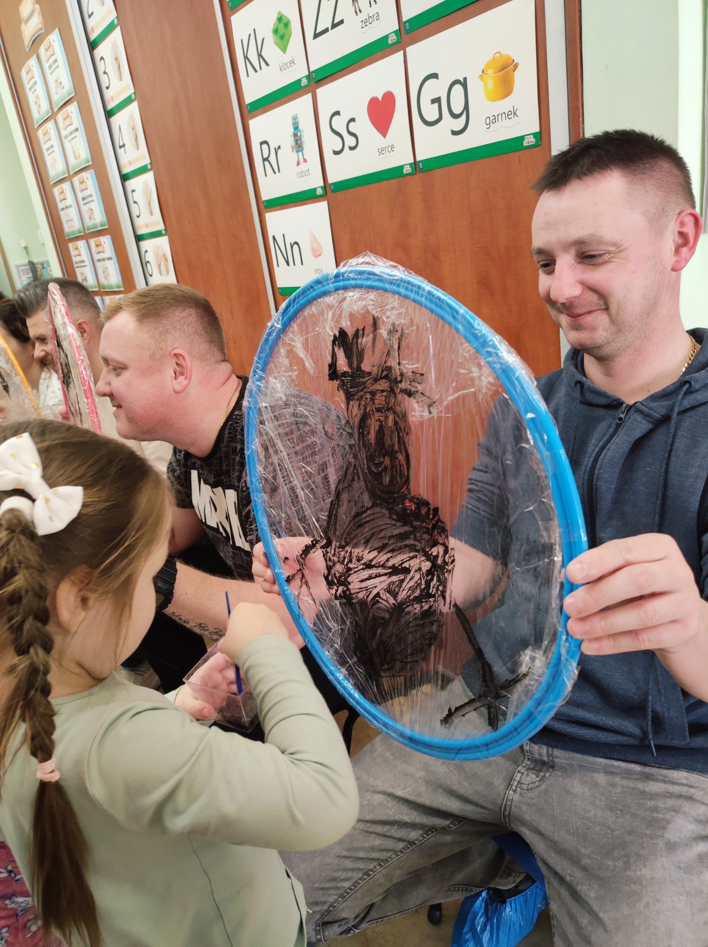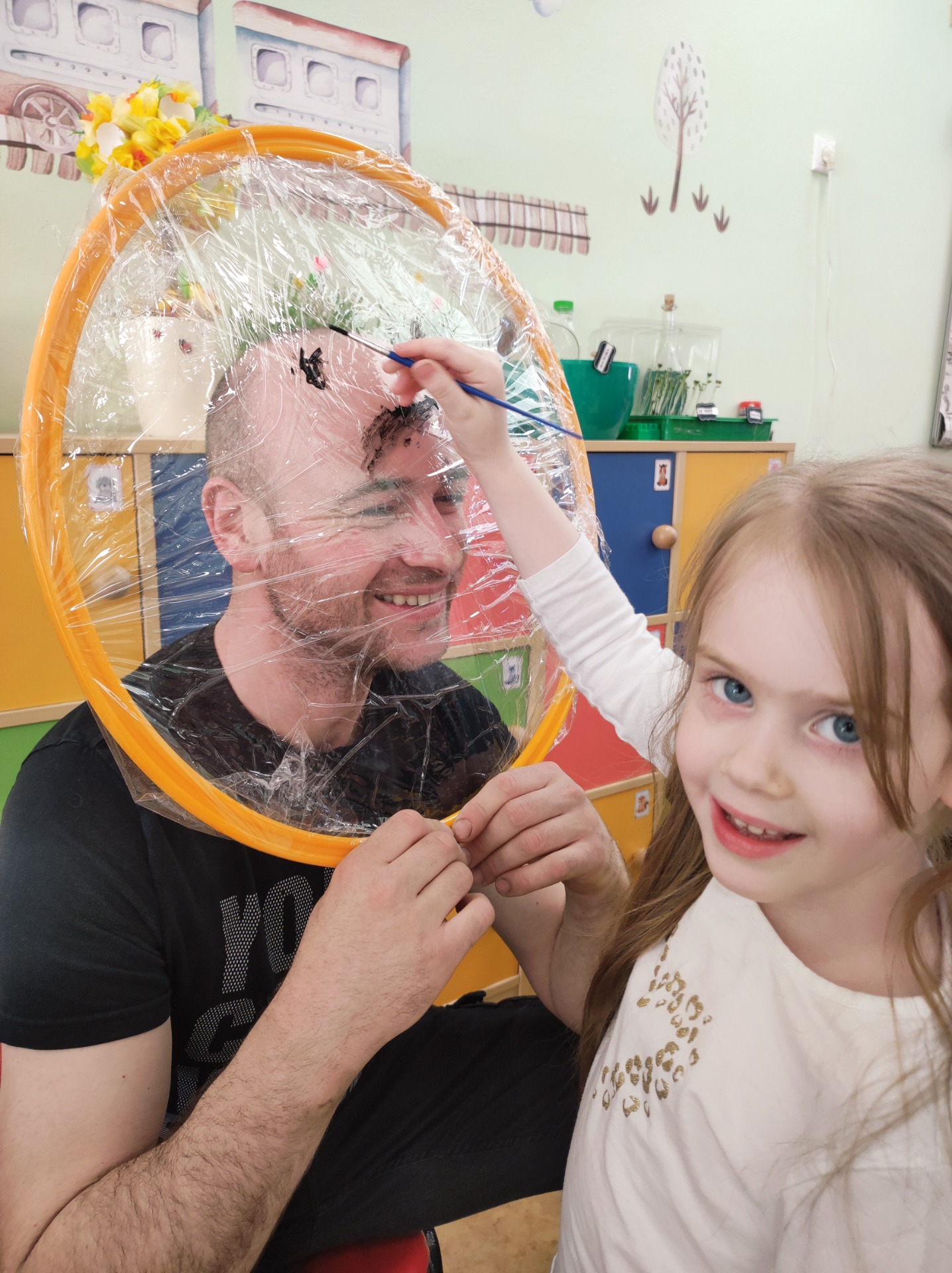 26 marca w grupie Podróżników odbyło się spotkanie świąteczne z rodzicami. Dzieci z niecierpliwością czekały godz.15.00, aby powitać swoich rodziców i wspólnie spędzić z nimi popołudnie w przedszkolu. Na samym początku, dzieci wybierały karty przedstawiające symbole wielkanocne, które wybieramy do koszyczka wielkanocnego. Później każdy z nich musiał skompletować swój koszyczek i odnaleźć 9 różnych elementów. Rodzice czujnie nadzorowali działanie dzieci 😊 Rozmawialiśmy również jakie czynności wykonujemy w okresie przedświątecznym… oczywiście dzieci świetnie wykazały się tą wiedzą 😊 Zbliżające się święta to gorący czas🔥 czas sprzątania oraz gotowania. Tak więc i my imitowaliśmy to w naszej sali, a pomogła nam w tym zabawa „Praczka” oraz zabawa Klanzy „Ciasto”. Dzieci miały okazję również wcielić się w rolę mamy i ubijały pianę z białek😁 Na zakończenie dzieci mogły wykazać się swoimi zdolnościami plastycznymi i wykonać portret swojego rodzica. A pomogła im w tym obręcz owinięta folią stretch. To było bardzo wesołe i miłe popołudnie 😊