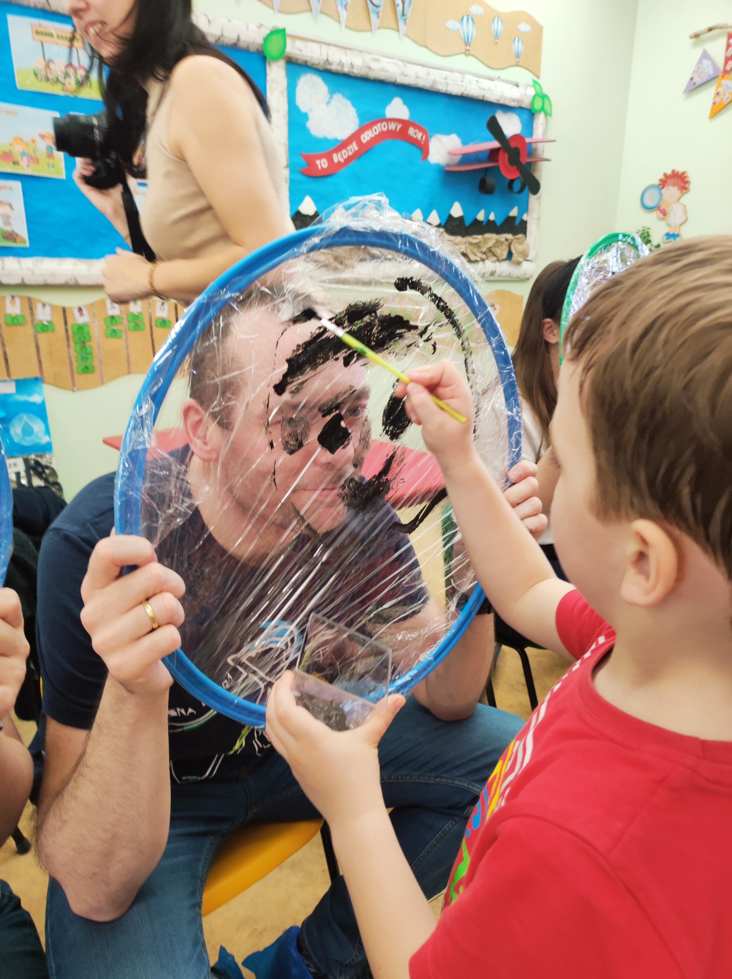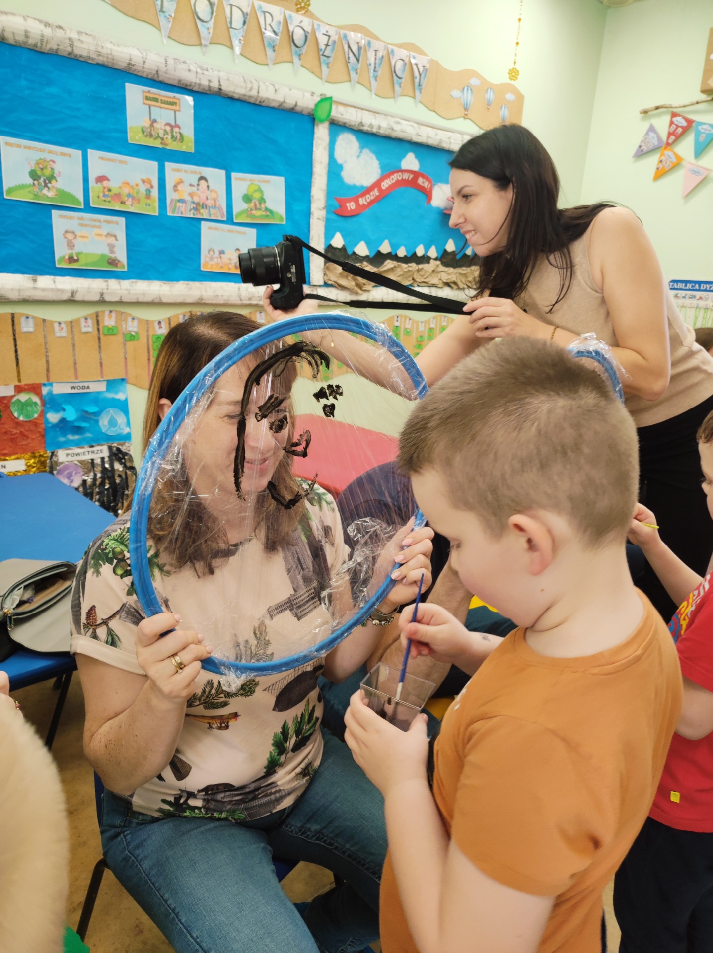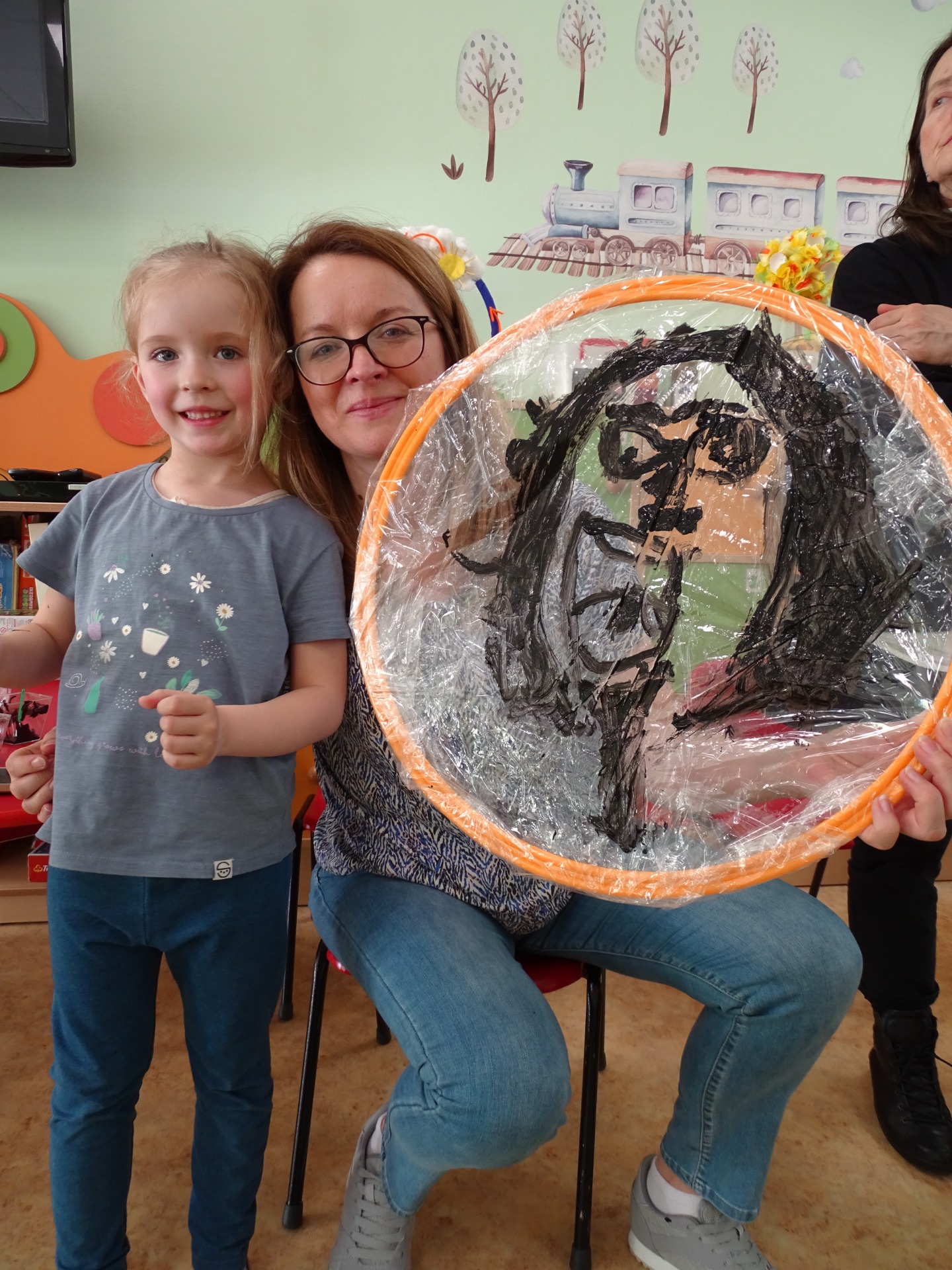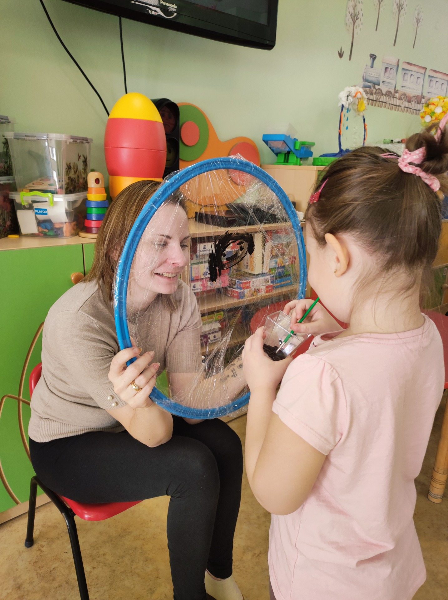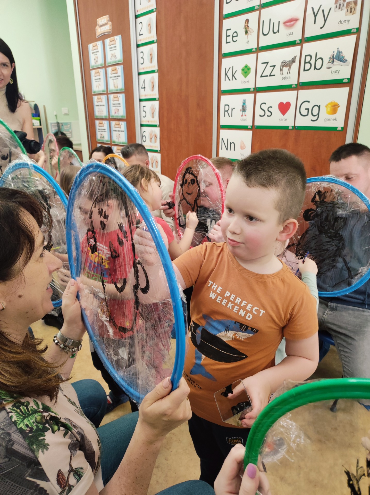 26 marca w grupie Podróżników odbyło się spotkanie świąteczne z rodzicami. Dzieci z niecierpliwością czekały godz.15.00, aby powitać swoich rodziców i wspólnie spędzić z nimi popołudnie w przedszkolu. Na samym początku, dzieci wybierały karty przedstawiające symbole wielkanocne, które wybieramy do koszyczka wielkanocnego. Później każdy z nich musiał skompletować swój koszyczek i odnaleźć 9 różnych elementów. Rodzice czujnie nadzorowali działanie dzieci 😊 Rozmawialiśmy również jakie czynności wykonujemy w okresie przedświątecznym… oczywiście dzieci świetnie wykazały się tą wiedzą 😊 Zbliżające się święta to gorący czas🔥 czas sprzątania oraz gotowania. Tak więc i my imitowaliśmy to w naszej sali, a pomogła nam w tym zabawa „Praczka” oraz zabawa Klanzy „Ciasto”. Dzieci miały okazję również wcielić się w rolę mamy i ubijały pianę z białek😁 Na zakończenie dzieci mogły wykazać się swoimi zdolnościami plastycznymi i wykonać portret swojego rodzica. A pomogła im w tym obręcz owinięta folią stretch. To było bardzo wesołe i miłe popołudnie 😊
