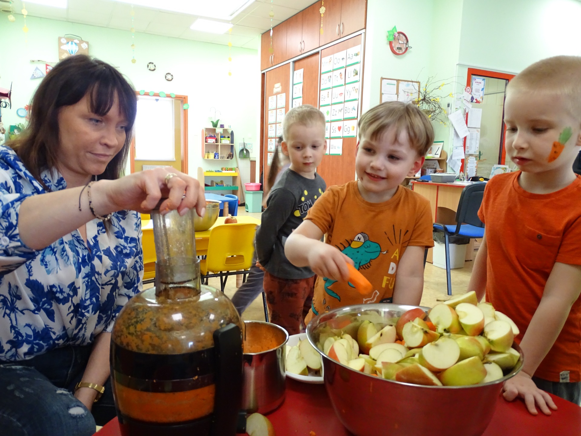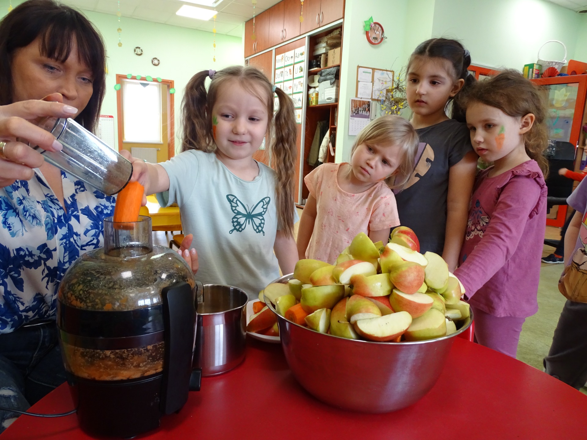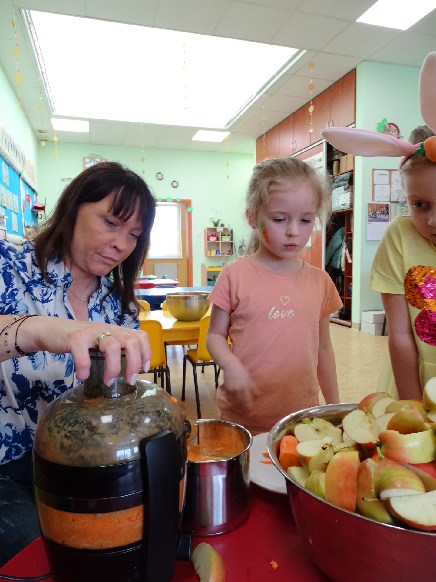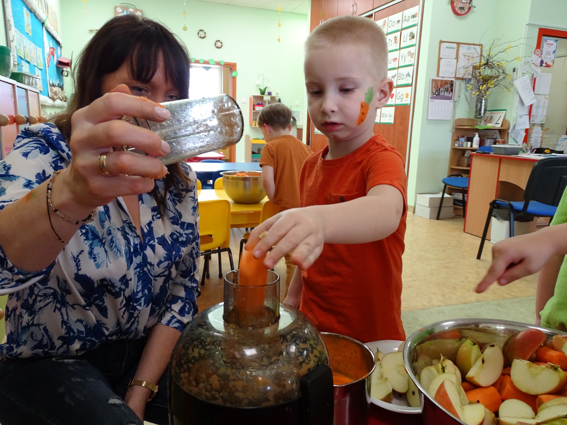 4 kwietnia bohaterk膮 dnia w grupie Podr贸偶nik贸w by艂a MARCHEWKA. Celem tego dnia by艂o przedstawienie i promowanie spo偶ywania warzyw i owoc贸w jako dar贸w natury na przyk艂adzie marchewki, rozwijanie umiej臋tno艣ci wsp贸艂dzia艂ania w zespole oraz zapoznanie dzieci ze sprz臋tem gospodarstwa domowego - sokowir贸wk膮. Dzieci zapozna艂y si臋 z budow膮 marchewki, wymienia艂y potrawy jakie mo偶na przyrz膮dzi膰 z marchwi oraz dowiedzia艂y si臋 kilku ciekawostek na jej temat. Tego dnia nie zabrak艂o r贸wnie偶 aktywno艣ci fizycznej i wcielenia si臋 w rol臋 ogrodnika, fotobudki i przyrz膮dzenia pyyysznego soku marchewkowego 馃槉 To by艂a prawdziwa bomba witaminowa!!
