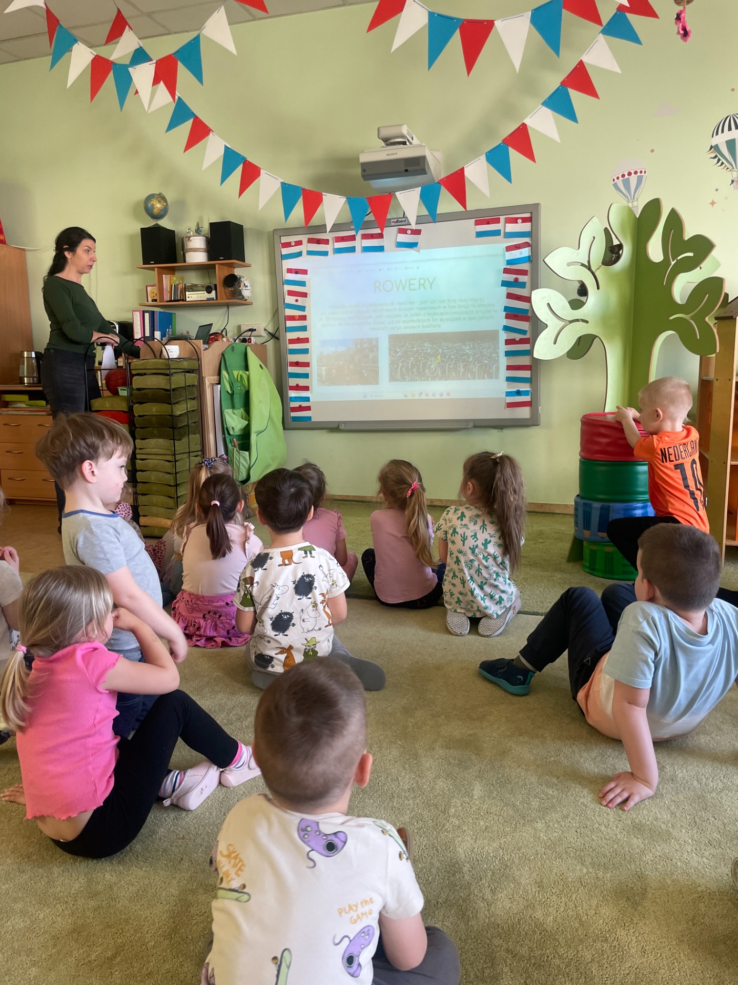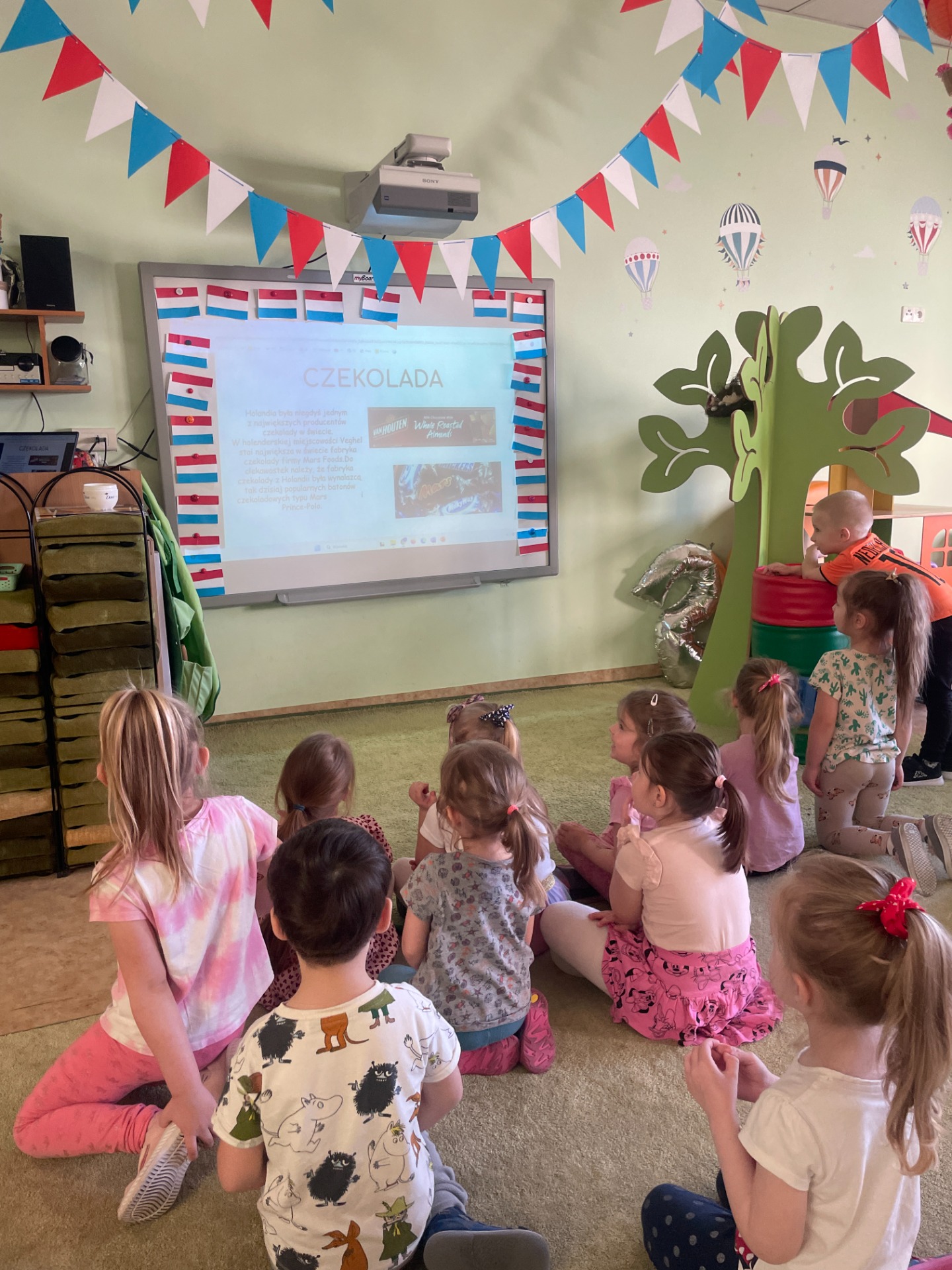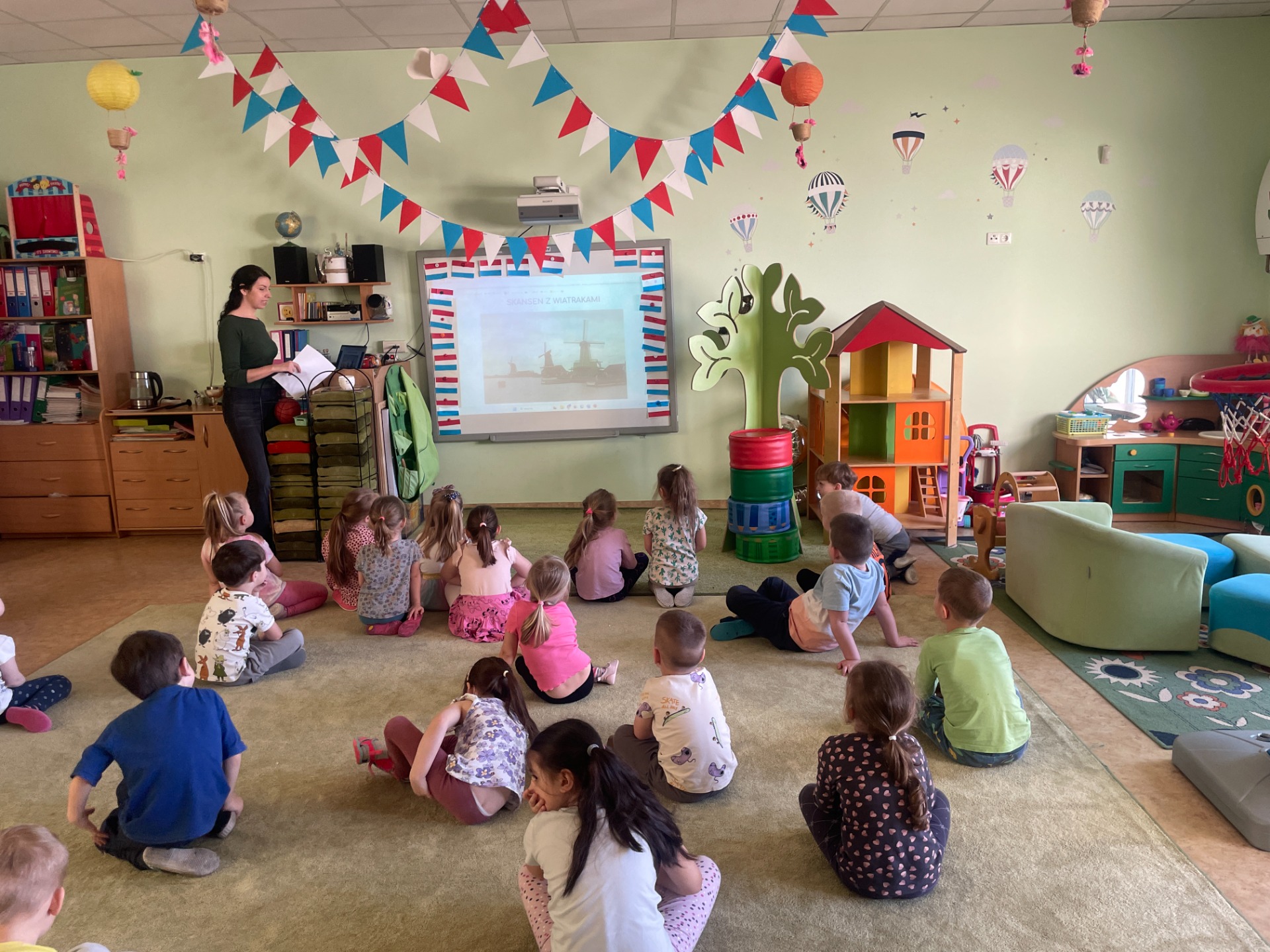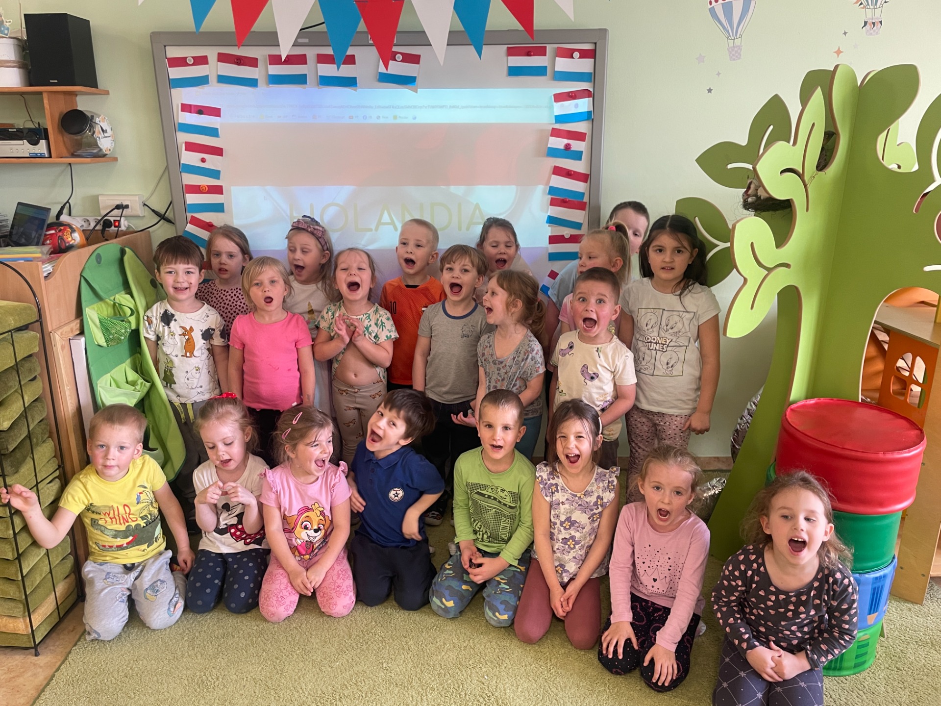 Dzisiaj Podróżnicy odwiedzili niderlandzki kraj jakim jest Holandia. Przedszkolaki dowiedziały się z czego słynie ten kraj, poznały jego tradycyjny strój ludowy oraz posłuchały jak brzmi język holenderski. Podczas pokazu slajdów dzieci zachwycały się polami pełnymi tulipanów, zabytkowymi i nowoczesnymi wiatrakami, holenderskim mlekiem oraz serami, a także pięknymi uliczkami Amsterdamu. Podróż po Holandii umilały zagadki, które jednocześnie były zadaniami do wykonania. Dzieci mogły degustować ser, wybrać się na wycieczkę rowerową, a także eksperymentowały z mlekiem tworząc "kolorowy mleczny wir". Zwieńczeniem zajęć było wykonanie wiatraków oraz degustacja czekolady z której = Holandia słynie.