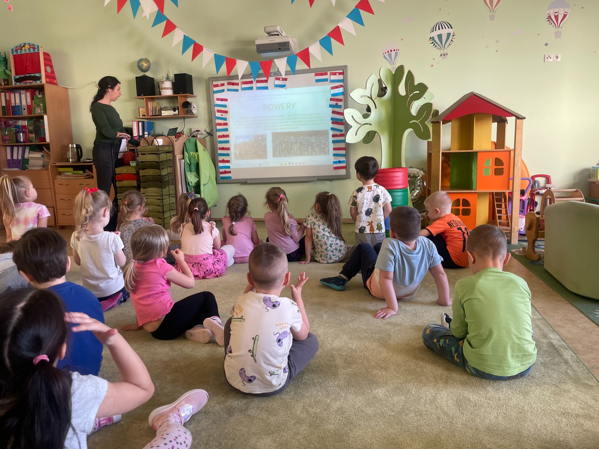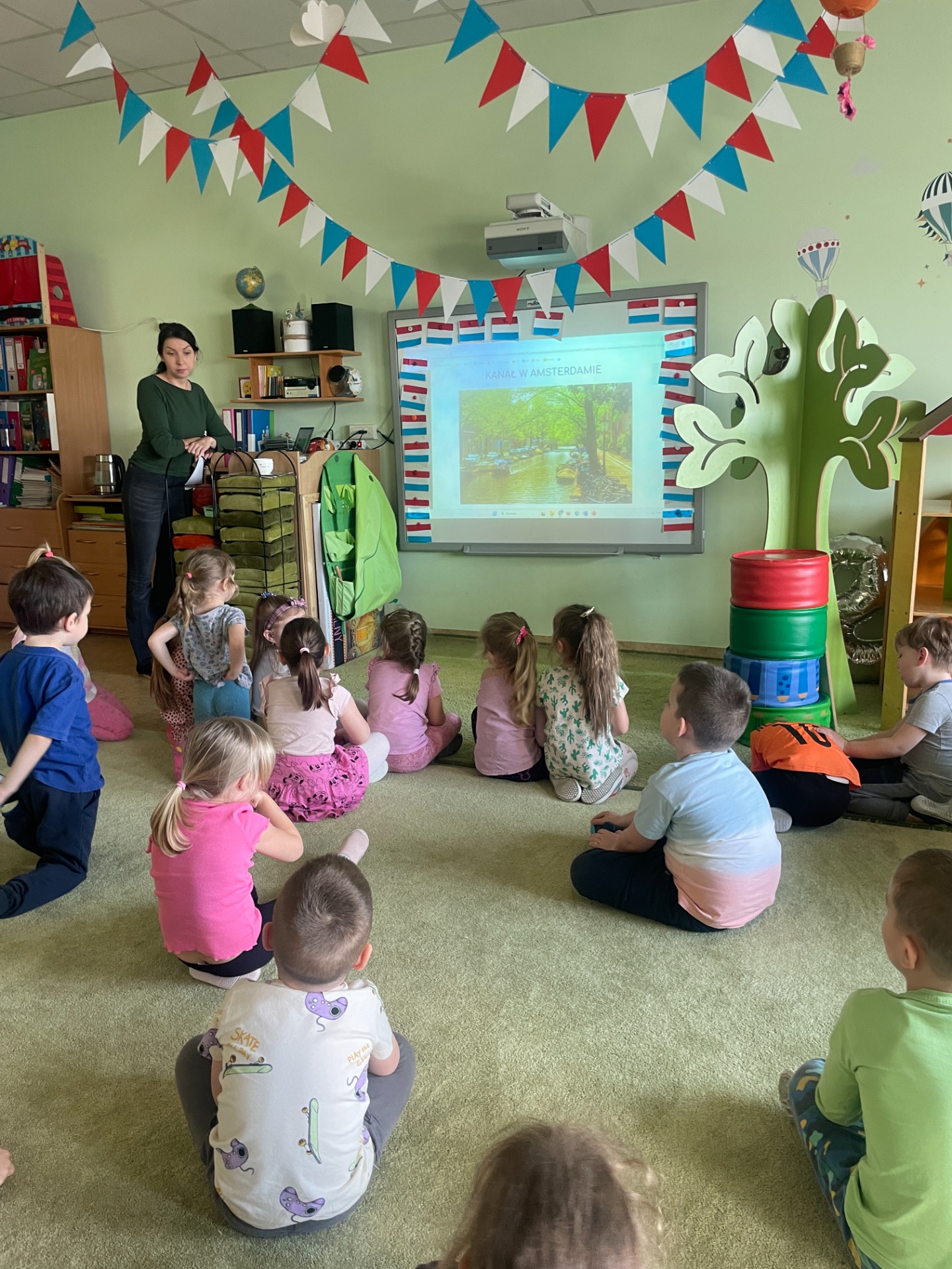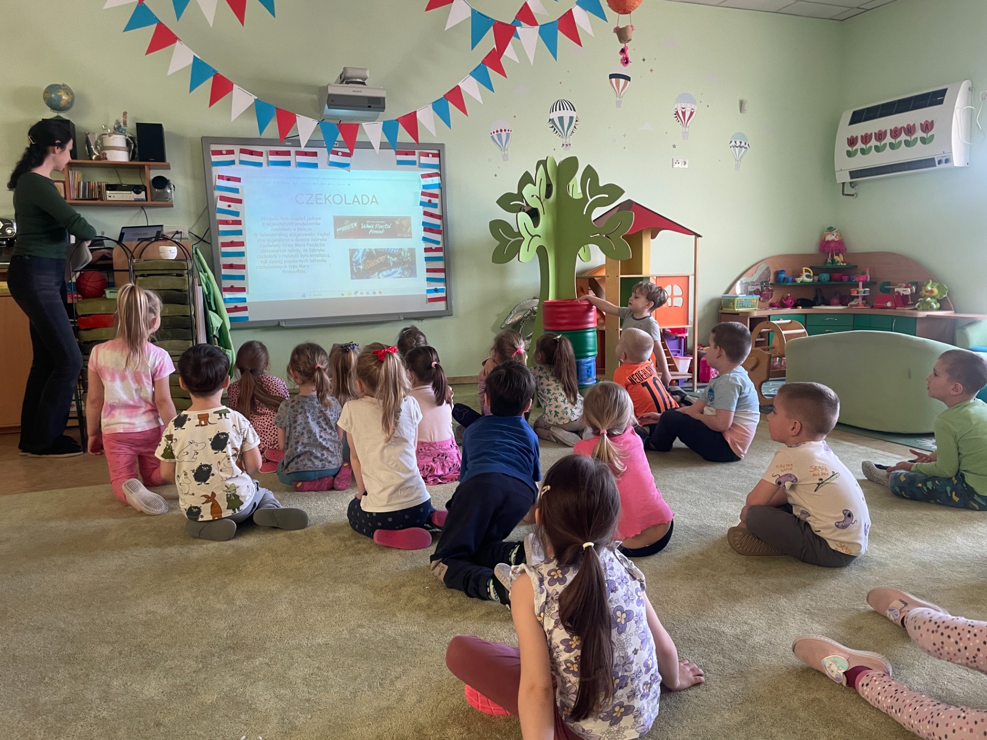 Dzisiaj Podróżnicy odwiedzili niderlandzki kraj jakim jest Holandia. Przedszkolaki dowiedziały się z czego słynie ten kraj, poznały jego tradycyjny strój ludowy oraz posłuchały jak brzmi język holenderski. Podczas pokazu slajdów dzieci zachwycały się polami pełnymi tulipanów, zabytkowymi i nowoczesnymi wiatrakami, holenderskim mlekiem oraz serami, a także pięknymi uliczkami Amsterdamu. Podróż po Holandii umilały zagadki, które jednocześnie były zadaniami do wykonania. Dzieci mogły degustować ser, wybrać się na wycieczkę rowerową, a także eksperymentowały z mlekiem tworząc "kolorowy mleczny wir". Zwieńczeniem zajęć było wykonanie wiatraków oraz degustacja czekolady z której = Holandia słynie.