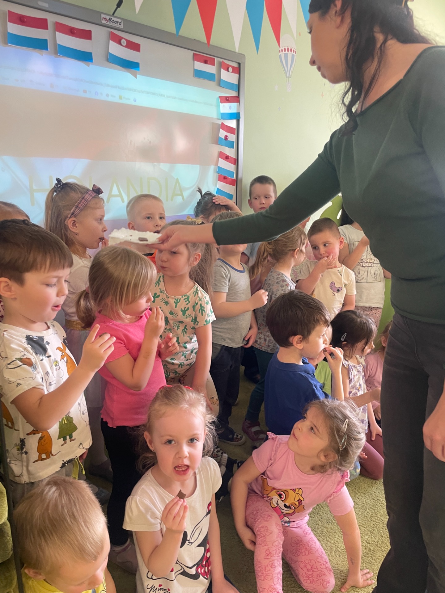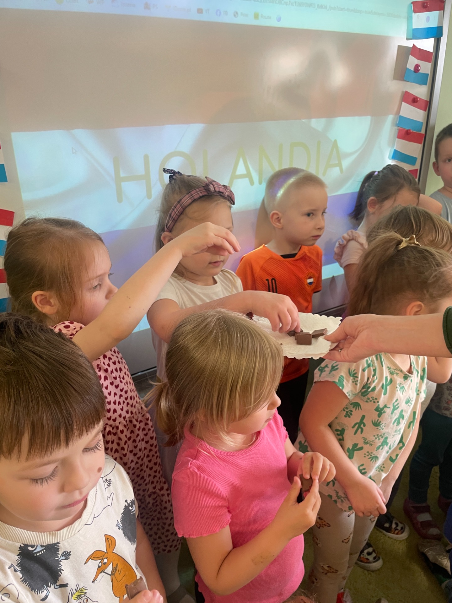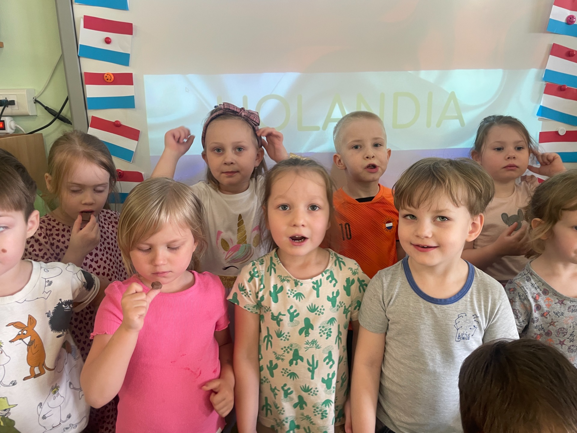 Dzisiaj Podróżnicy odwiedzili niderlandzki kraj jakim jest Holandia. Przedszkolaki dowiedziały się z czego słynie ten kraj, poznały jego tradycyjny strój ludowy oraz posłuchały jak brzmi język holenderski. Podczas pokazu slajdów dzieci zachwycały się polami pełnymi tulipanów, zabytkowymi i nowoczesnymi wiatrakami, holenderskim mlekiem oraz serami, a także pięknymi uliczkami Amsterdamu. Podróż po Holandii umilały zagadki, które jednocześnie były zadaniami do wykonania. Dzieci mogły degustować ser, wybrać się na wycieczkę rowerową, a także eksperymentowały z mlekiem tworząc "kolorowy mleczny wir". Zwieńczeniem zajęć było wykonanie wiatraków oraz degustacja czekolady z której = Holandia słynie.