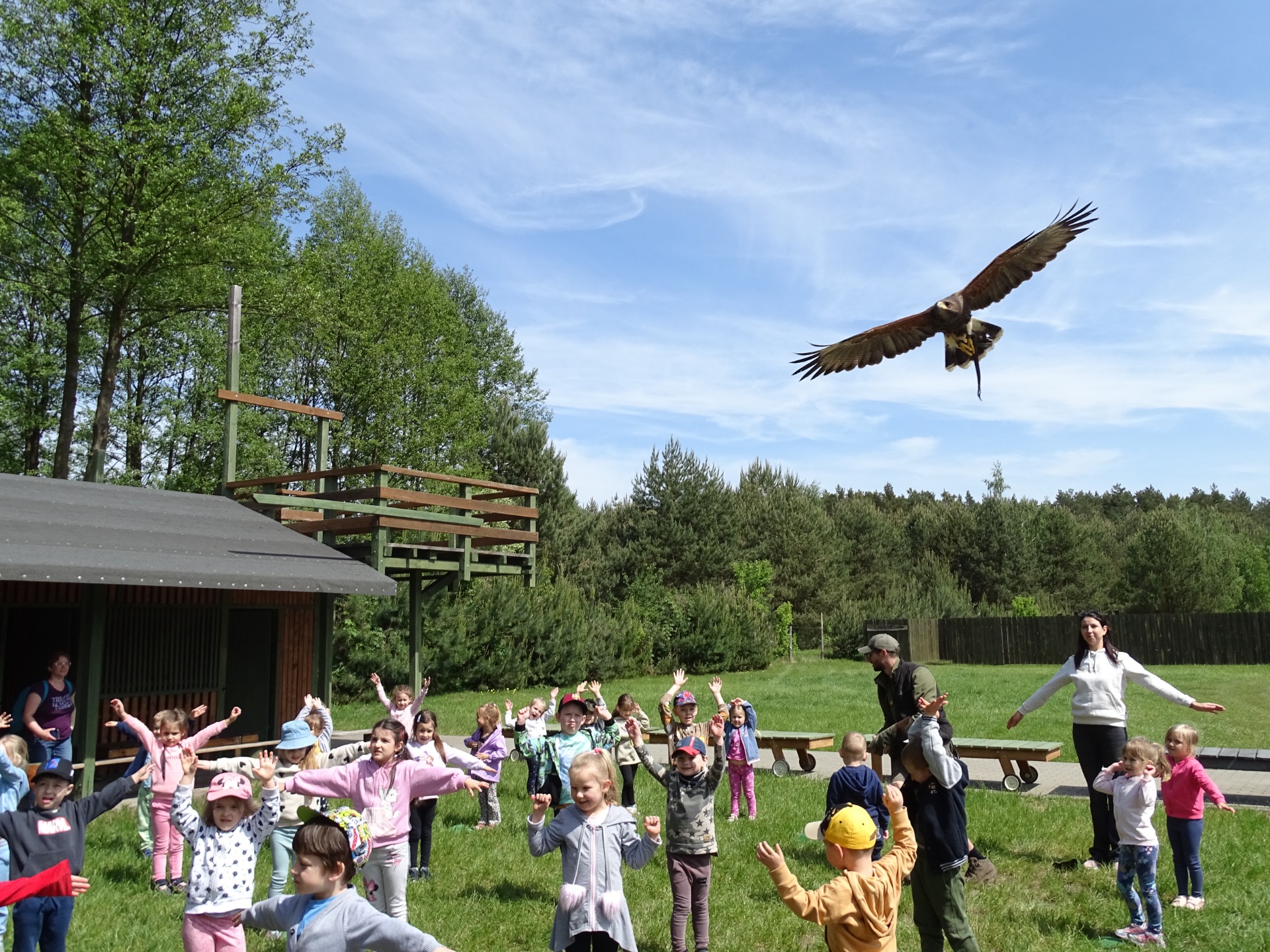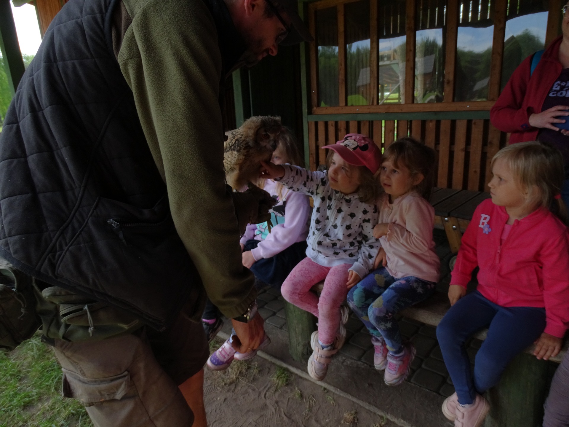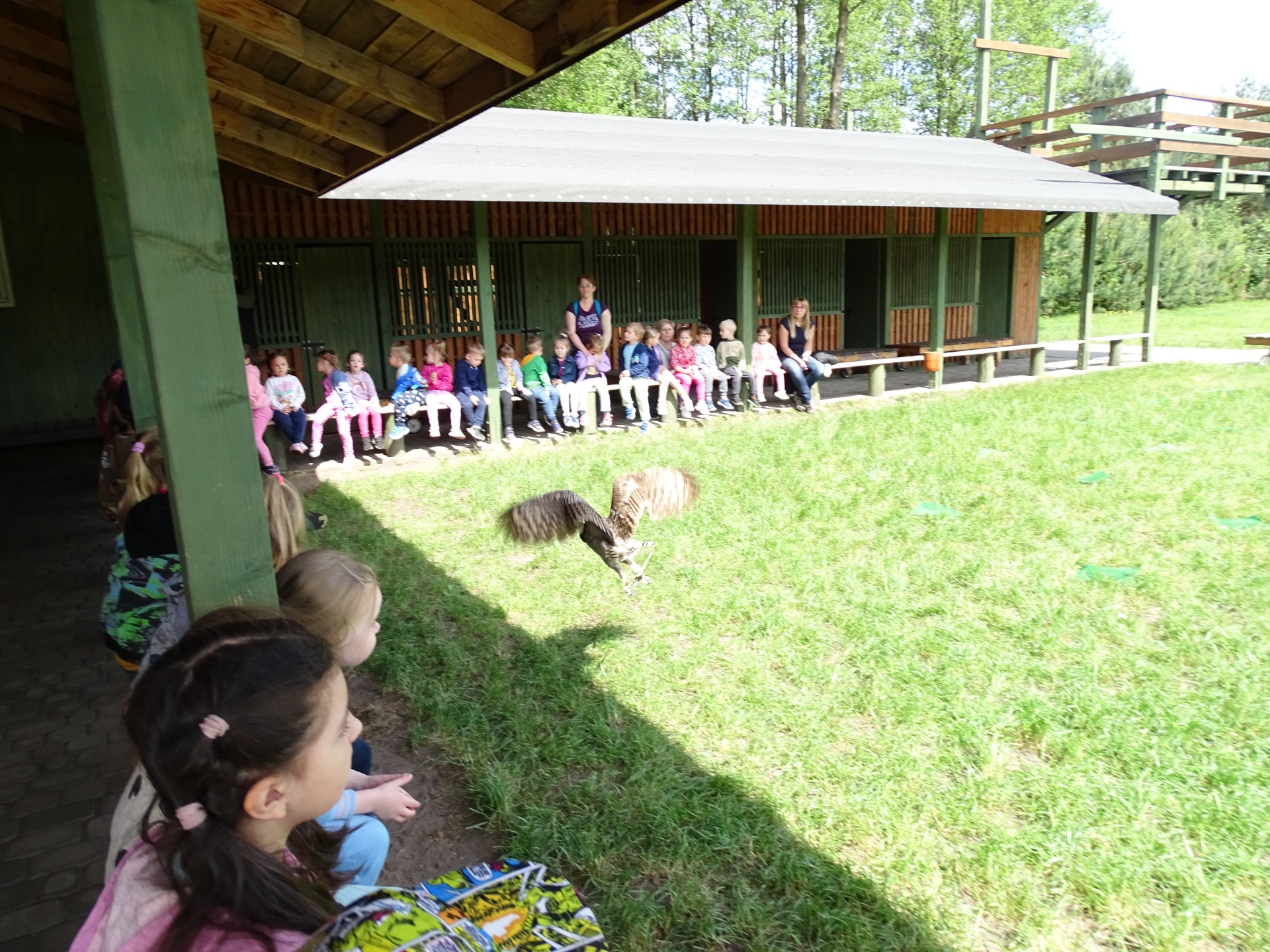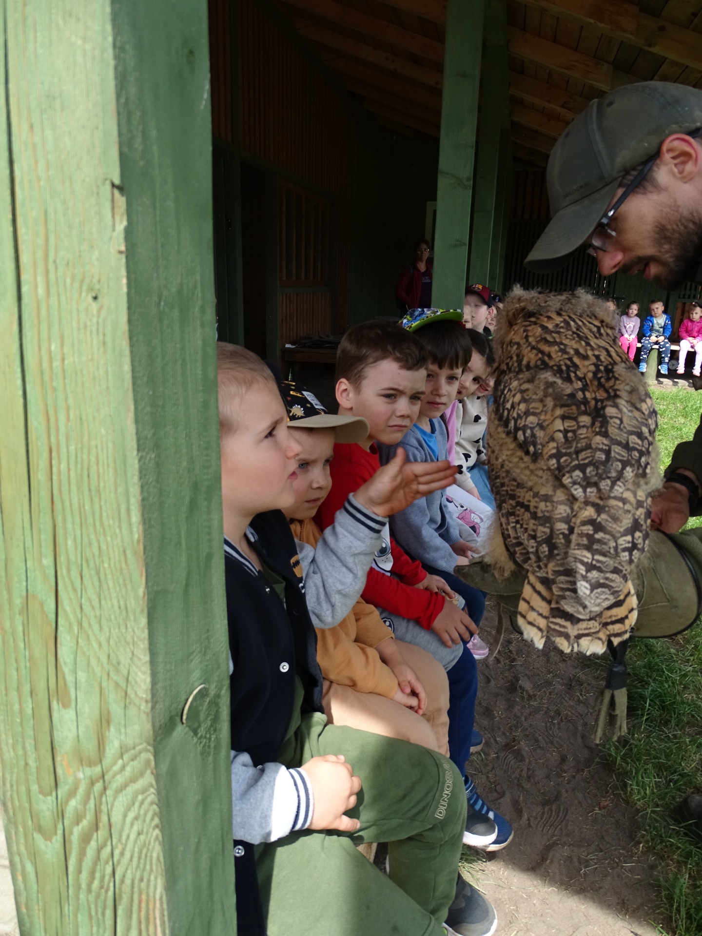 W dniu 8 maja Podróżnicy wybrali się na całodniową wycieczkę do Frajdalandii- miejsca pełnego zabaw, przygód i zwierzątek, a wszystko to na świeżym powietrzu. Przedszkolaki podziwiały różne okazy ptaków: sowy, jastrzębia i sokoła. W czasie pokazu dzieci mogły sprawdzić jakie milutkie jest upierzenie sów, oraz wcieliły się w drzewa leśne pośród których latały ptaki. Nie zabrakło również wizyty w również mini zoo, gdzie dzieci spotkały w nim wielbłądy, kucyka (który może ugryźć ;)), lamy i owce. Mogli również wejść do lam i owieczek i je nakarmić. Na miejscu były również dmuchańce, trampoliny i park linowy. Wszystkie przedszkolaki wracając do przedszkola były zachwycone wycieczką :)