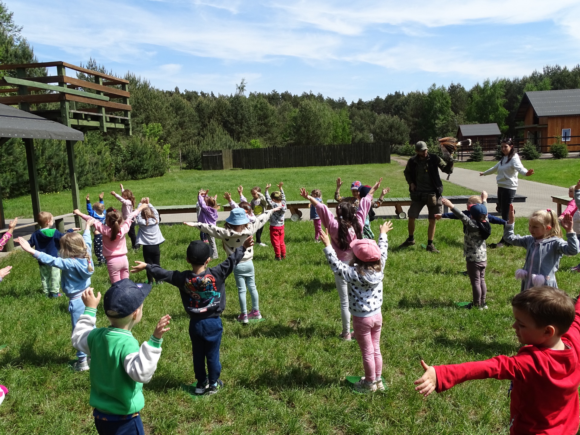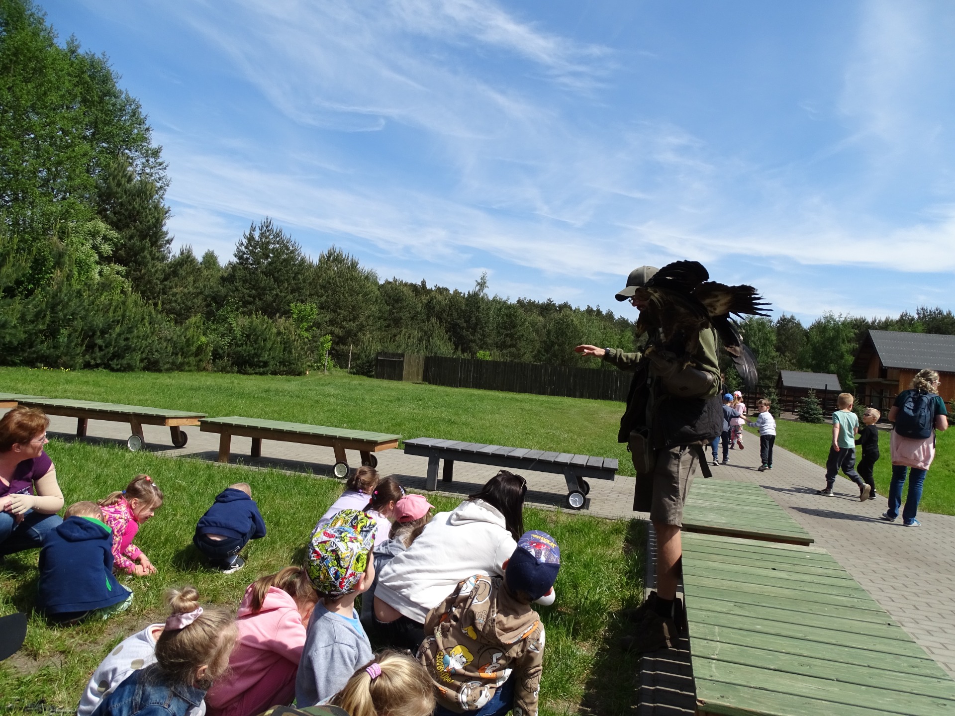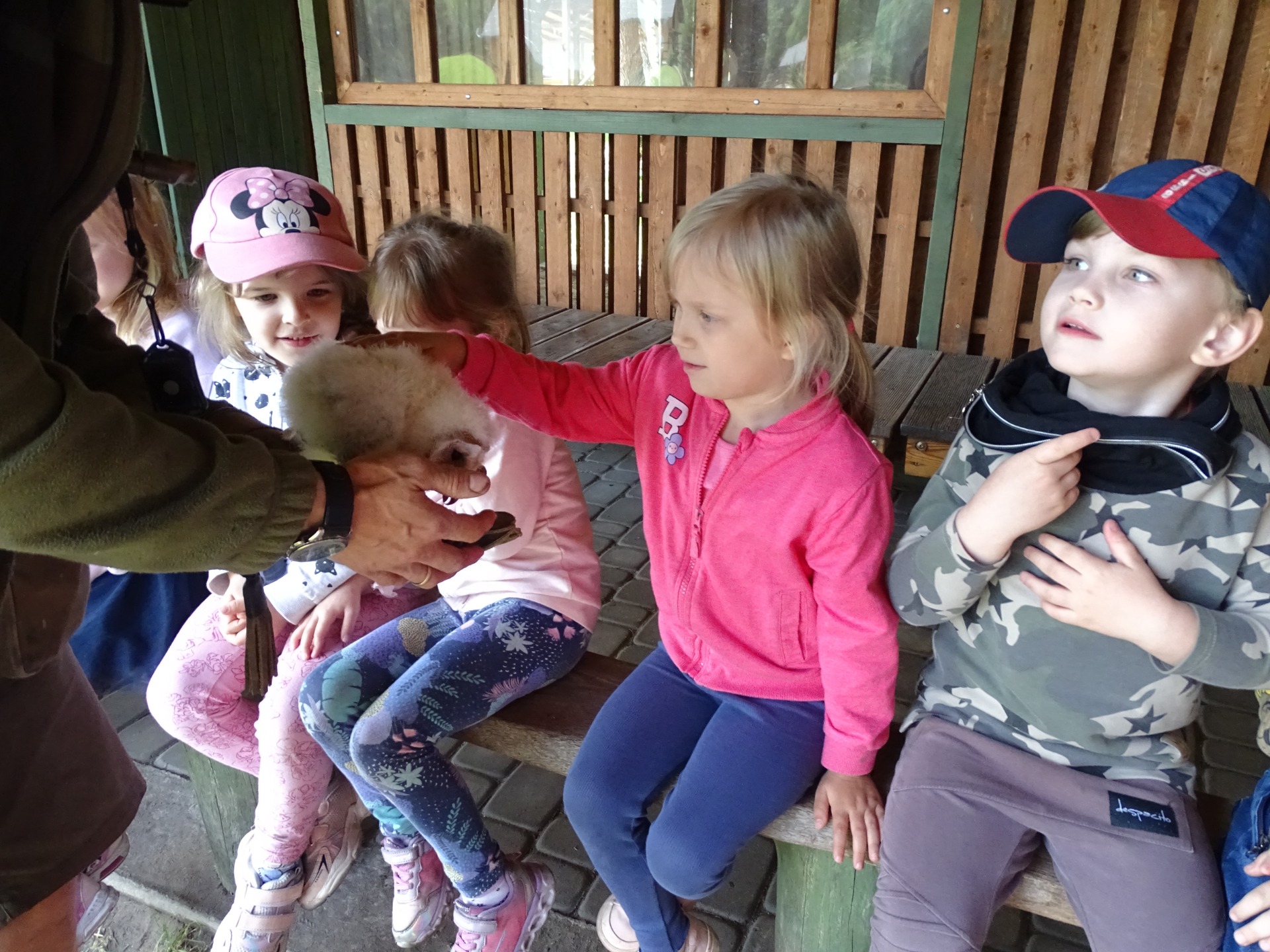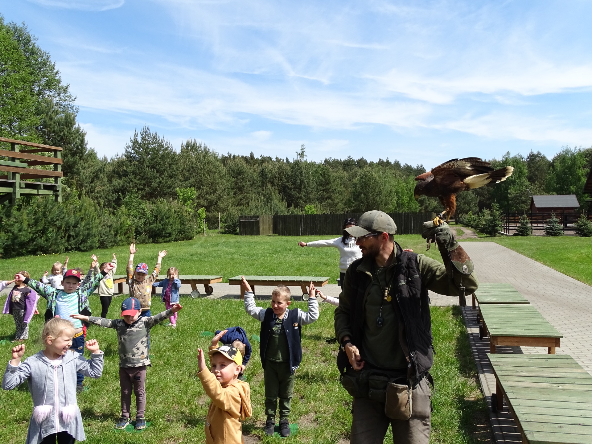 W dniu 8 maja Podróżnicy wybrali się na całodniową wycieczkę do Frajdalandii- miejsca pełnego zabaw, przygód i zwierzątek, a wszystko to na świeżym powietrzu. Przedszkolaki podziwiały różne okazy ptaków: sowy, jastrzębia i sokoła. W czasie pokazu dzieci mogły sprawdzić jakie milutkie jest upierzenie sów, oraz wcieliły się w drzewa leśne pośród których latały ptaki. Nie zabrakło również wizyty w również mini zoo, gdzie dzieci spotkały w nim wielbłądy, kucyka (który może ugryźć ;)), lamy i owce. Mogli również wejść do lam i owieczek i je nakarmić. Na miejscu były również dmuchańce, trampoliny i park linowy. Wszystkie przedszkolaki wracając do przedszkola były zachwycone wycieczką :)