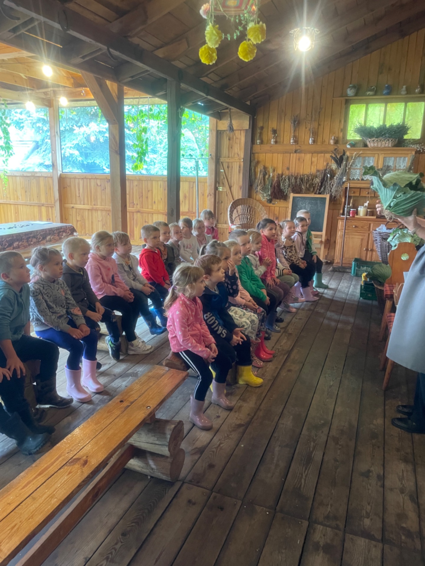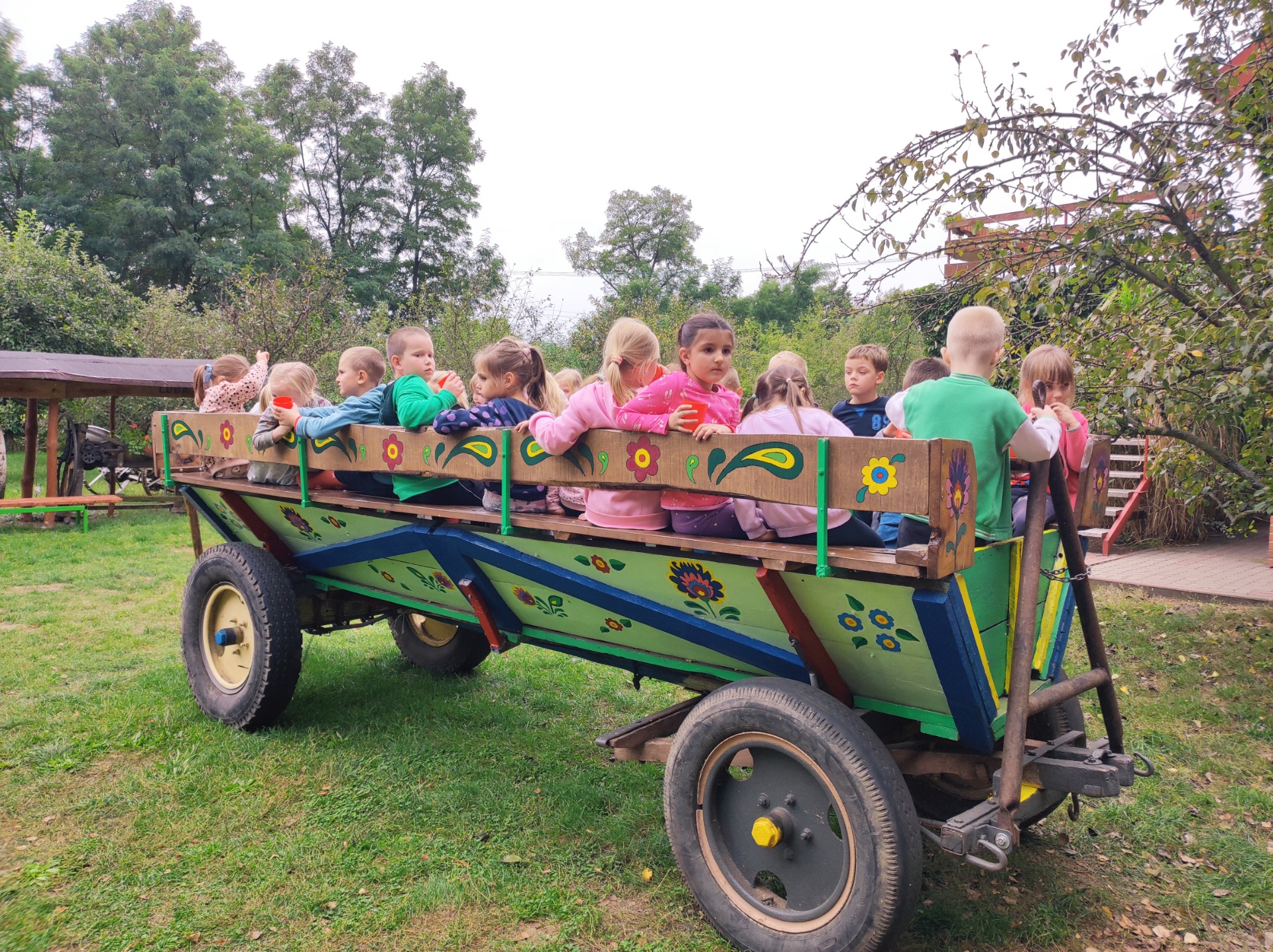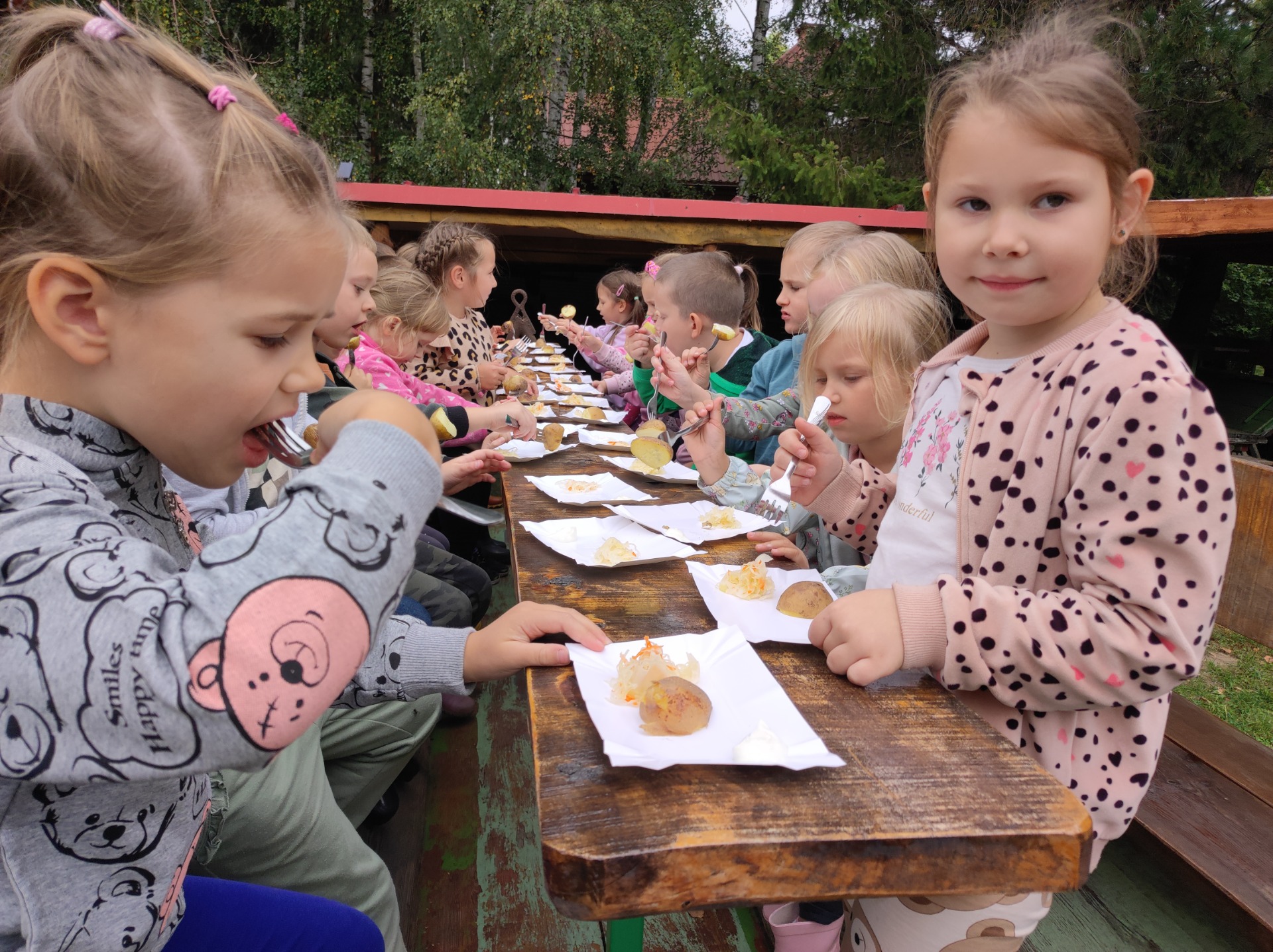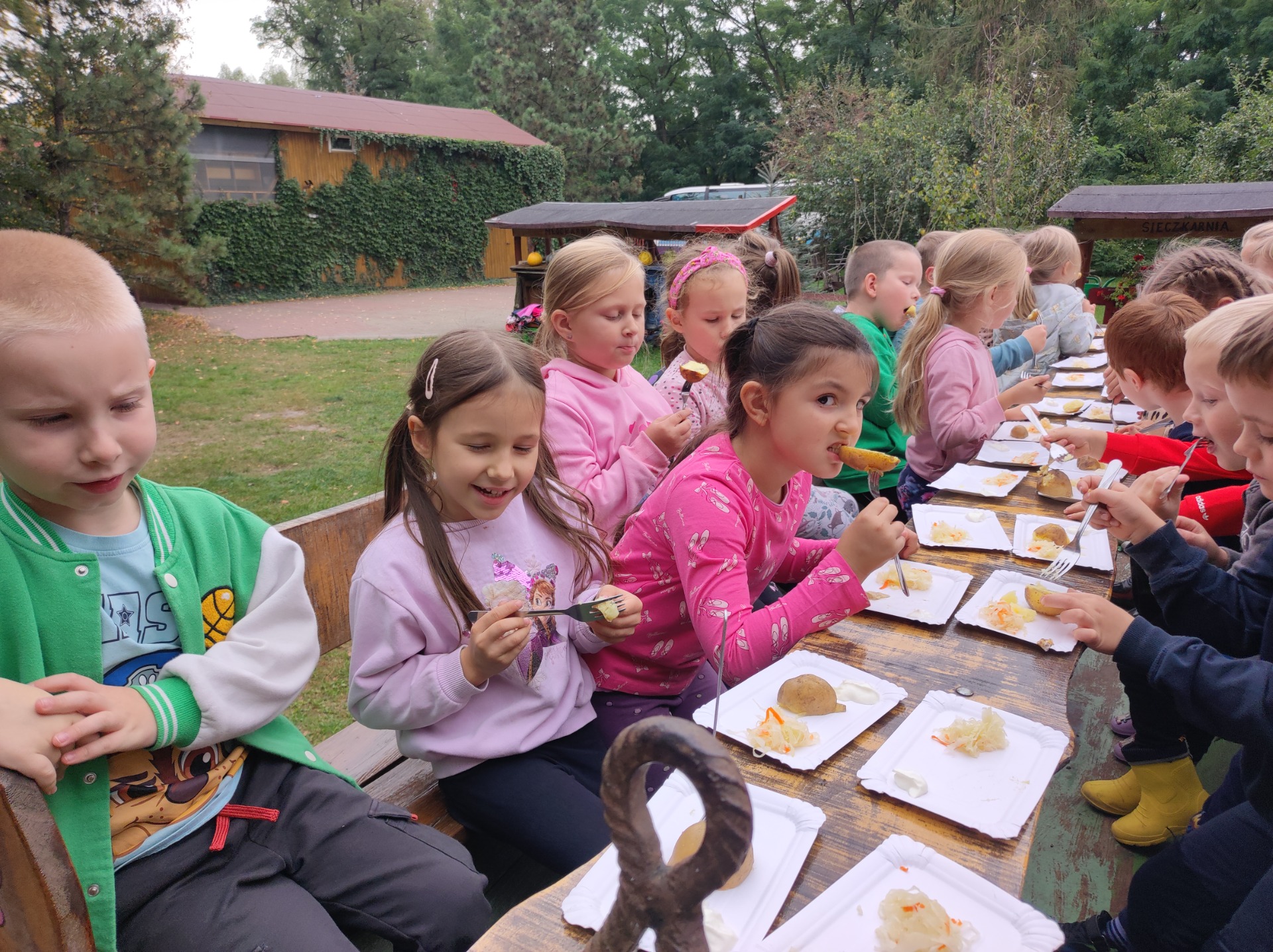 Wykopki i kiszenie kapusty – to dopiero była atrakcja dla Podróżników, którzy wybrali się 26 września do gospodarstwa agroturystycznego w Konarzewie. Gospodyni opowiadała i pokazywała, co się dzieje na wsi jesienią. Rozmawiała o ziemniakach, które doskonale wszyscy znają. Mówiła im o ich pochodzeniu, rodzajach, a potem zabrała na pole, by zobaczyły jak wyglądają wykopki. Dzieci dostały koszyki i wózki, do których same zbierały znalezione w ziemi ziemniaki. Później poznały, jak się szatkuje i jak się kisi kapustę. Mogły same wskoczyć do beczki i ją ugniatać! Na zakończenie dzieci zjadły surówkę z kapusty z marchewką i sosem czosnkowym oraz pieczone w ognisku ziemniaki.
