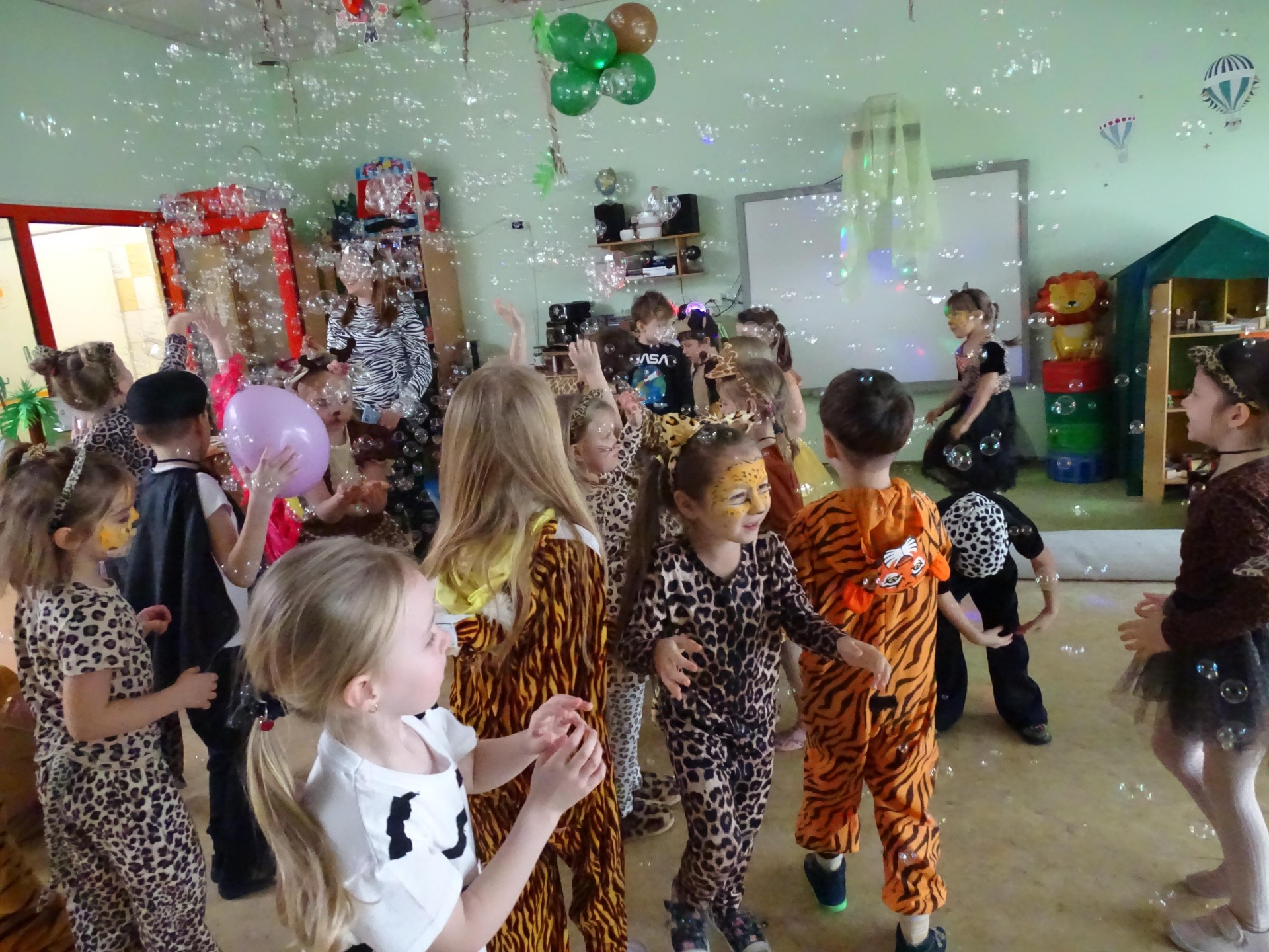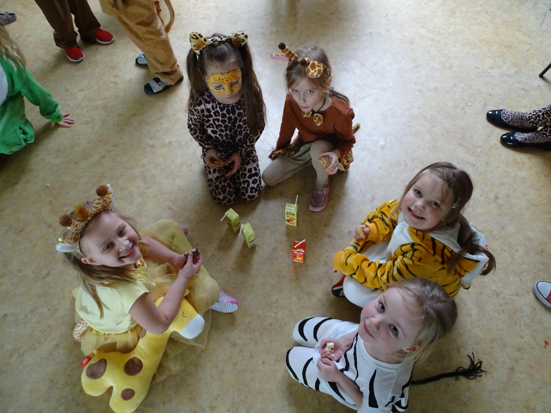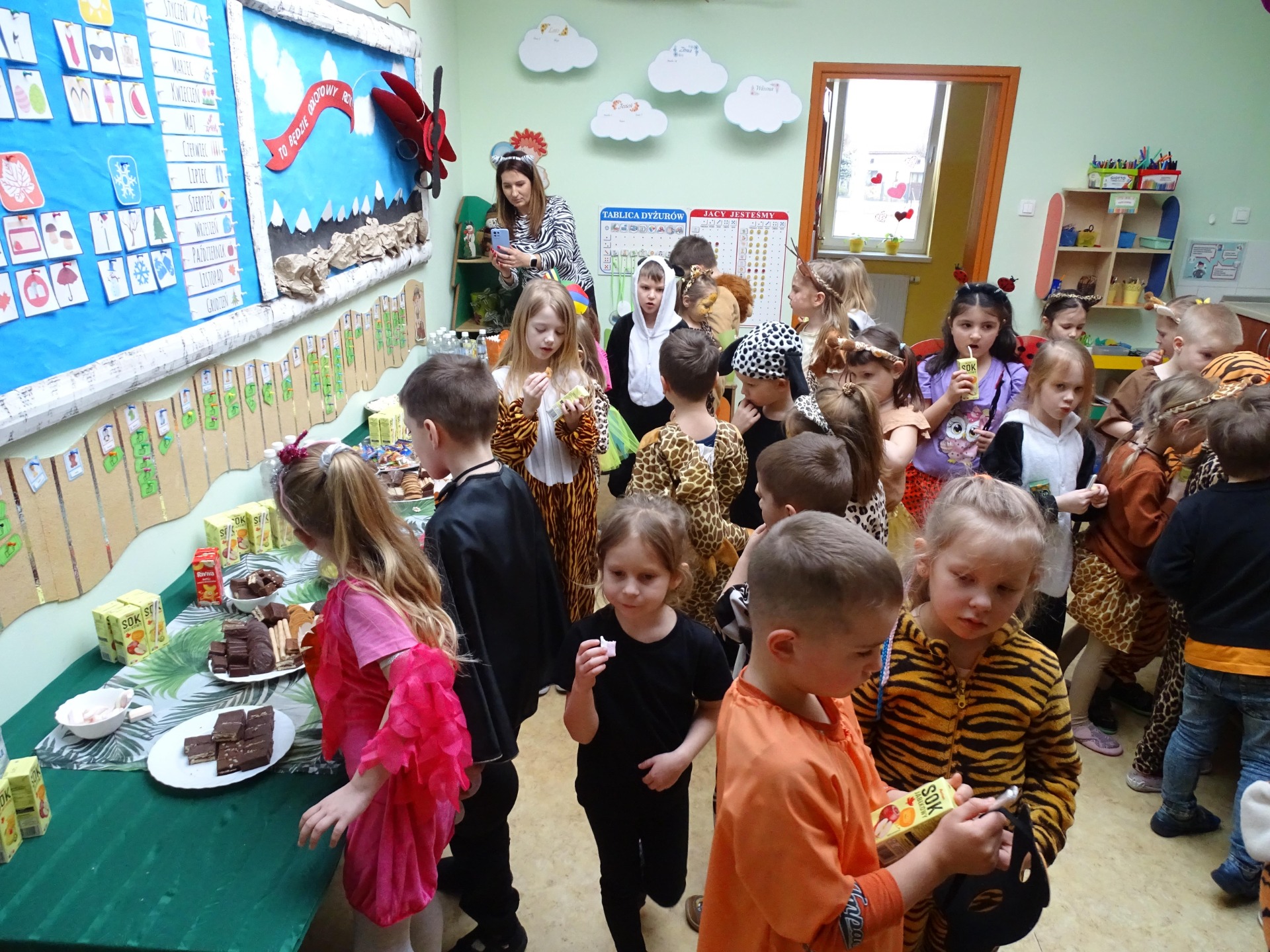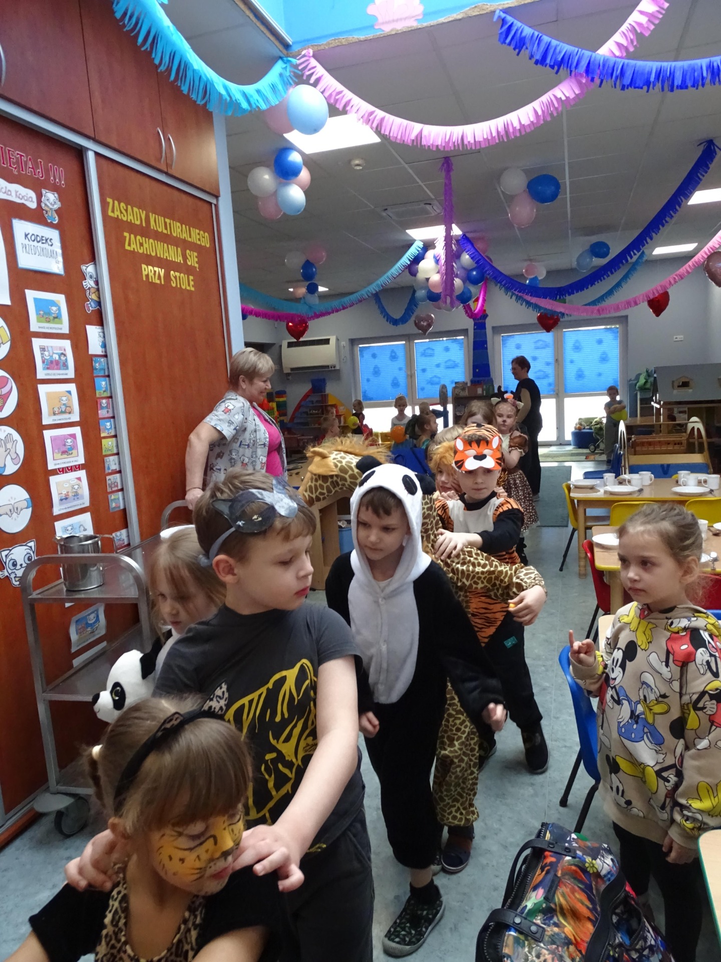 12 lutego dwie najstarsze grupy przedszkolne imprezowały na balu karnawałowym . W tym roku tematem przewodnim była dżungla, dlatego parkiet zagęścił się od obecności dzikich zwierząt. Pojawiły się min.: lwy , pantery, flaming, żyrafa, papuga, motyl i inne. Od samego początku energia zabawowa dopisywała. Dzieci chętnie pląsały w rytm znanych i lubianych utworów. Nie zabrakło również konkursów, min. podawania kokosa w rzędach, przeciskania się przez pajęczą sieć, czy rozpoznawania odgłosów dzikich zwierząt. Dzieci zaprezentowały swoje piękne stroje na zielonym dywanie, a także udały się w kolorowy korowód po innych, przedszkolnych salach. Nie zabrakło również słodkiego poczęstunku i małych drobiazgów dla przedszkolaków. Serdecznie dziękujemy rodzicom za pomoc w przygotowaniu imprezy 😀.