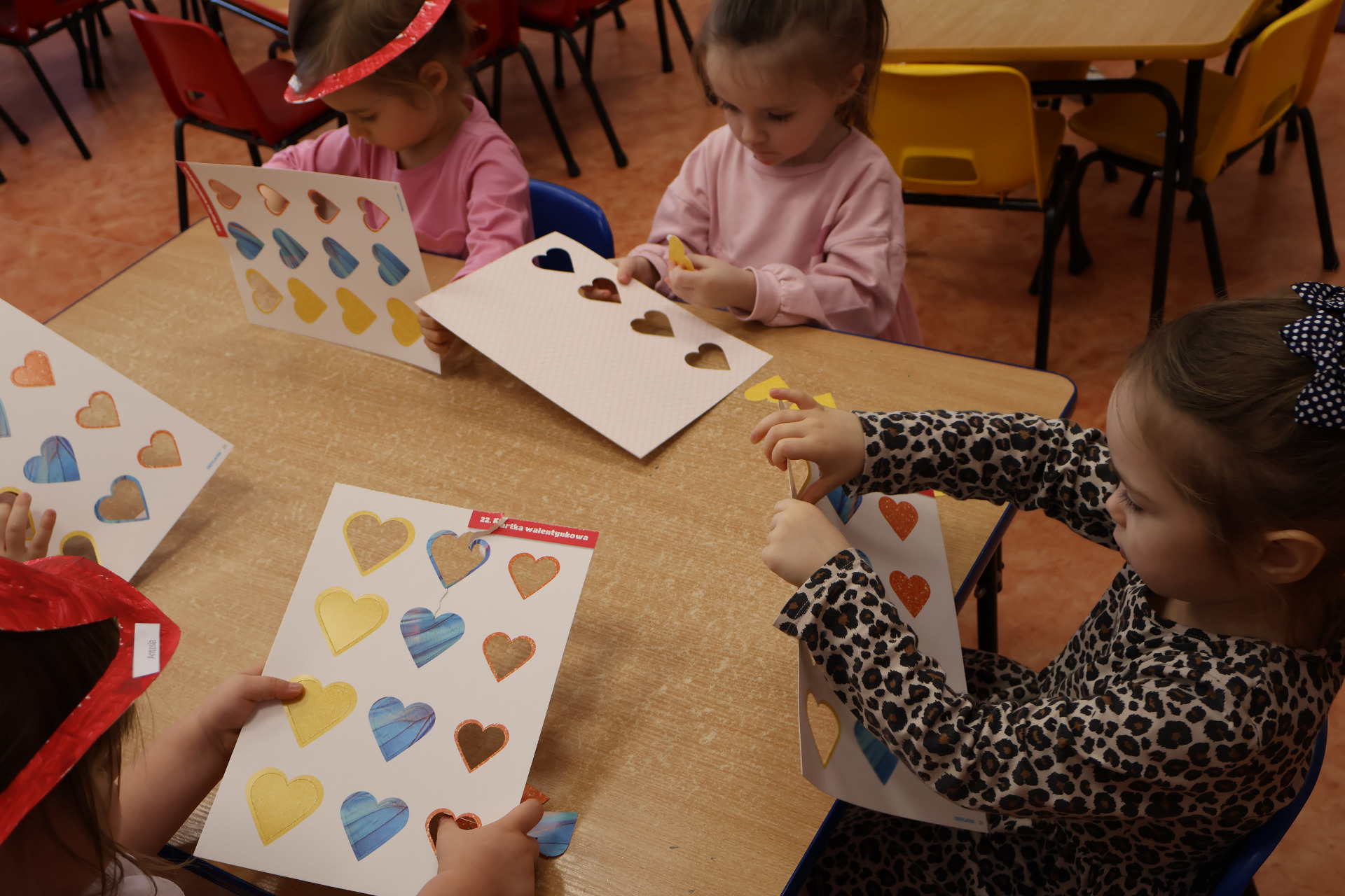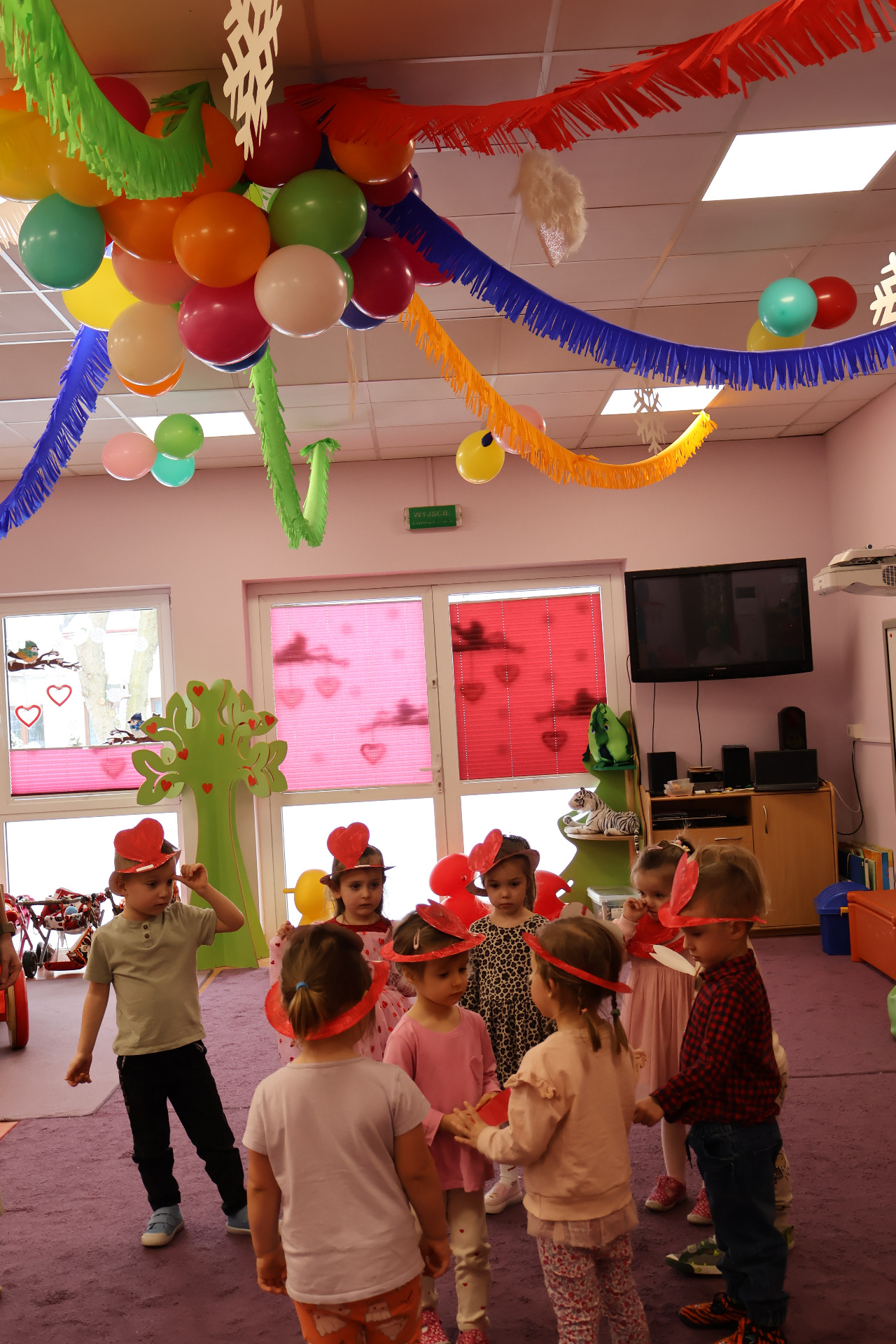 14 lutego obchodziliśmy w naszym przedszkolu „Dzień serduszka”. Z tej okazji udekorowaliśmy naszą salę czerwonymi serduszkami. Tego dnia dzieci wzięły udział w licznych zabawach związanych z walentynkami m.in. szukały drugiej połówki serca, rozwiązywały zagadki dotyczące słynnych bajkowych par. W pracach plastycznych motywem przewodnim były czerwone serca. Miłym akcentem był także drobny słodki upominek. Okazów sympatii przez cały dzień w przedszkolu nie brakowało. Na zakończenie wspólnie zrobiliśmy pamiątkowe zdjęcie.