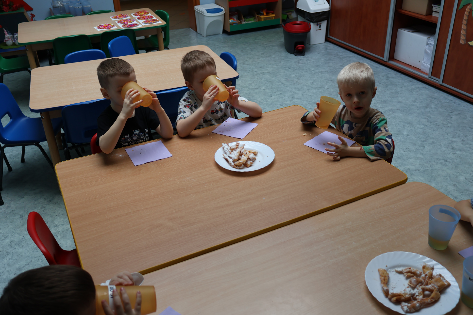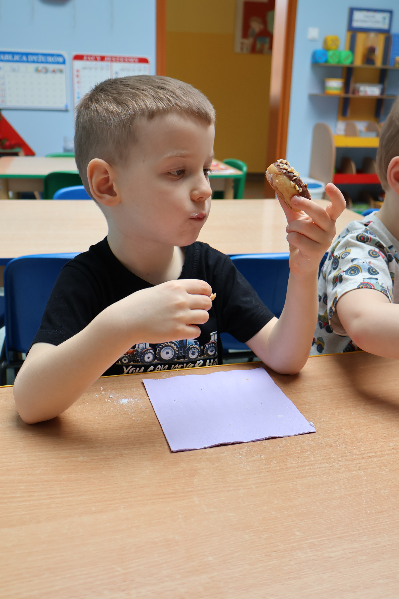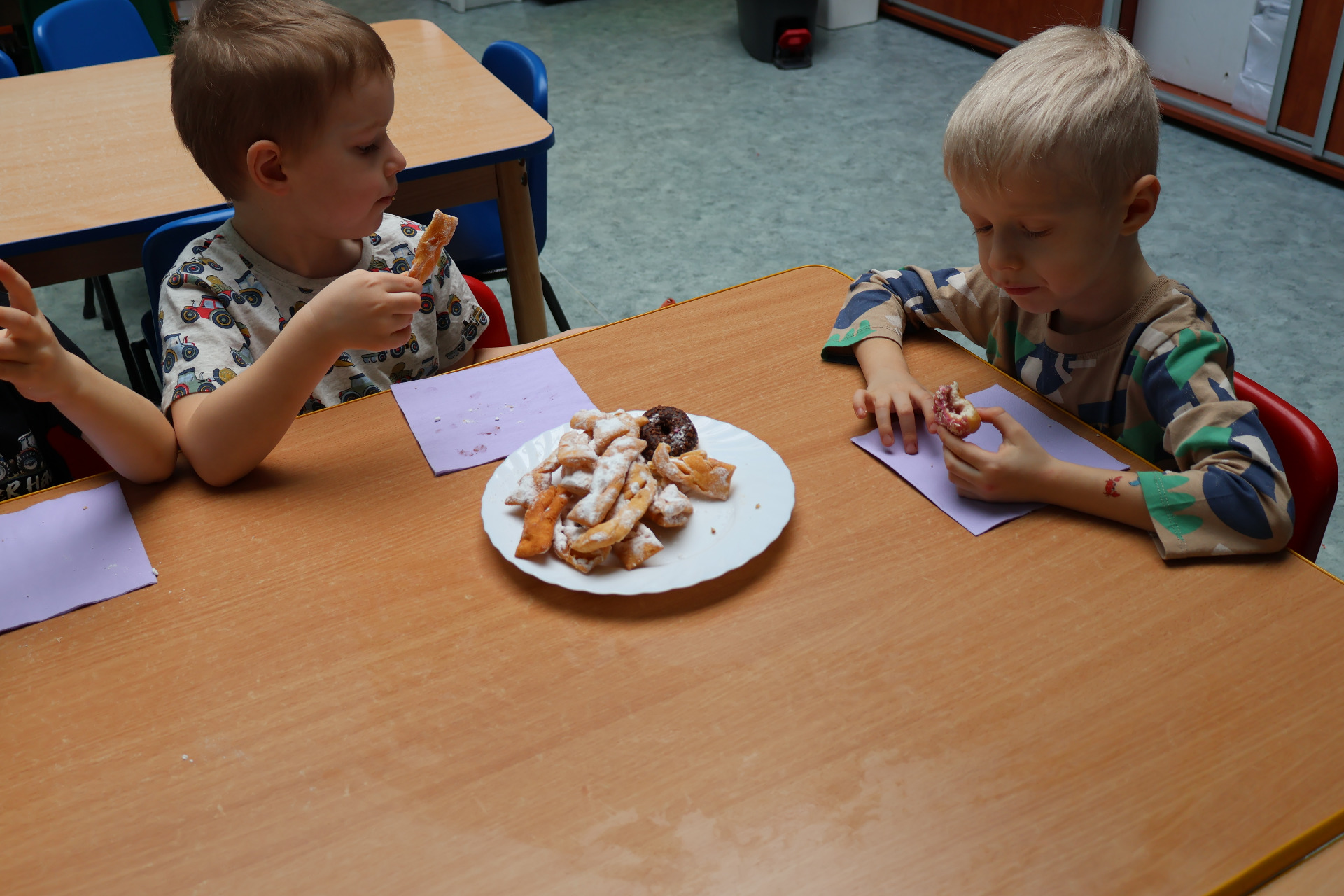 W czwartek 27.02.2025 r. Piraci obchodzili słodkie święto- Tłusty Czwartek. Z tej okazji dzieci obejrzały krótki film edukacyjny o tradycjach związanych z tym świętem, bawiły się w "pączkowe" zawody ruchowe oraz wykonały własnego "pączka" z pomalowanego koła i plasteliny. Na zakończenie wszystkie przedszkolaki zjadły słodki poczęstunek- pyszne pączki i faworki.