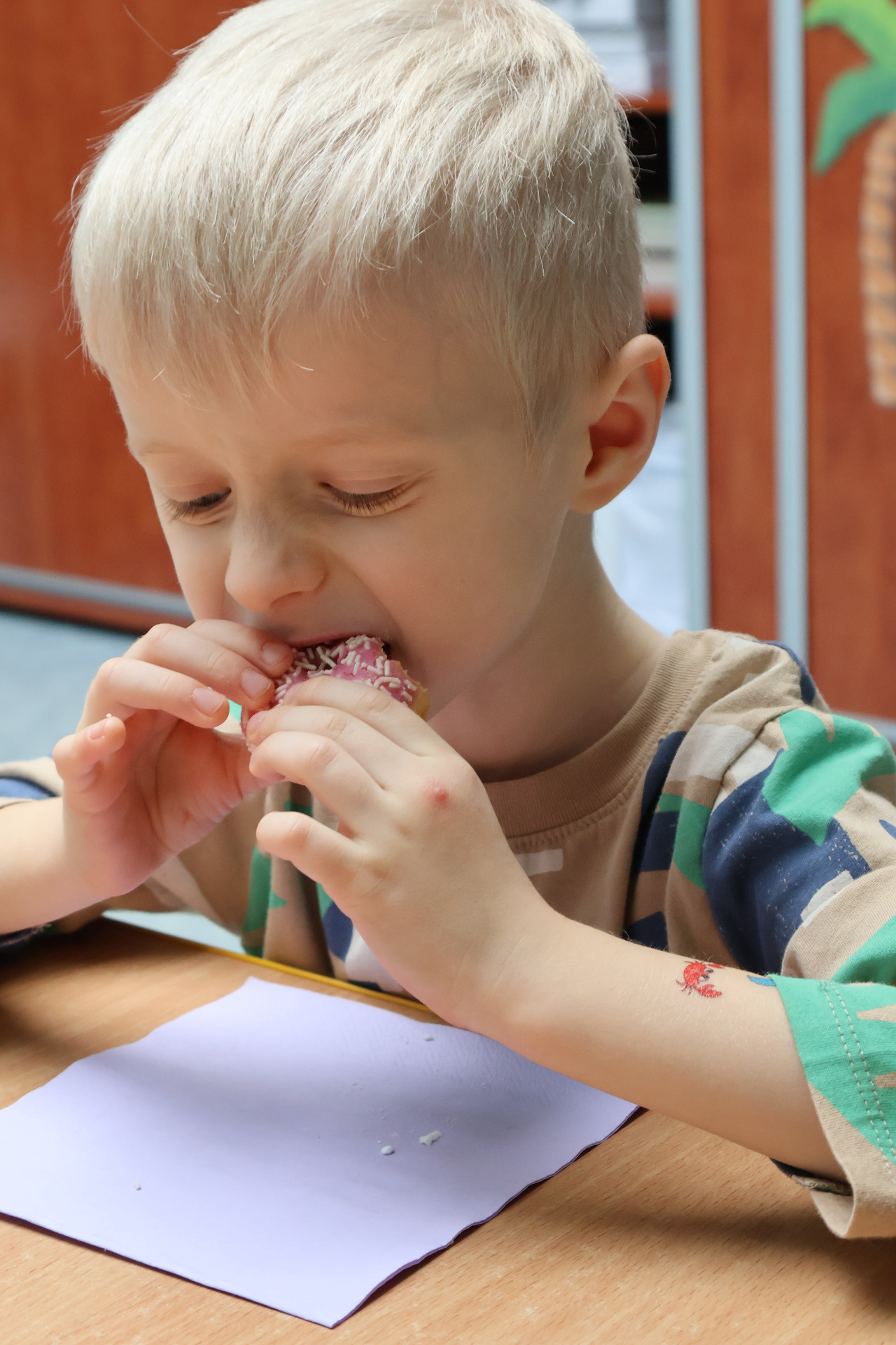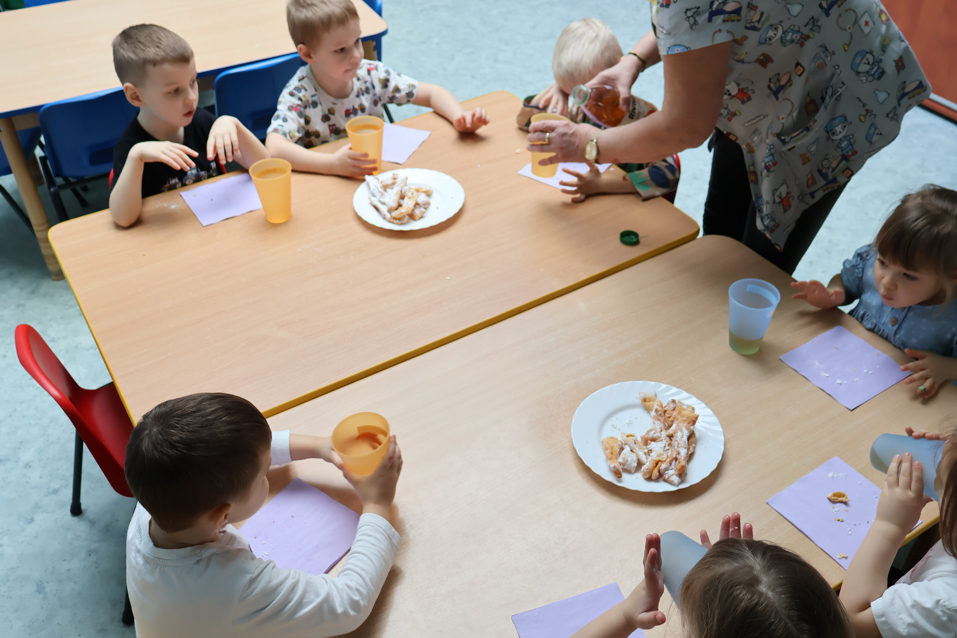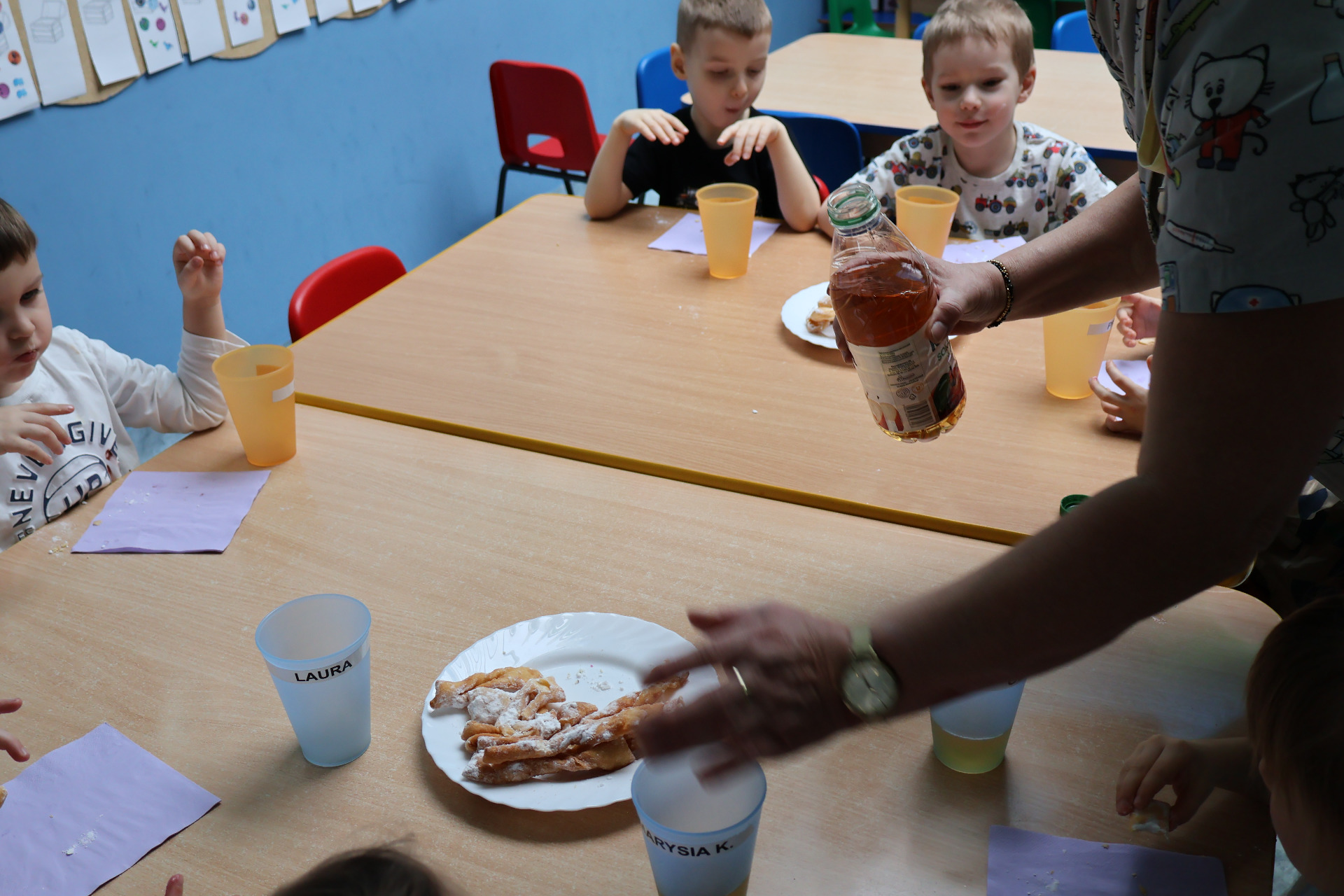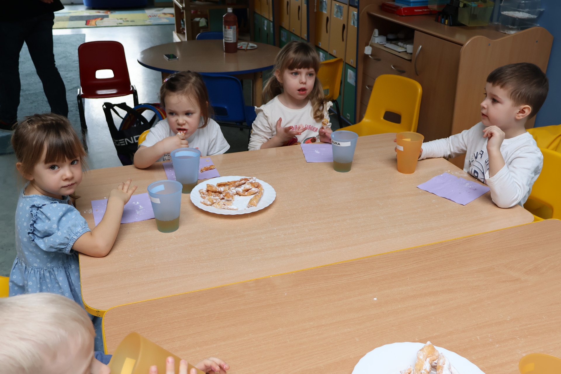 W czwartek 27.02.2025 r. Piraci obchodzili słodkie święto- Tłusty Czwartek. Z tej okazji dzieci obejrzały krótki film edukacyjny o tradycjach związanych z tym świętem, bawiły się w "pączkowe" zawody ruchowe oraz wykonały własnego "pączka" z pomalowanego koła i plasteliny. Na zakończenie wszystkie przedszkolaki zjadły słodki poczęstunek- pyszne pączki i faworki.