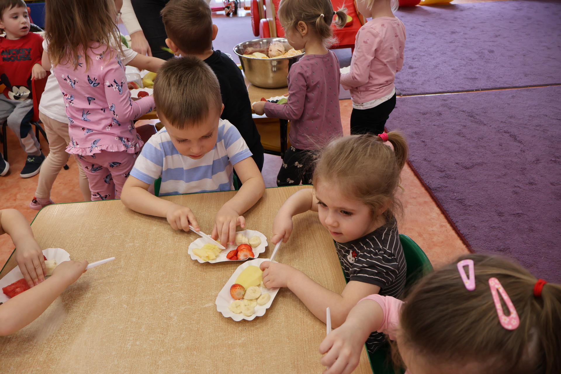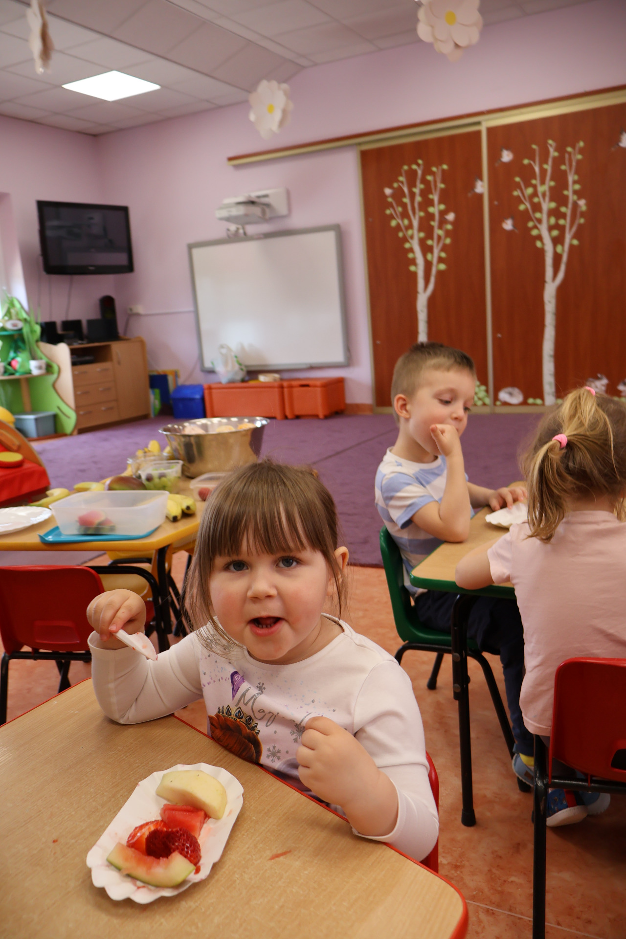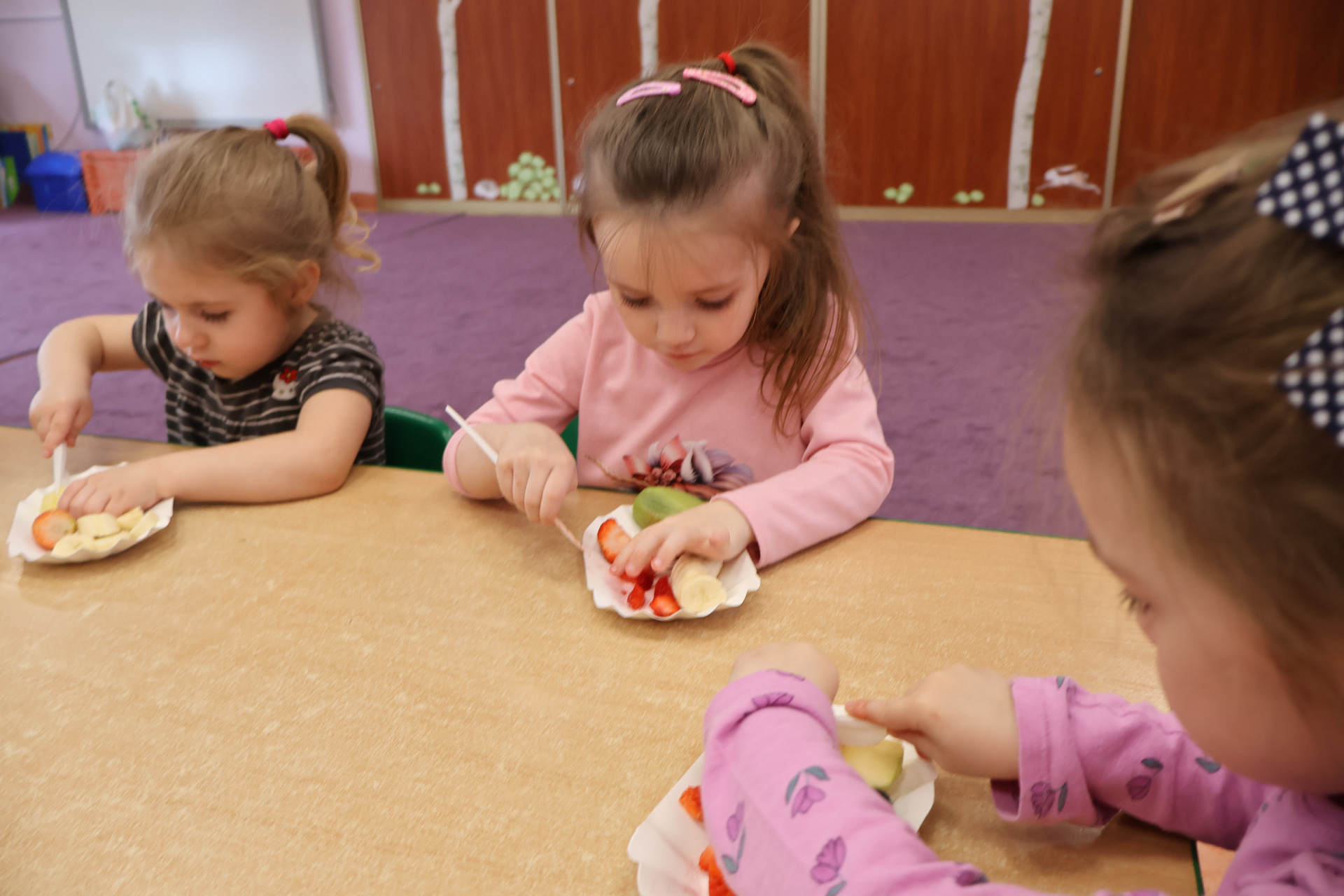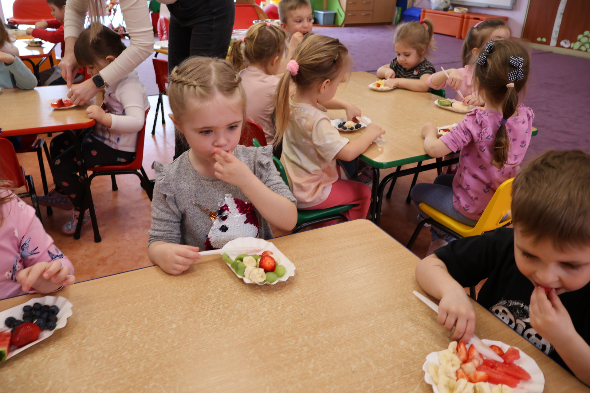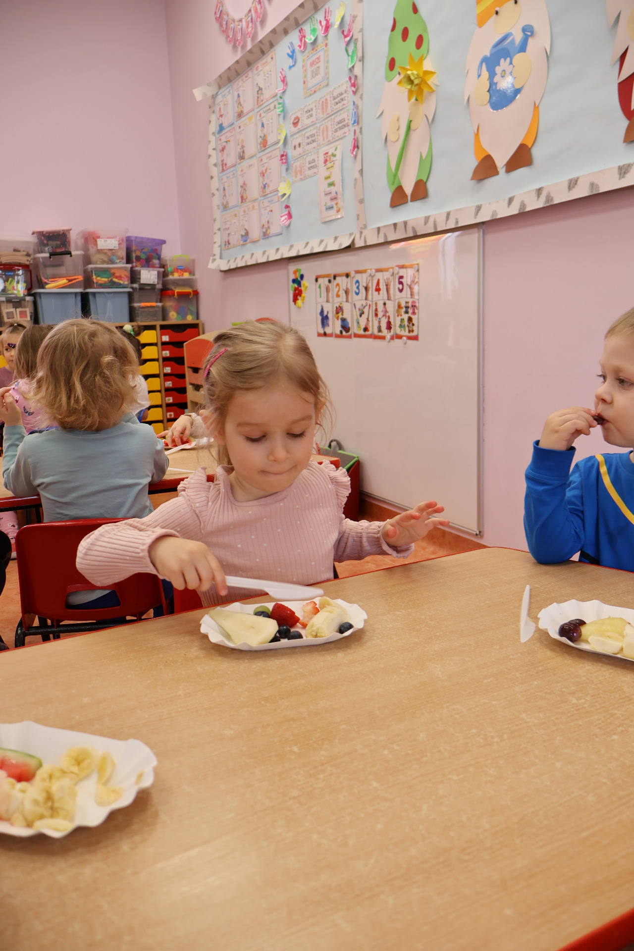 Nasze kochane przedszkolaki przez ostatni czas zdobywały wiedzę o zdrowym odżywianiu, witaminach oraz o tym jak dbać o swoje zdrowie. Podczas zajęć poznały piramidę zdrowia, dowiedziały się jak powinien wyglądać "zdrowy talerz" a także uczestniczyły w wielu zabawach związanych z tematyką zdrowia. Na koniec wykonały smaczną sałatkę owocową oraz pyszny sok.
