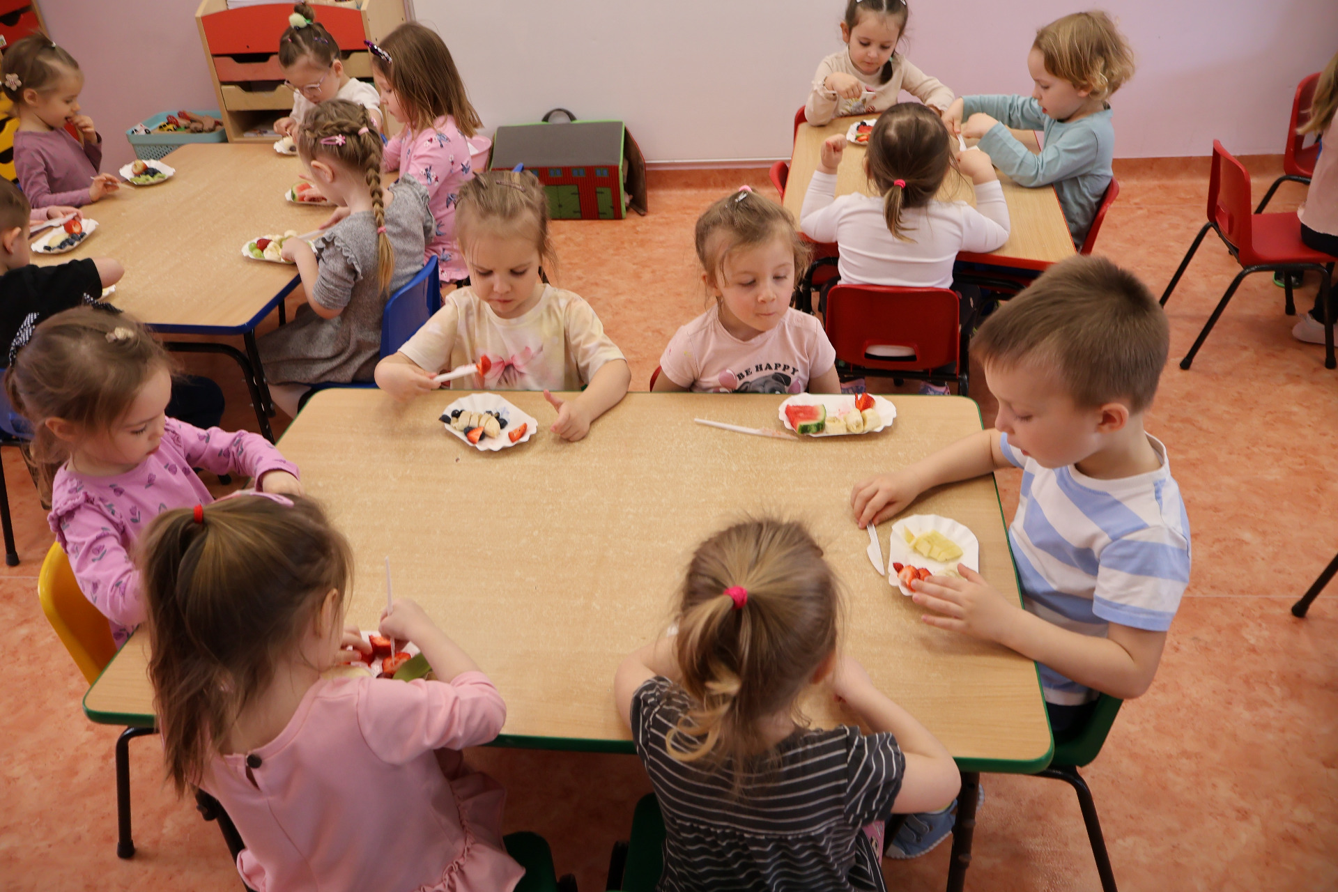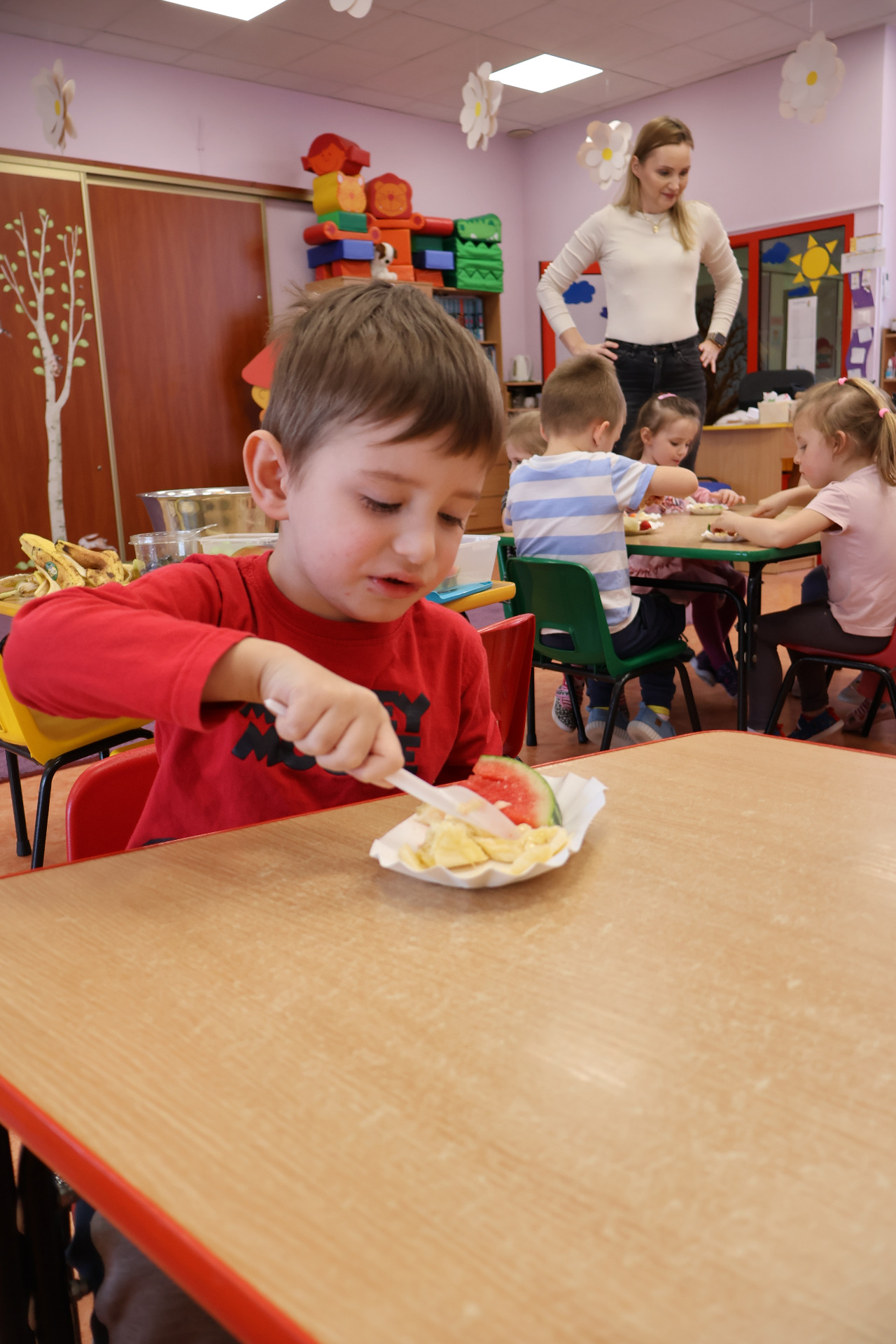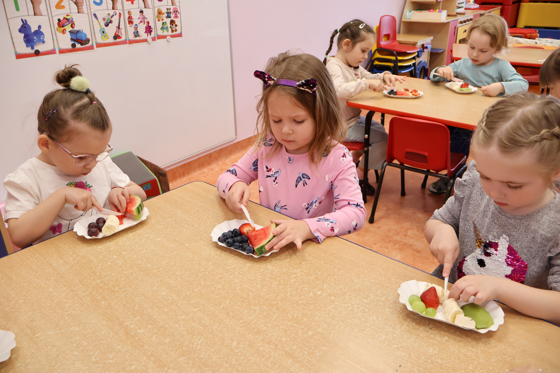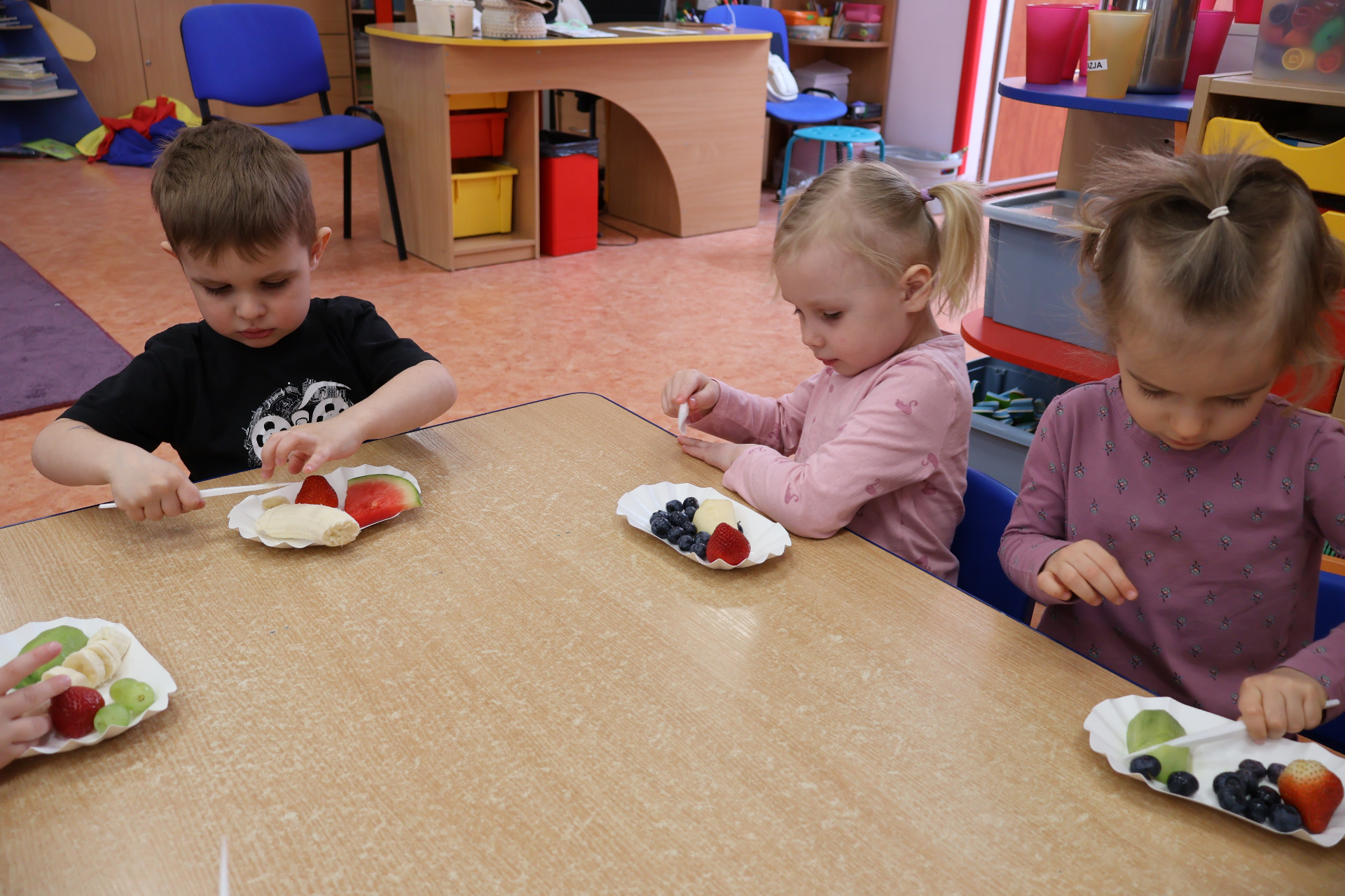 Nasze kochane przedszkolaki przez ostatni czas zdobywały wiedzę o zdrowym odżywianiu, witaminach oraz o tym jak dbać o swoje zdrowie. Podczas zajęć poznały piramidę zdrowia, dowiedziały się jak powinien wyglądać "zdrowy talerz" a także uczestniczyły w wielu zabawach związanych z tematyką zdrowia. Na koniec wykonały smaczną sałatkę owocową oraz pyszny sok.