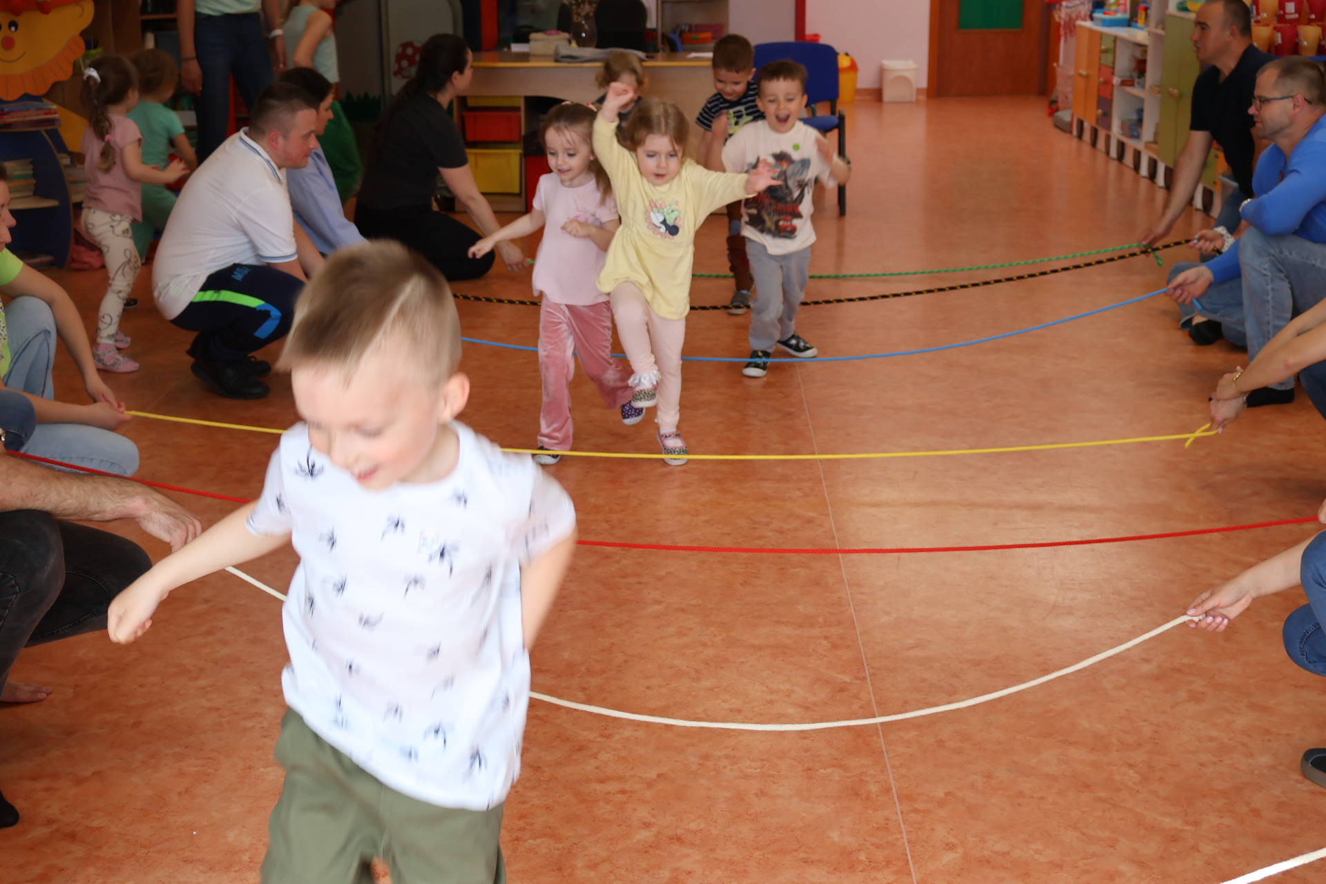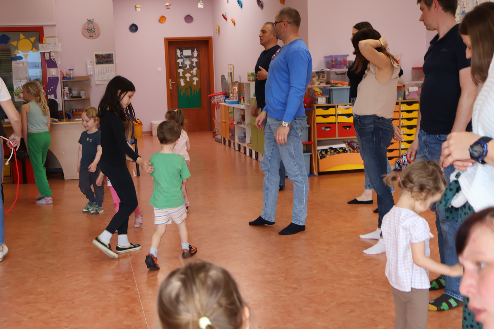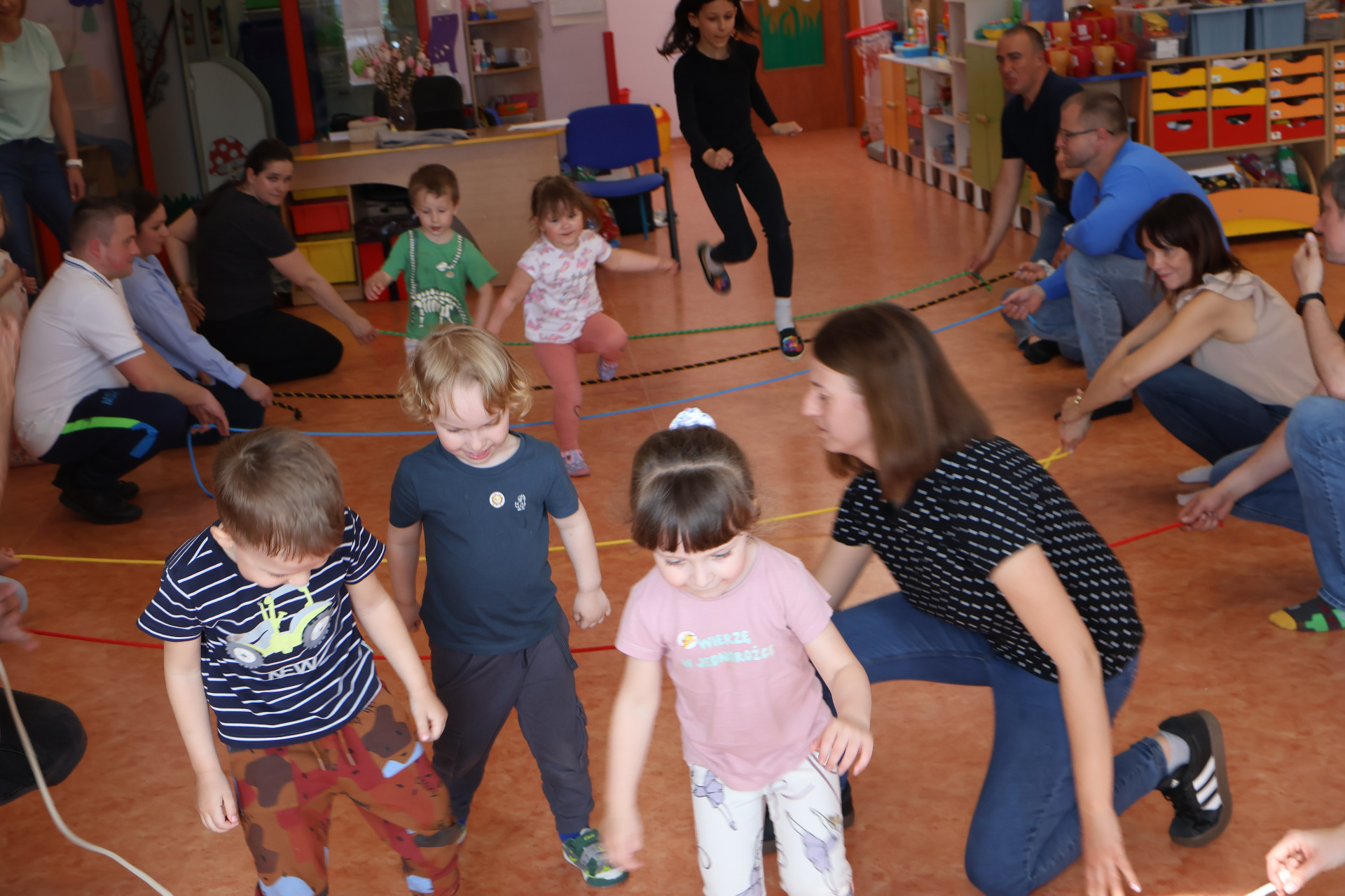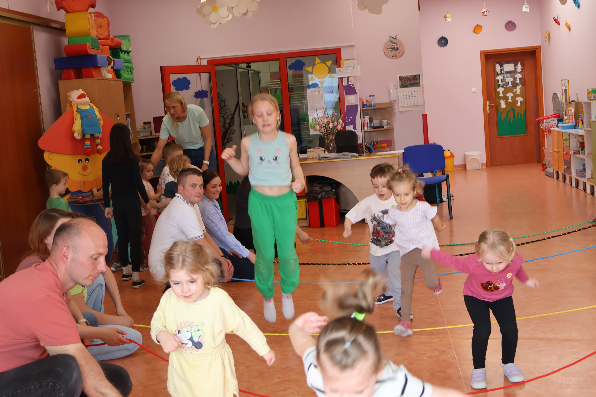 W czwartek 24.04.2025r., w grupie "Krasnali " odbyło się zajęcie otwarte z udziałem rodziców. Zajęcia otwarte stanowią wspaniałą okazję do integracji wszystkich rodziców dzieci z tej samej grupy przedszkolnej, a także wzmacniania więzi pomiędzy dzieckiem, a rodzicem. Dzieci od samego rana z wielką niecierpliwością oczekiwały wizyty bliskich. W czasie zajęć wspólnie z rodzicami/rodzeństwem uczestniczyły w różnego rodzaju zabawach ruchowych. Zabawy i radości było mnóstwo, a najszczęśliwsze tego dnia były dzieci, które mogły z rodzicami i innymi bliskimi przyjemnie spędzić czas w przedszkolu.