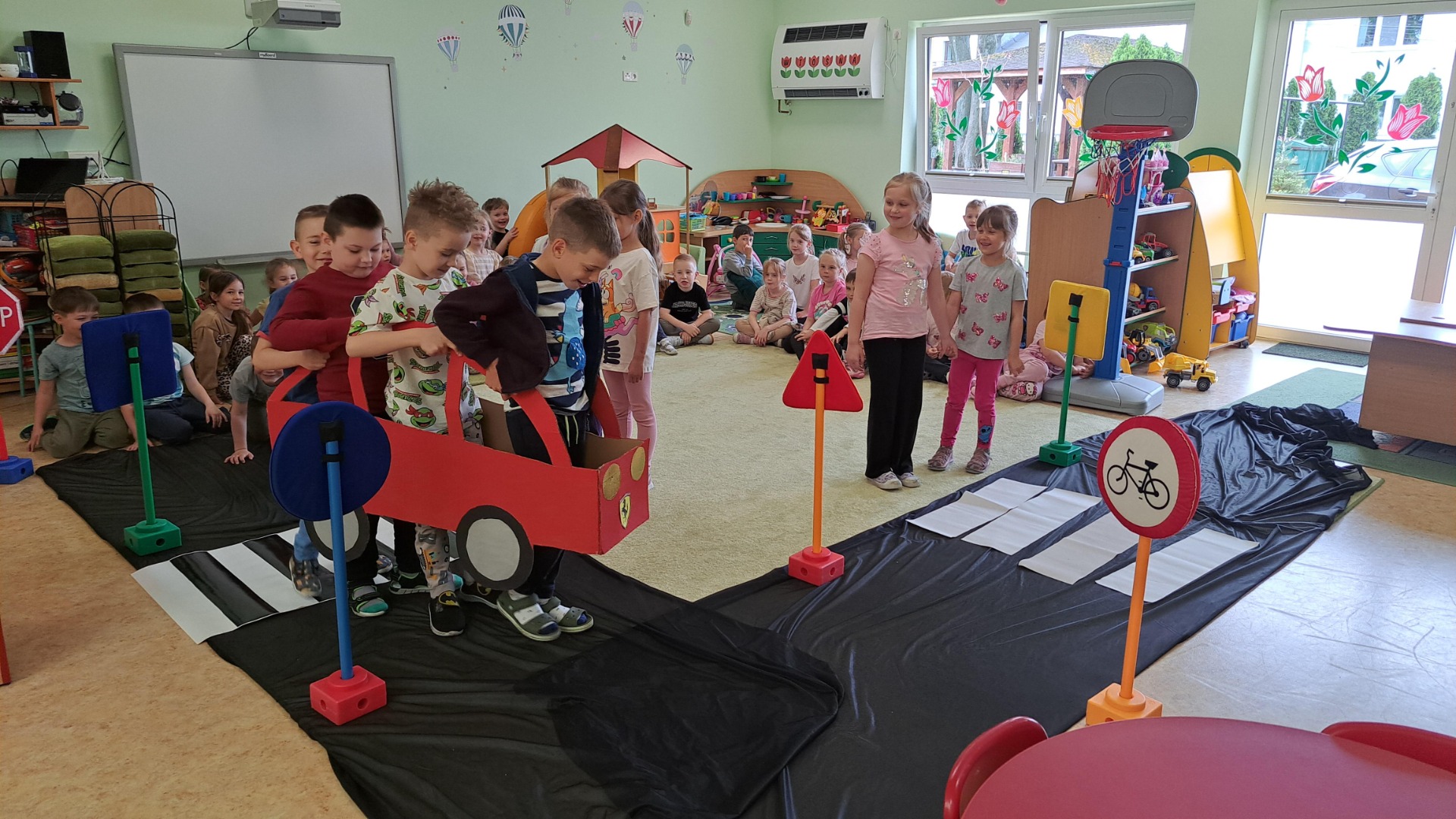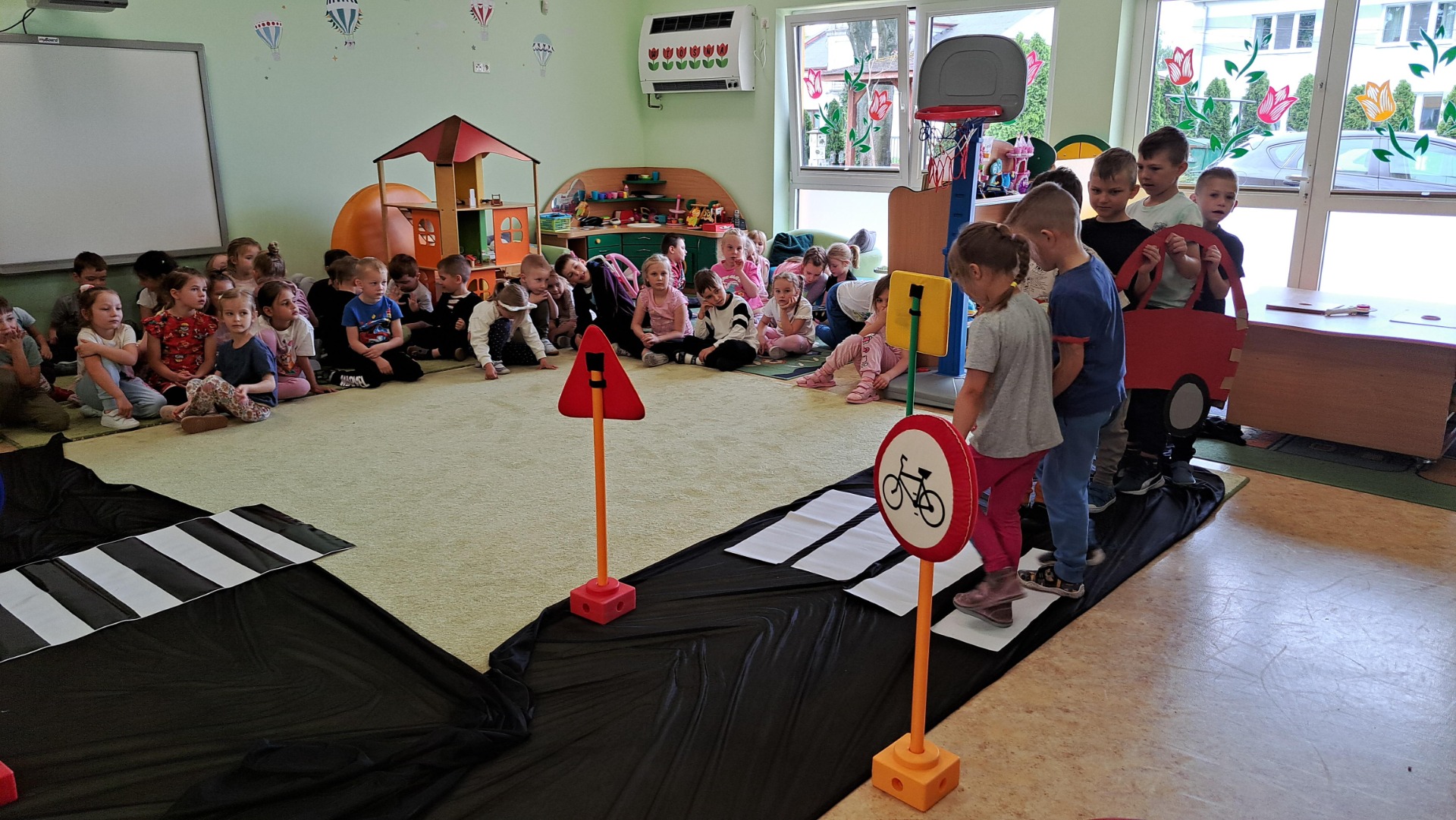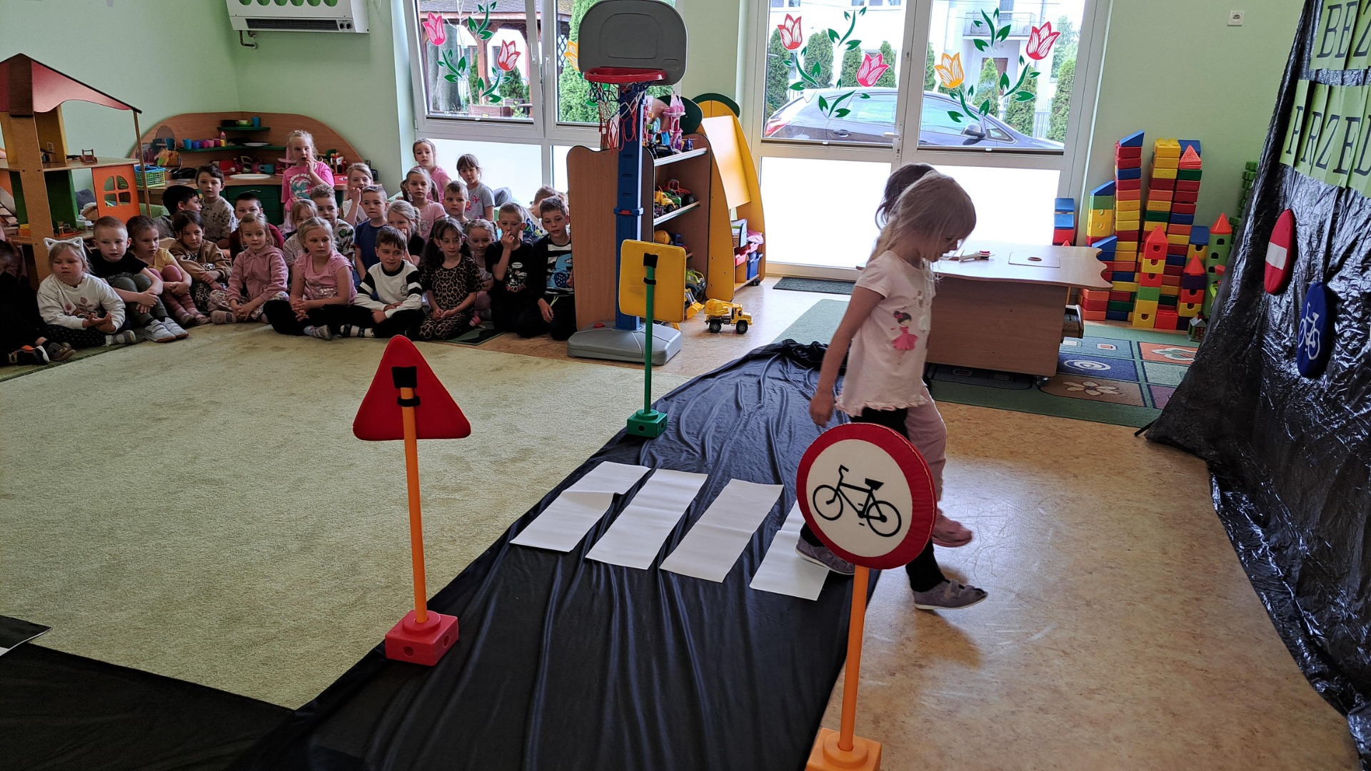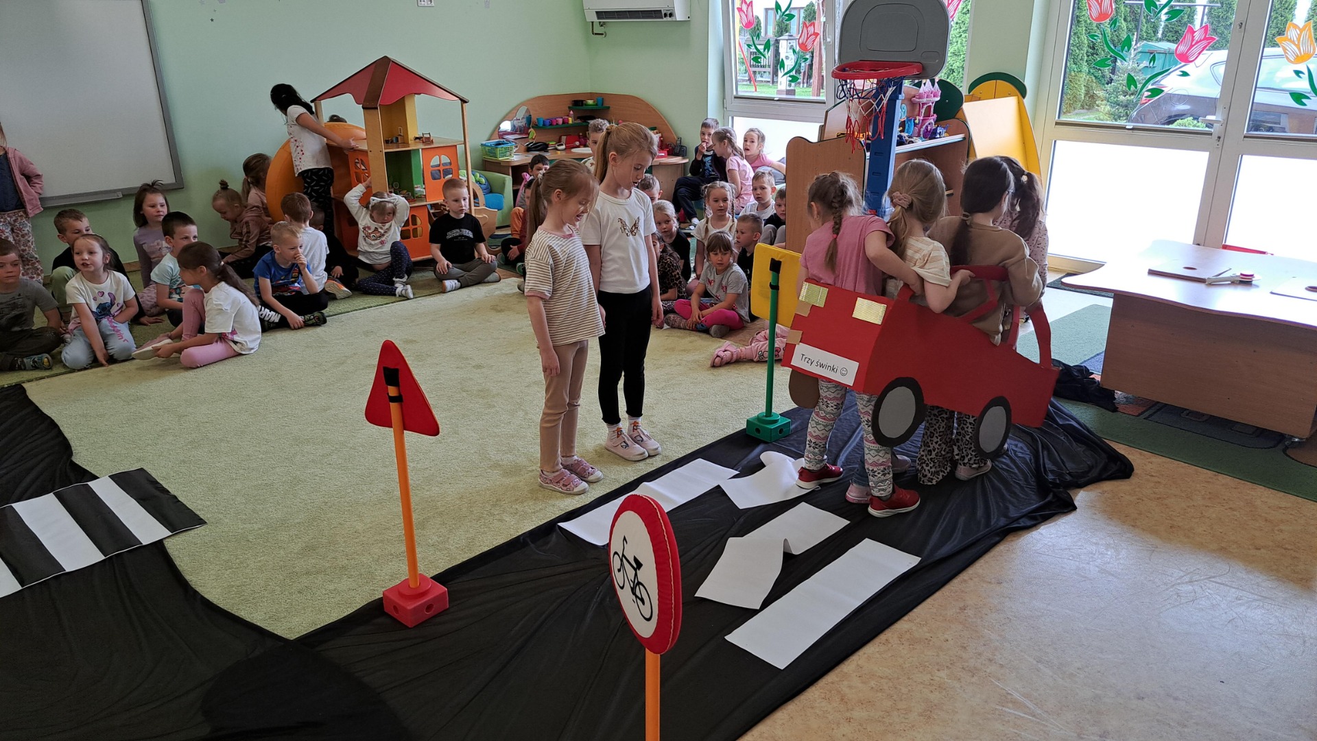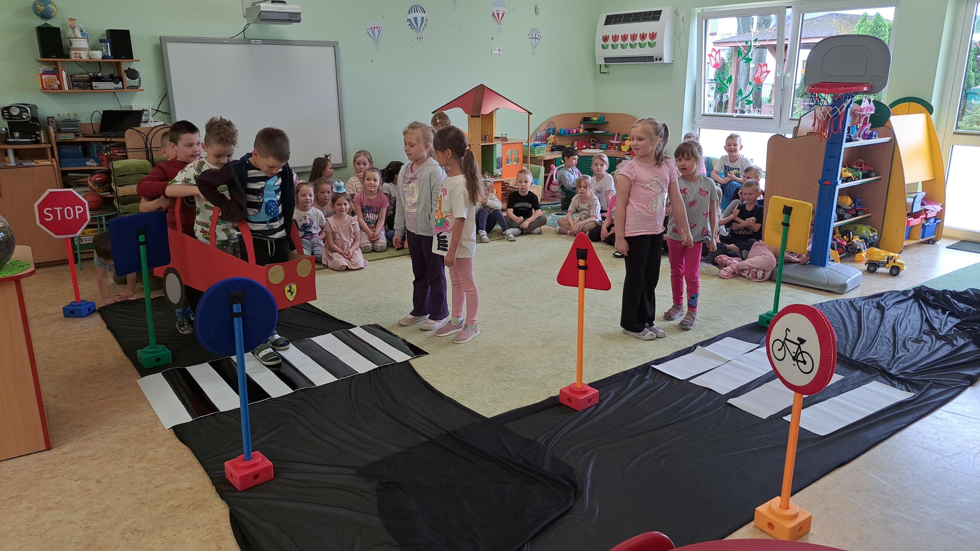 5 maja dwie starsze grupy przedszkolne zmierzyły się się w quizie wiedzy o bezpieczeństwie. Celem quizu było poznanie poziomu wiedzy przedszkolaków z zakresu bezpieczeństwa, utrwalenie prawidłowych i bezpiecznych zachowań w zabawie oraz zabawa z elementem rywalizacji. Dzieci zostały podzielone na 2 zespoły: niebieski i żółty. Zadania jakie miały dzieci do wykonania były zróżnicowane. Składały się na nie takie zabawy jak: rozwiązywanie zagadek, układanie puzzli, rozpoznawanie znaków, dopasowywanie właściwego numeru telefonu do pojazdu uprzywilejowanego, budowanie sygnalizatora świetlnego, ocenianie sytuacji poprzez wskazanie odpowiedniego numeru na lizaku, kompletowanie apteczki, reagowanie na sygnały wzrokowe (czerwone i zielone), poruszanie się po ulicy i pasach zgonie z zasadami. Obie drużyny wykazały się dużą wiedzą o zasadach ruchu drogowego i wyczerpująco odpowiadały na pytania. Gratulujemy wszystkim dzieciom tak bogatej wiedzy w tym temacie :).