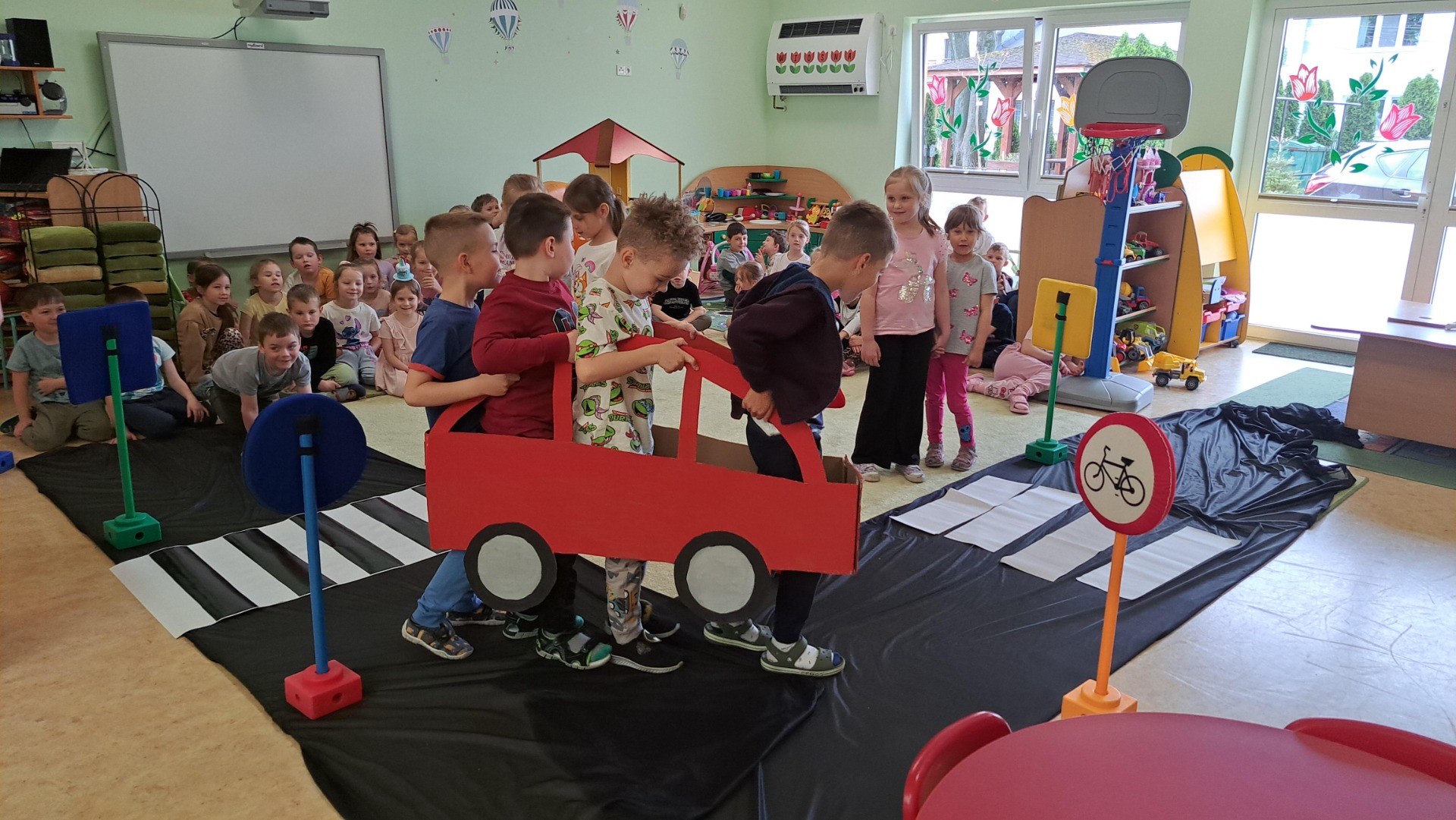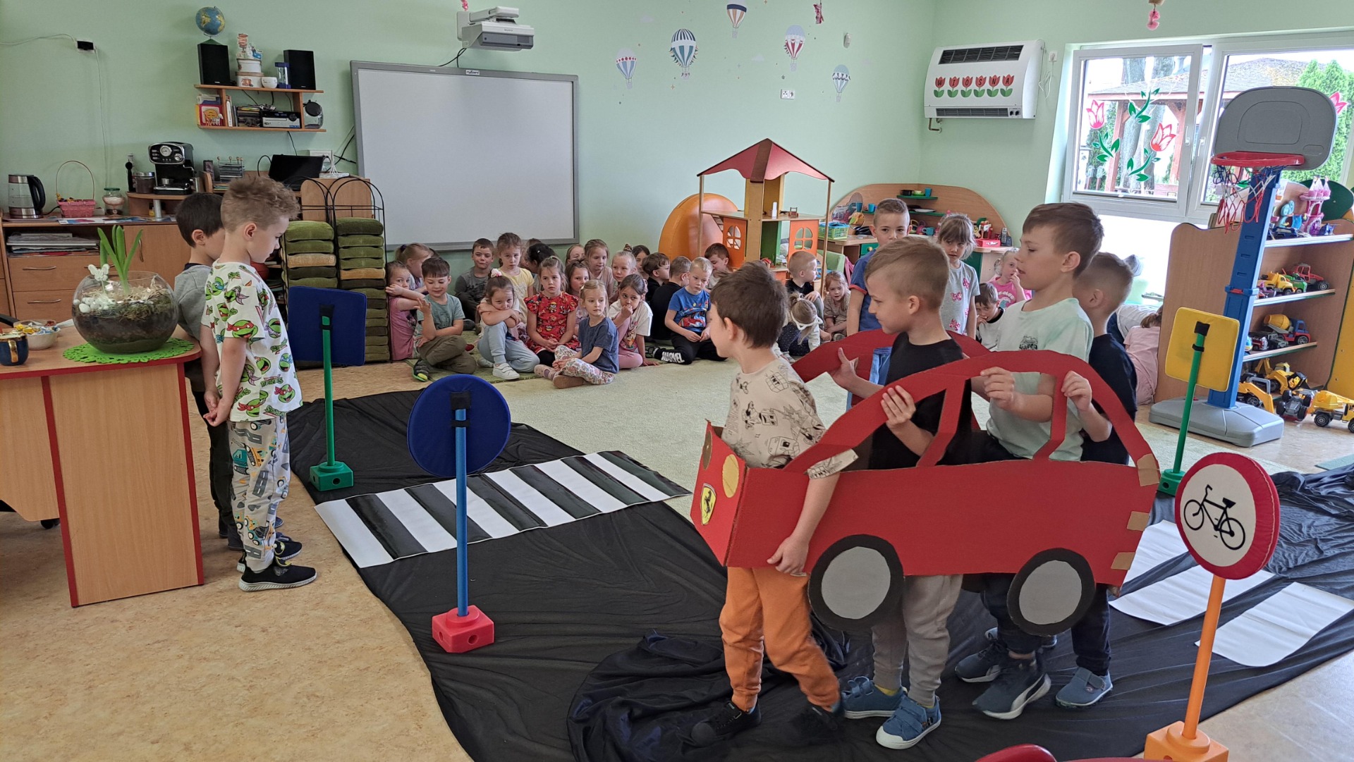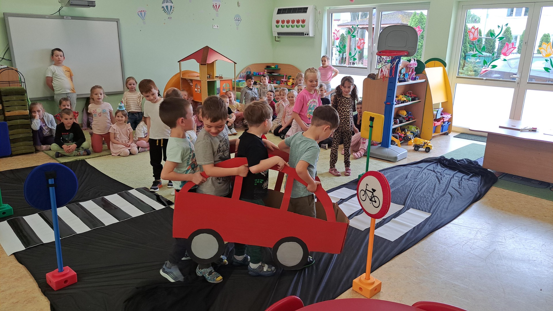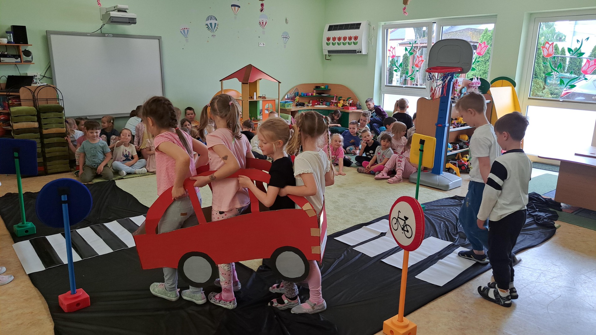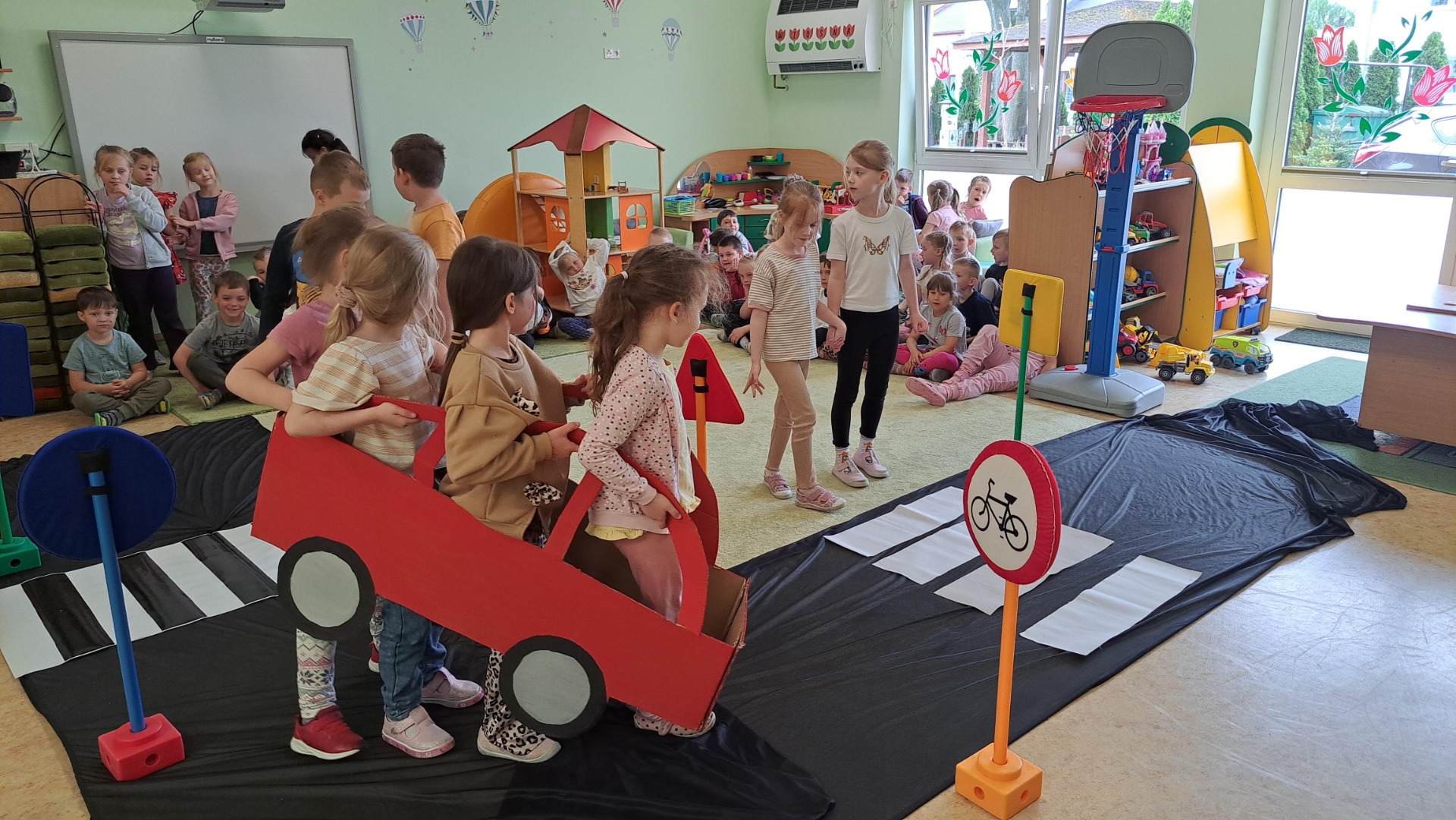 5 maja dwie starsze grupy przedszkolne zmierzyły się się w quizie wiedzy o bezpieczeństwie. Celem quizu było poznanie poziomu wiedzy przedszkolaków z zakresu bezpieczeństwa, utrwalenie prawidłowych i bezpiecznych zachowań w zabawie oraz zabawa z elementem rywalizacji. Dzieci zostały podzielone na 2 zespoły: niebieski i żółty. Zadania jakie miały dzieci do wykonania były zróżnicowane. Składały się na nie takie zabawy jak: rozwiązywanie zagadek, układanie puzzli, rozpoznawanie znaków, dopasowywanie właściwego numeru telefonu do pojazdu uprzywilejowanego, budowanie sygnalizatora świetlnego, ocenianie sytuacji poprzez wskazanie odpowiedniego numeru na lizaku, kompletowanie apteczki, reagowanie na sygnały wzrokowe (czerwone i zielone), poruszanie się po ulicy i pasach zgonie z zasadami. Obie drużyny wykazały się dużą wiedzą o zasadach ruchu drogowego i wyczerpująco odpowiadały na pytania. Gratulujemy wszystkim dzieciom tak bogatej wiedzy w tym temacie :).