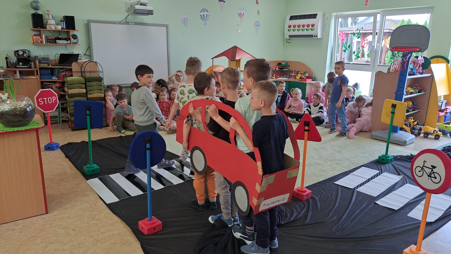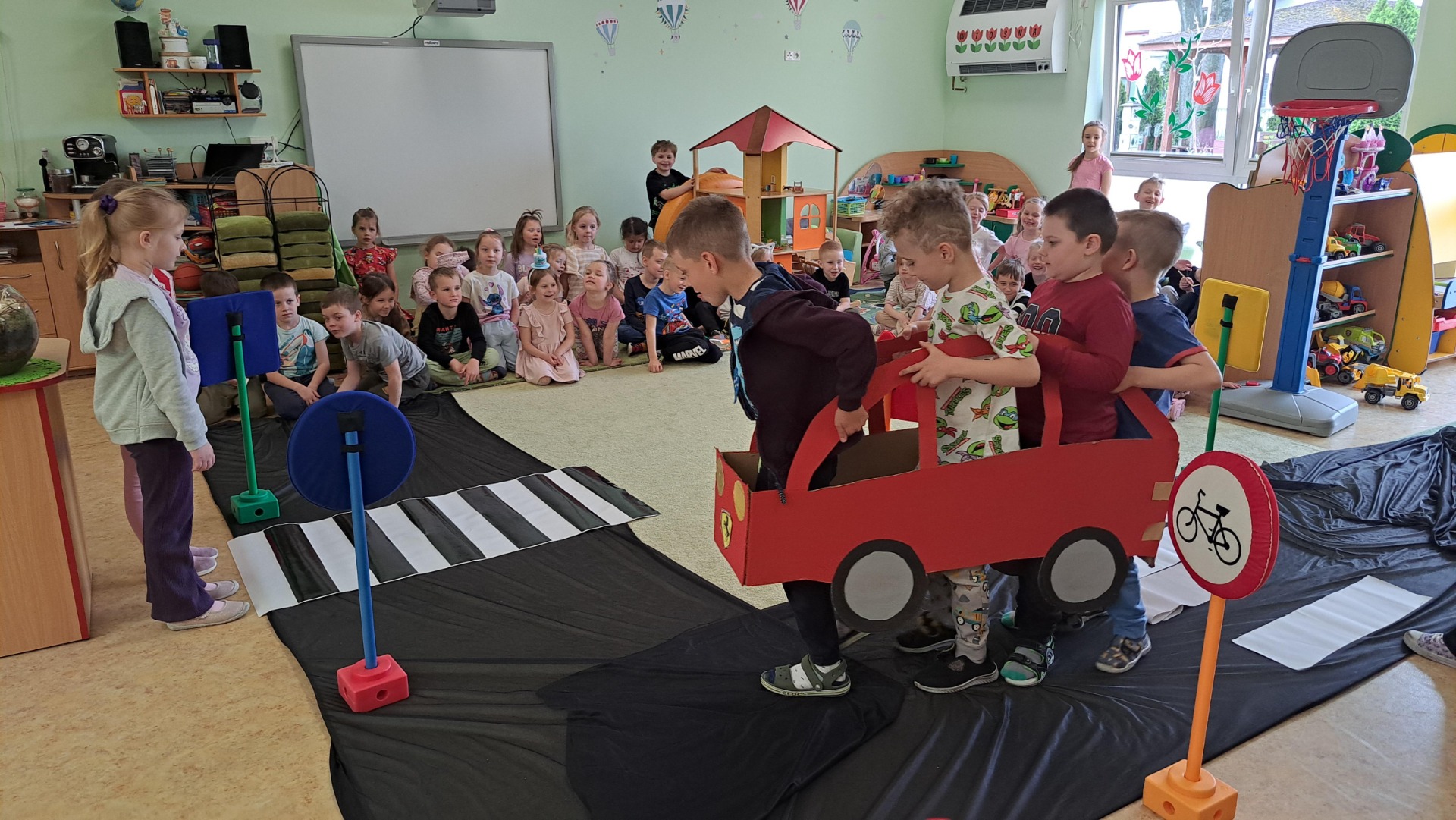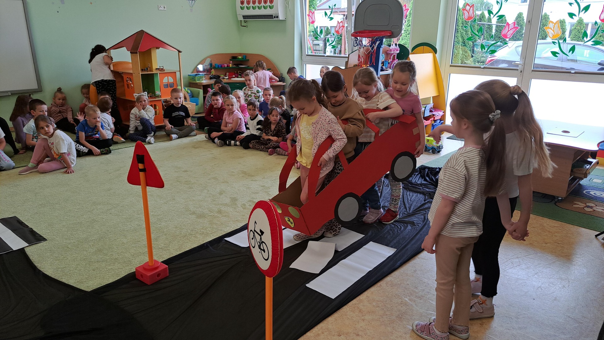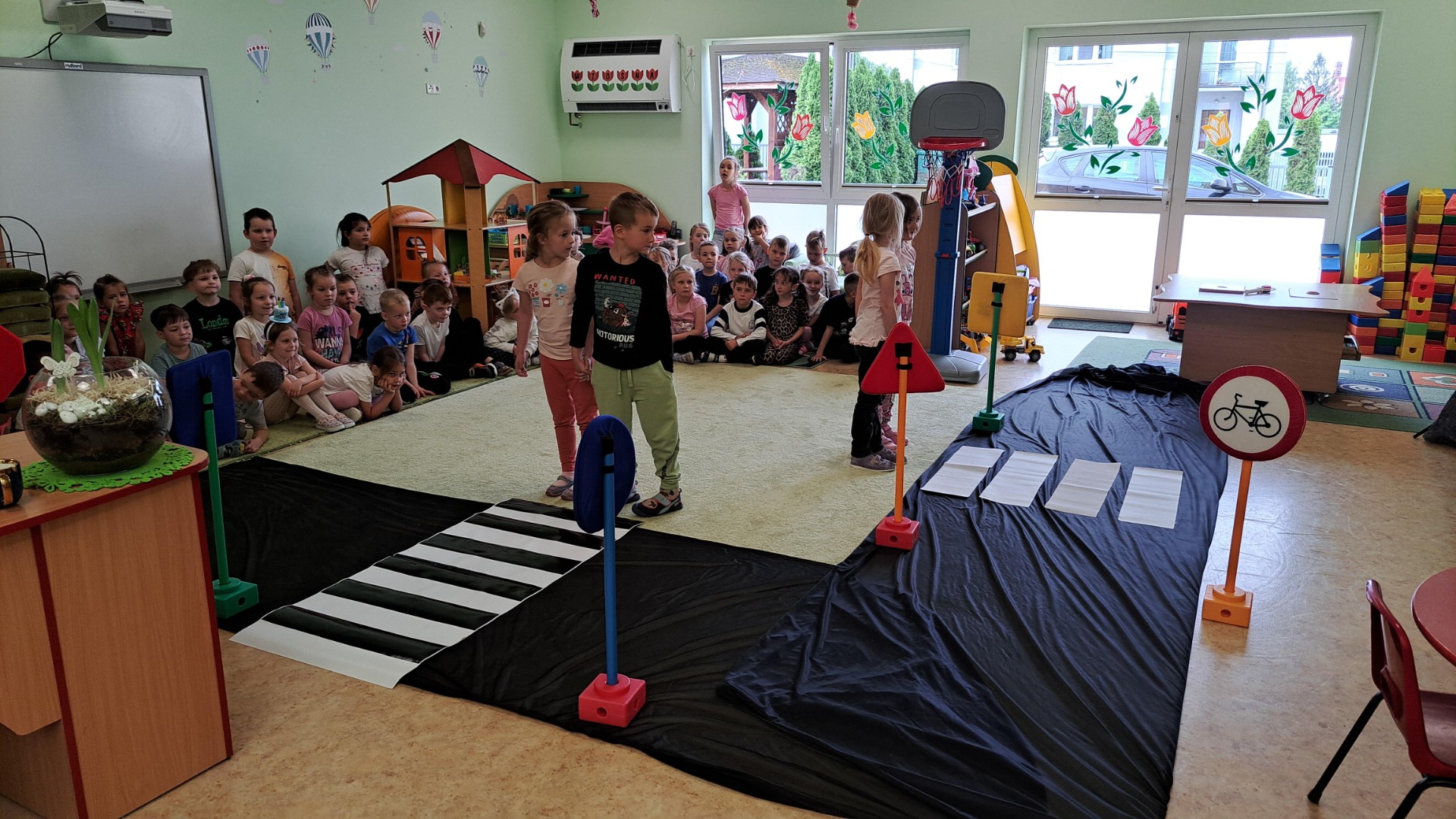 5 maja dwie starsze grupy przedszkolne zmierzyły się się w quizie wiedzy o bezpieczeństwie. Celem quizu było poznanie poziomu wiedzy przedszkolaków z zakresu bezpieczeństwa, utrwalenie prawidłowych i bezpiecznych zachowań w zabawie oraz zabawa z elementem rywalizacji. Dzieci zostały podzielone na 2 zespoły: niebieski i żółty. Zadania jakie miały dzieci do wykonania były zróżnicowane. Składały się na nie takie zabawy jak: rozwiązywanie zagadek, układanie puzzli, rozpoznawanie znaków, dopasowywanie właściwego numeru telefonu do pojazdu uprzywilejowanego, budowanie sygnalizatora świetlnego, ocenianie sytuacji poprzez wskazanie odpowiedniego numeru na lizaku, kompletowanie apteczki, reagowanie na sygnały wzrokowe (czerwone i zielone), poruszanie się po ulicy i pasach zgonie z zasadami. Obie drużyny wykazały się dużą wiedzą o zasadach ruchu drogowego i wyczerpująco odpowiadały na pytania. Gratulujemy wszystkim dzieciom tak bogatej wiedzy w tym temacie :).