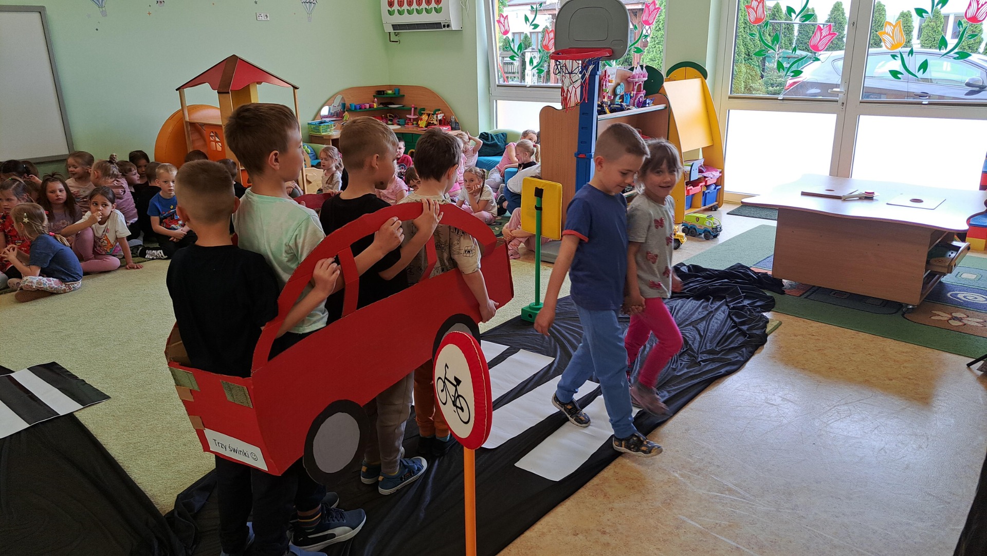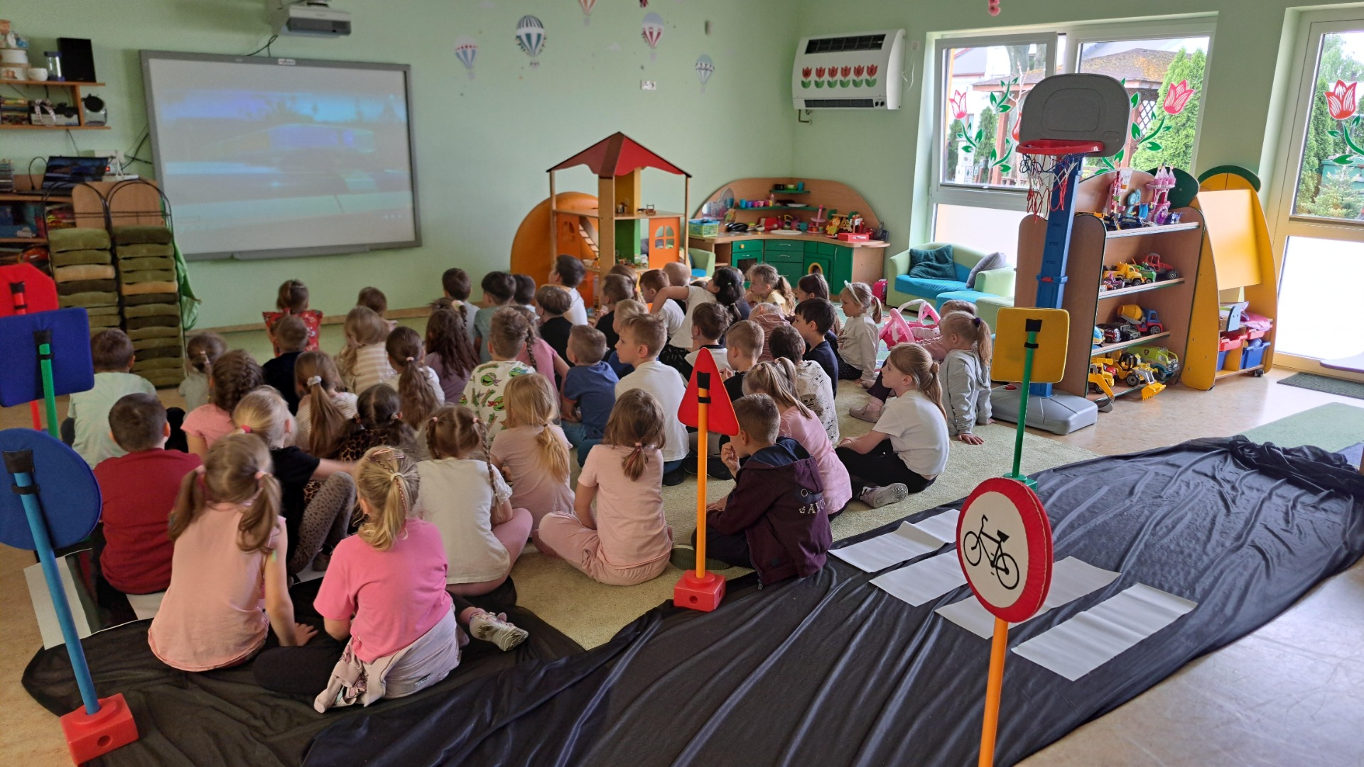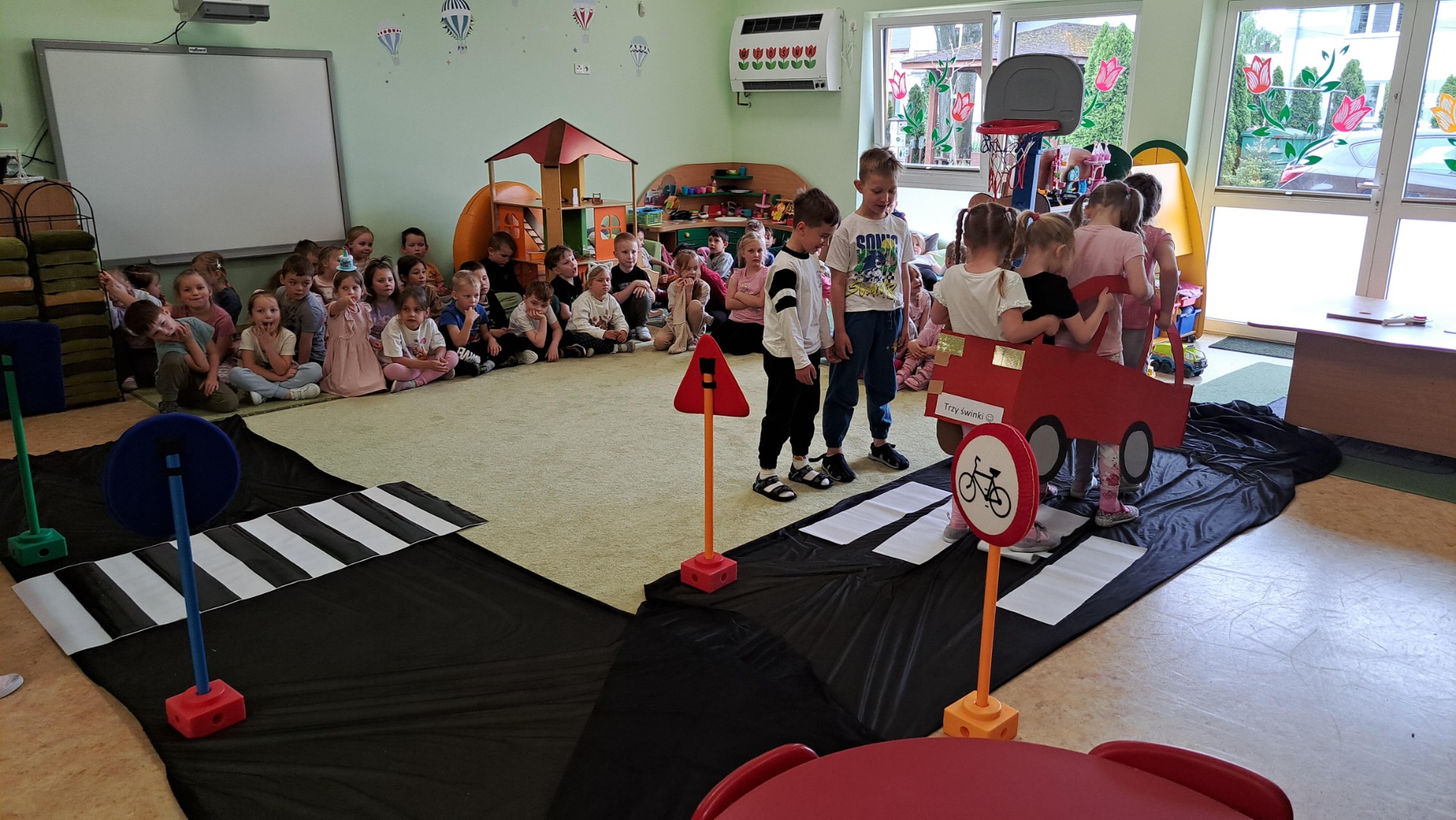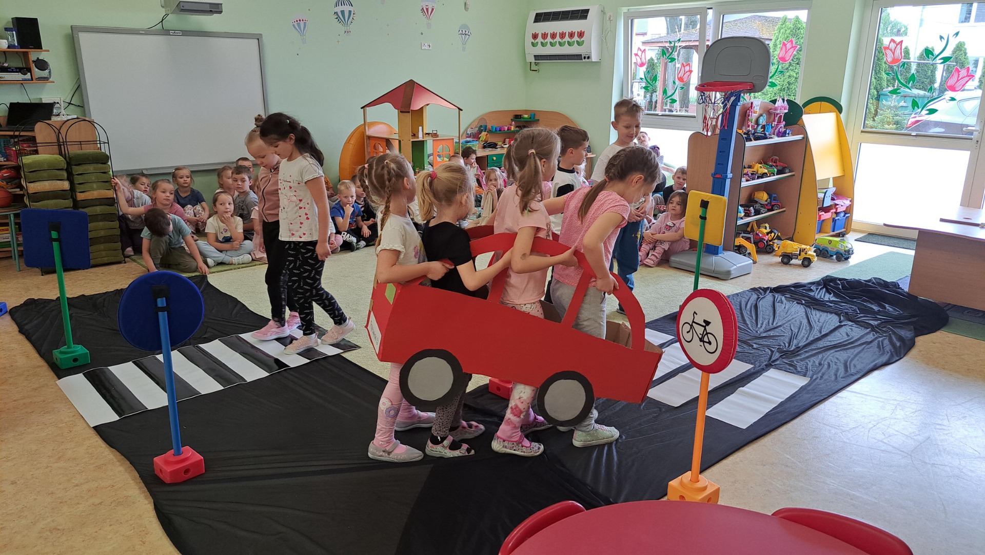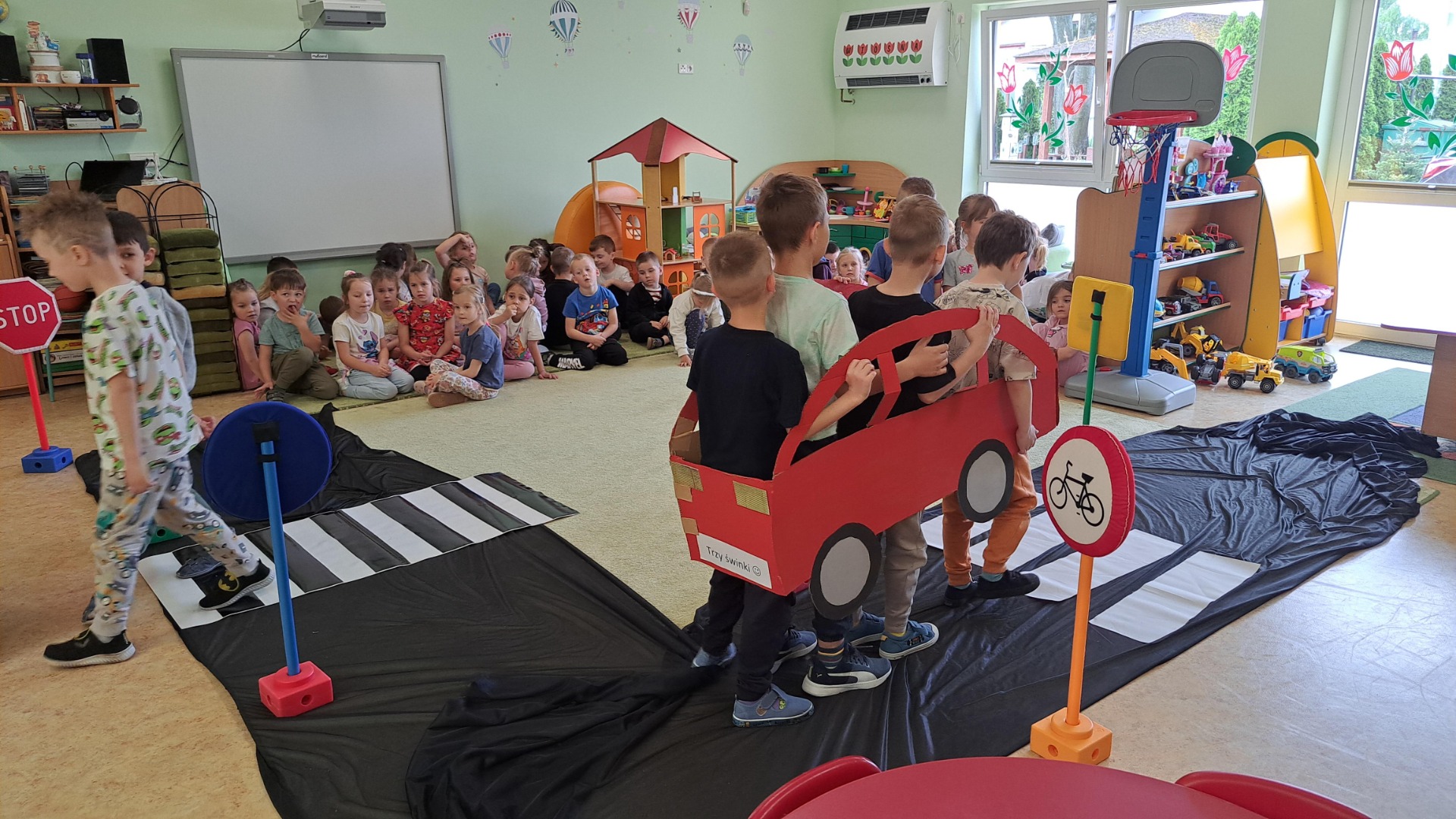 5 maja dwie starsze grupy przedszkolne zmierzyły się się w quizie wiedzy o bezpieczeństwie. Celem quizu było poznanie poziomu wiedzy przedszkolaków z zakresu bezpieczeństwa, utrwalenie prawidłowych i bezpiecznych zachowań w zabawie oraz zabawa z elementem rywalizacji. Dzieci zostały podzielone na 2 zespoły: niebieski i żółty. Zadania jakie miały dzieci do wykonania były zróżnicowane. Składały się na nie takie zabawy jak: rozwiązywanie zagadek, układanie puzzli, rozpoznawanie znaków, dopasowywanie właściwego numeru telefonu do pojazdu uprzywilejowanego, budowanie sygnalizatora świetlnego, ocenianie sytuacji poprzez wskazanie odpowiedniego numeru na lizaku, kompletowanie apteczki, reagowanie na sygnały wzrokowe (czerwone i zielone), poruszanie się po ulicy i pasach zgonie z zasadami. Obie drużyny wykazały się dużą wiedzą o zasadach ruchu drogowego i wyczerpująco odpowiadały na pytania. Gratulujemy wszystkim dzieciom tak bogatej wiedzy w tym temacie :).