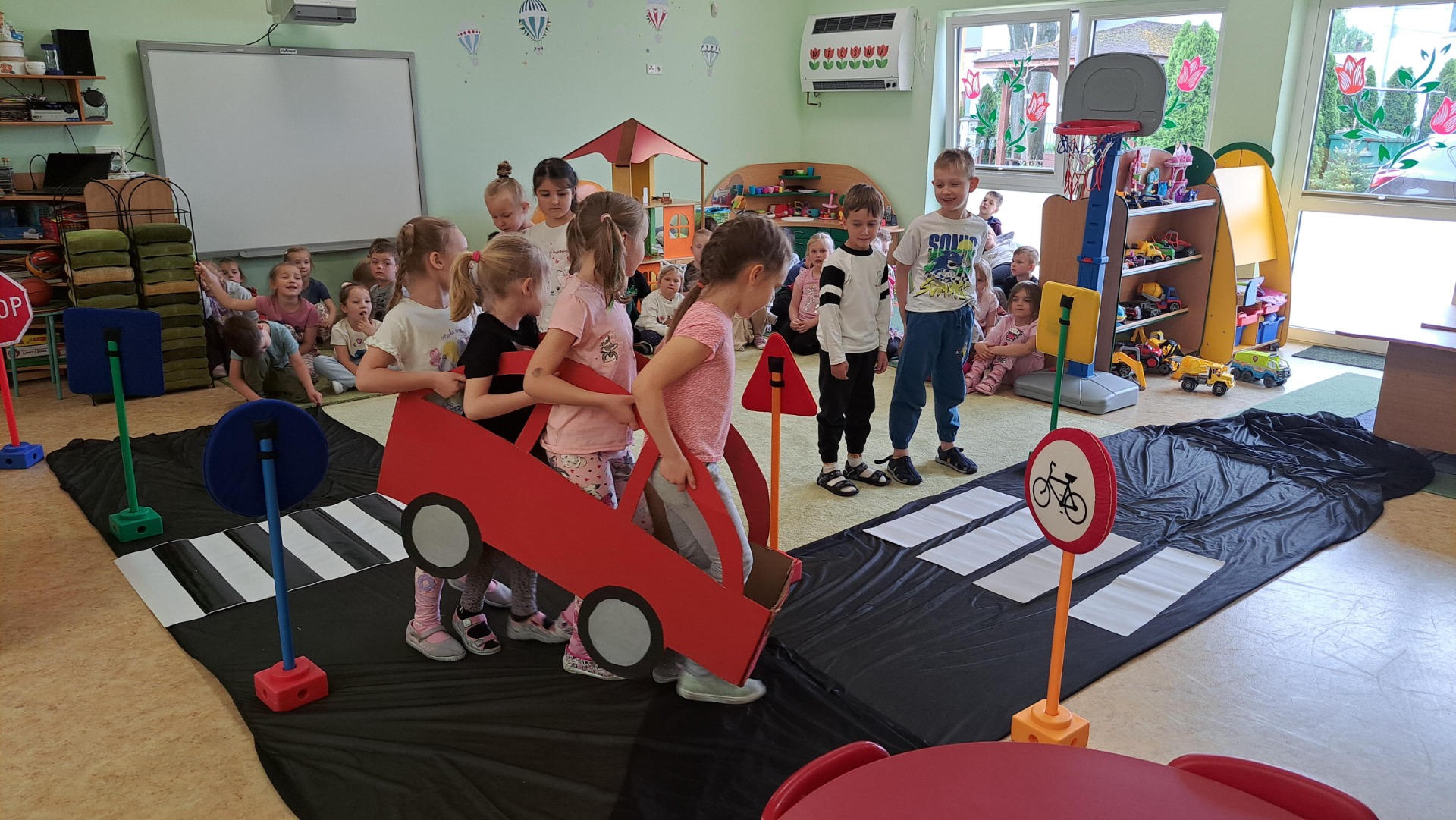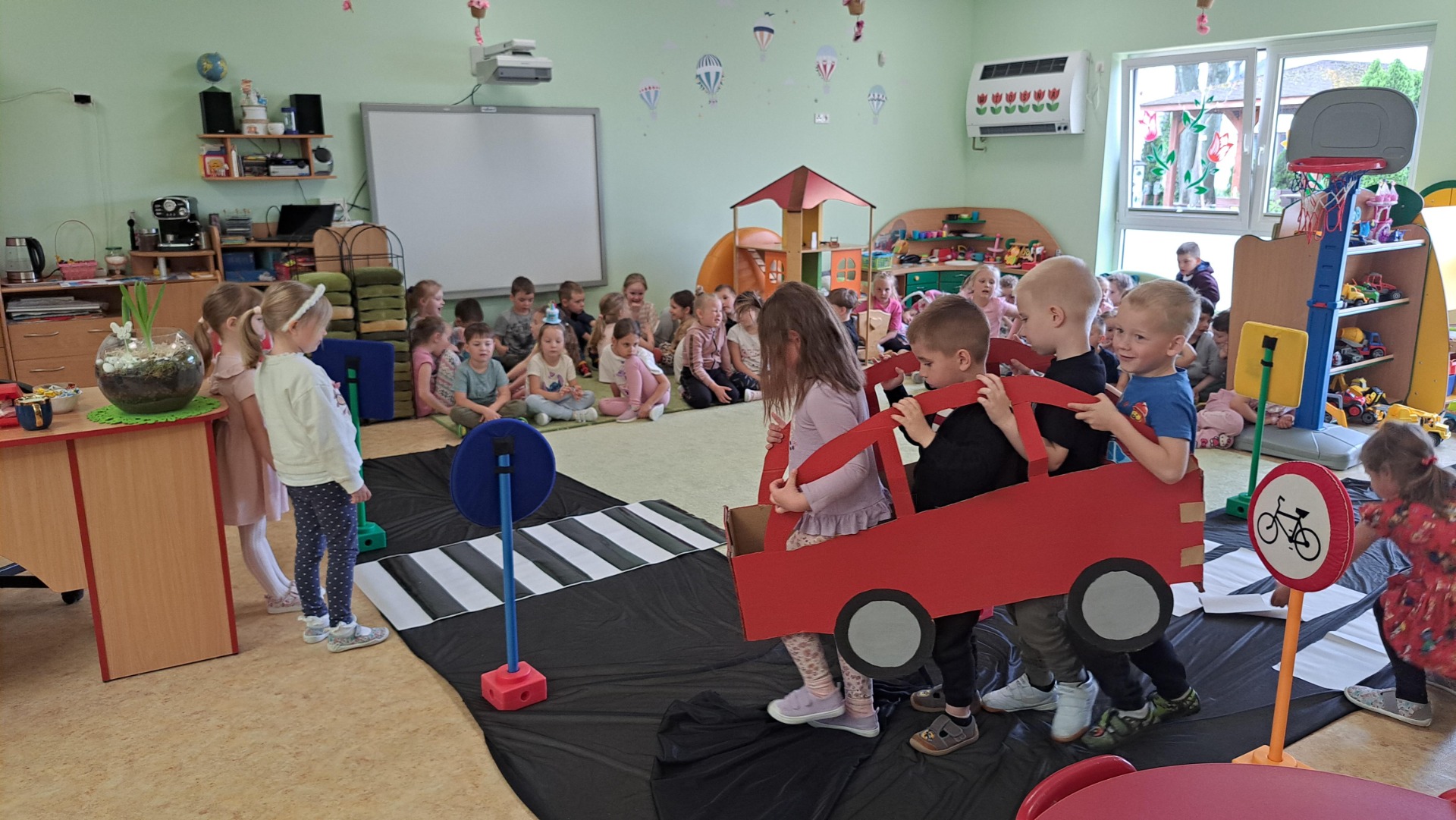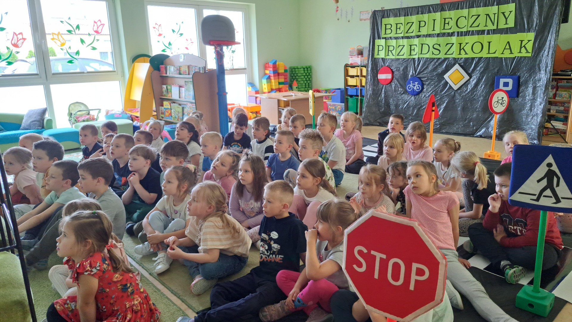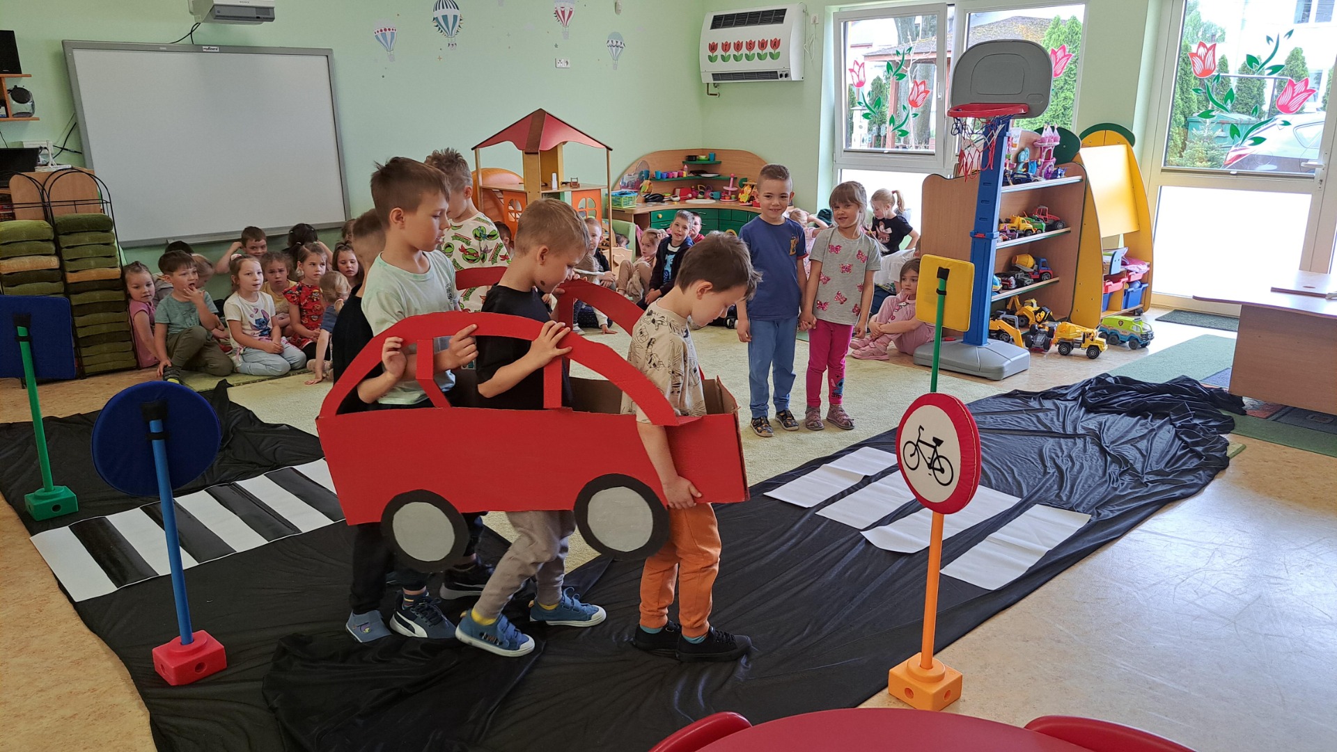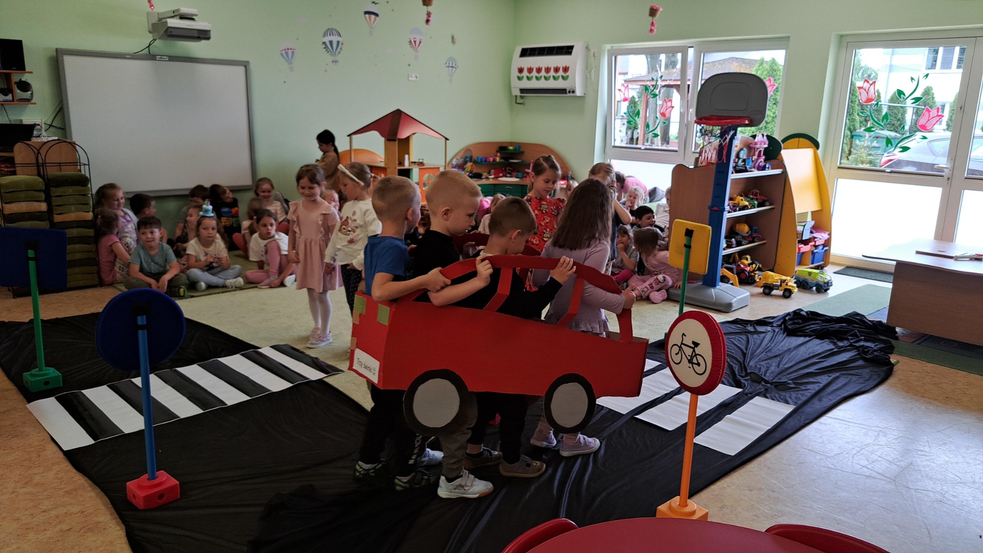 5 maja dwie starsze grupy przedszkolne zmierzyły się się w quizie wiedzy o bezpieczeństwie. Celem quizu było poznanie poziomu wiedzy przedszkolaków z zakresu bezpieczeństwa, utrwalenie prawidłowych i bezpiecznych zachowań w zabawie oraz zabawa z elementem rywalizacji. Dzieci zostały podzielone na 2 zespoły: niebieski i żółty. Zadania jakie miały dzieci do wykonania były zróżnicowane. Składały się na nie takie zabawy jak: rozwiązywanie zagadek, układanie puzzli, rozpoznawanie znaków, dopasowywanie właściwego numeru telefonu do pojazdu uprzywilejowanego, budowanie sygnalizatora świetlnego, ocenianie sytuacji poprzez wskazanie odpowiedniego numeru na lizaku, kompletowanie apteczki, reagowanie na sygnały wzrokowe (czerwone i zielone), poruszanie się po ulicy i pasach zgonie z zasadami. Obie drużyny wykazały się dużą wiedzą o zasadach ruchu drogowego i wyczerpująco odpowiadały na pytania. Gratulujemy wszystkim dzieciom tak bogatej wiedzy w tym temacie :).