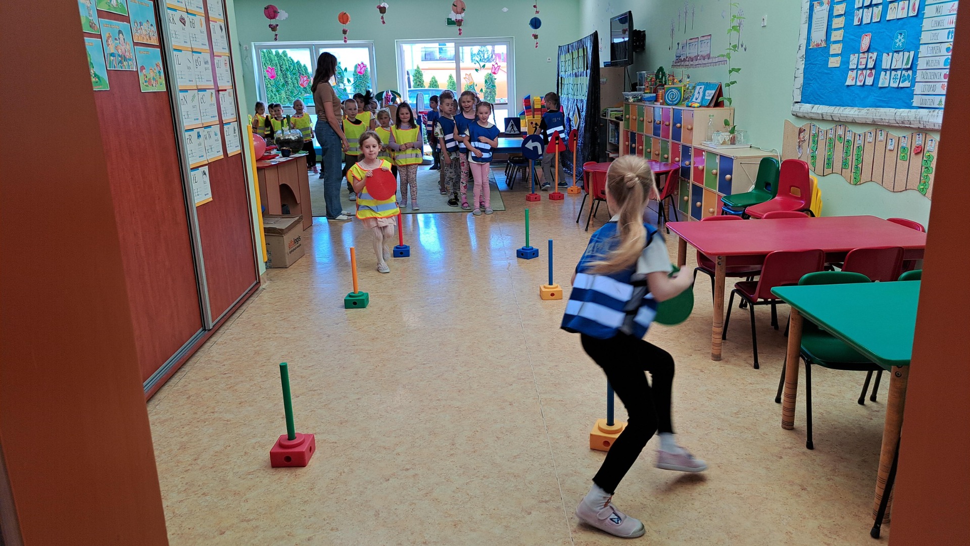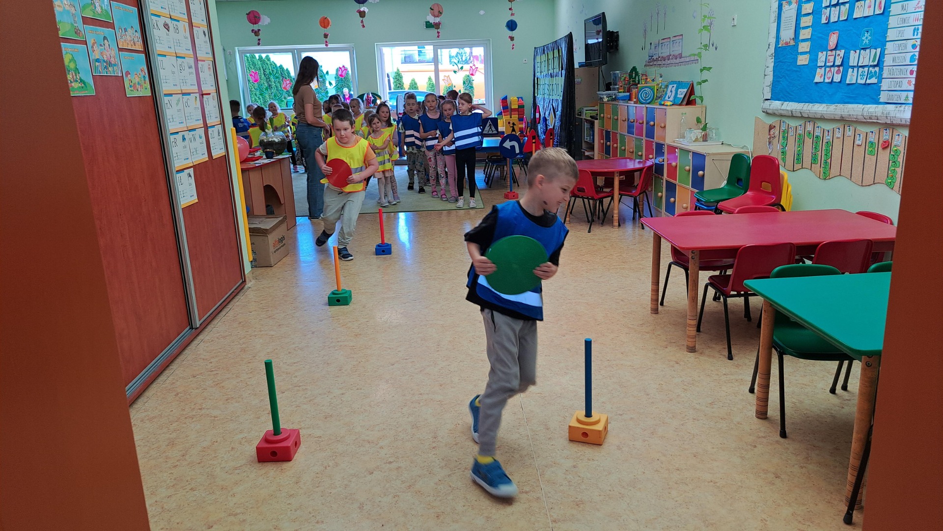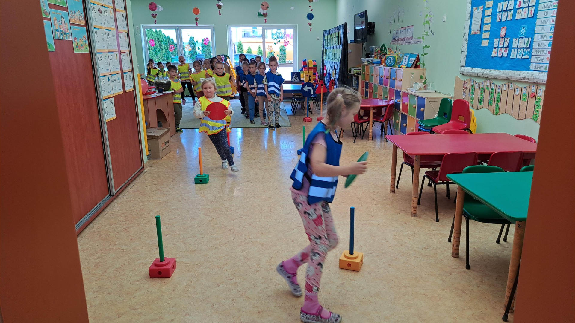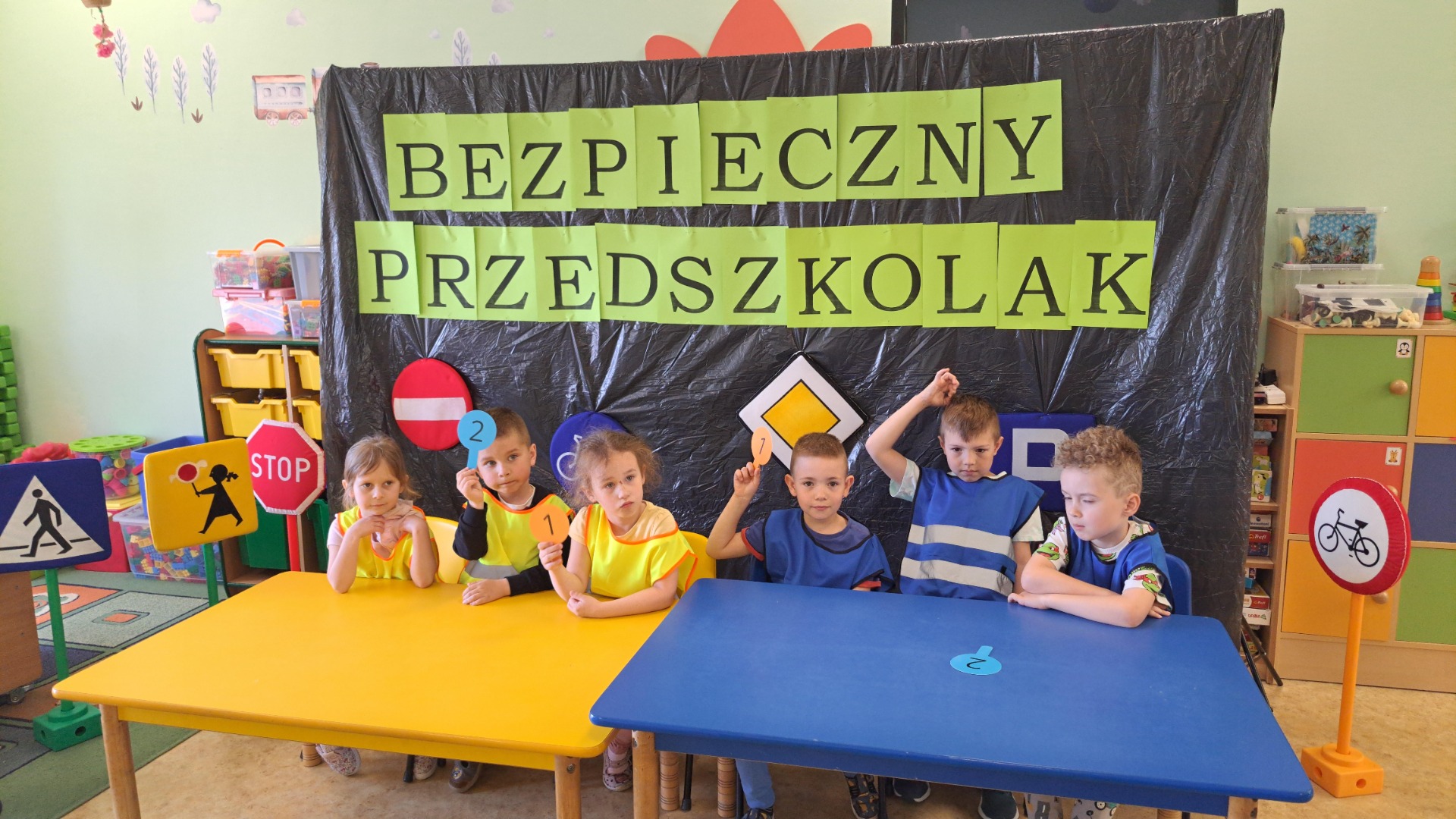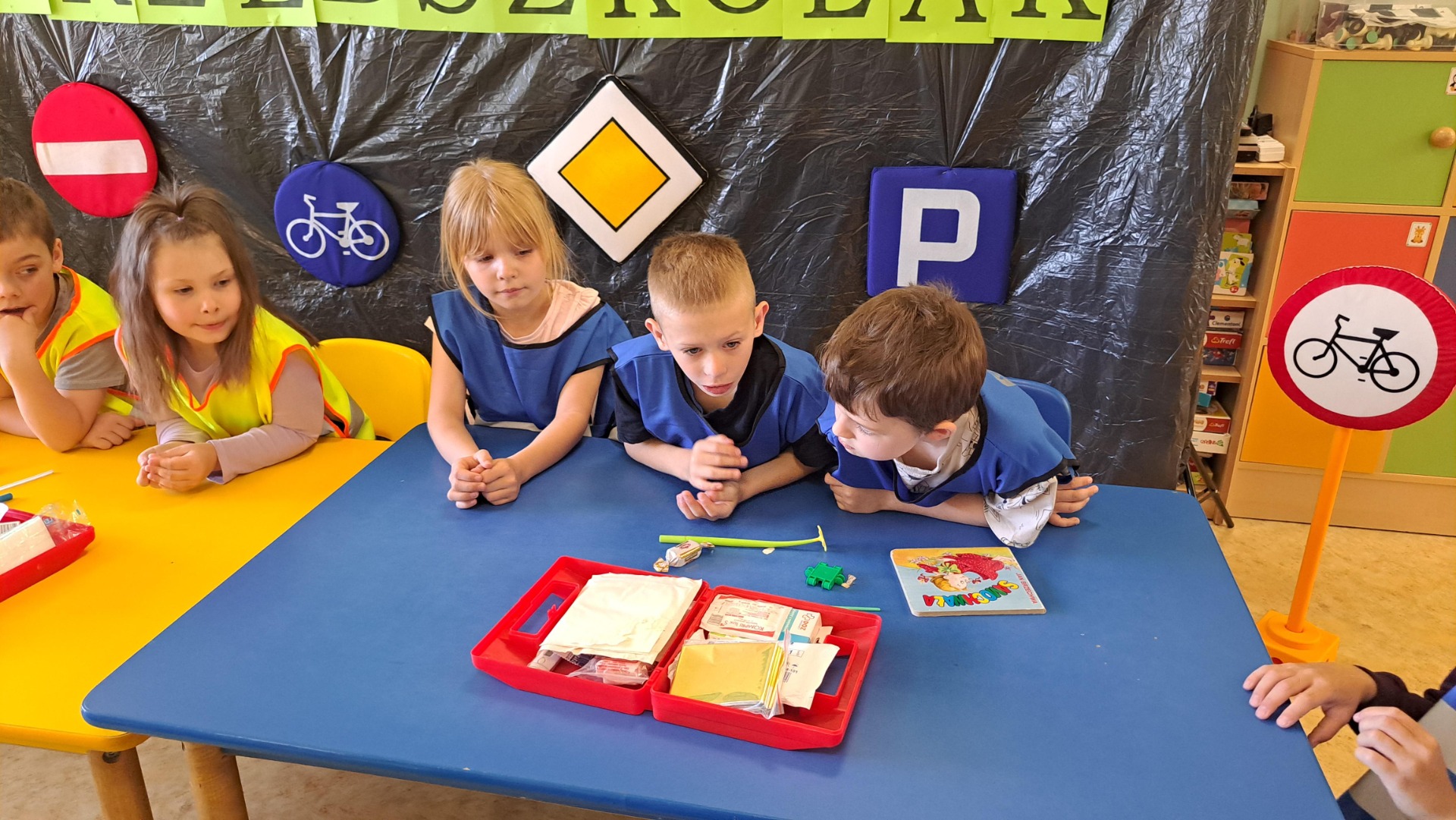5 maja dwie starsze grupy przedszkolne zmierzyły się się w quizie wiedzy o bezpieczeństwie. Celem quizu było poznanie poziomu wiedzy przedszkolaków z zakresu bezpieczeństwa, utrwalenie prawidłowych i bezpiecznych zachowań w zabawie oraz zabawa z elementem rywalizacji. Dzieci zostały podzielone na 2 zespoły: niebieski i żółty. Zadania jakie miały dzieci do wykonania były zróżnicowane. Składały się na nie takie zabawy jak: rozwiązywanie zagadek, układanie puzzli, rozpoznawanie znaków, dopasowywanie właściwego numeru telefonu do pojazdu uprzywilejowanego, budowanie sygnalizatora świetlnego, ocenianie sytuacji poprzez wskazanie odpowiedniego numeru na lizaku, kompletowanie apteczki, reagowanie na sygnały wzrokowe (czerwone i zielone), poruszanie się po ulicy i pasach zgonie z zasadami. Obie drużyny wykazały się dużą wiedzą o zasadach ruchu drogowego i wyczerpująco odpowiadały na pytania. Gratulujemy wszystkim dzieciom tak bogatej wiedzy w tym temacie :).