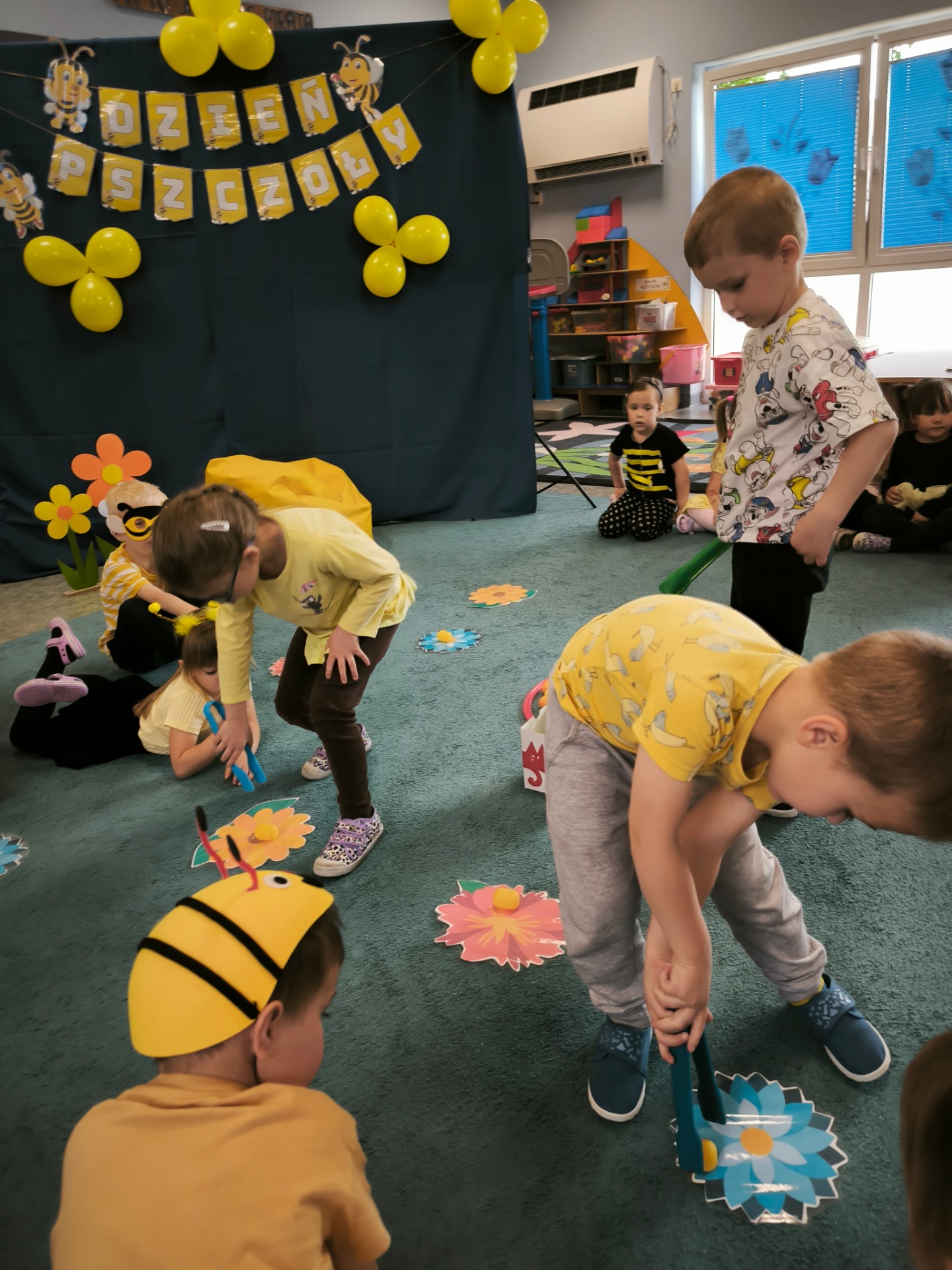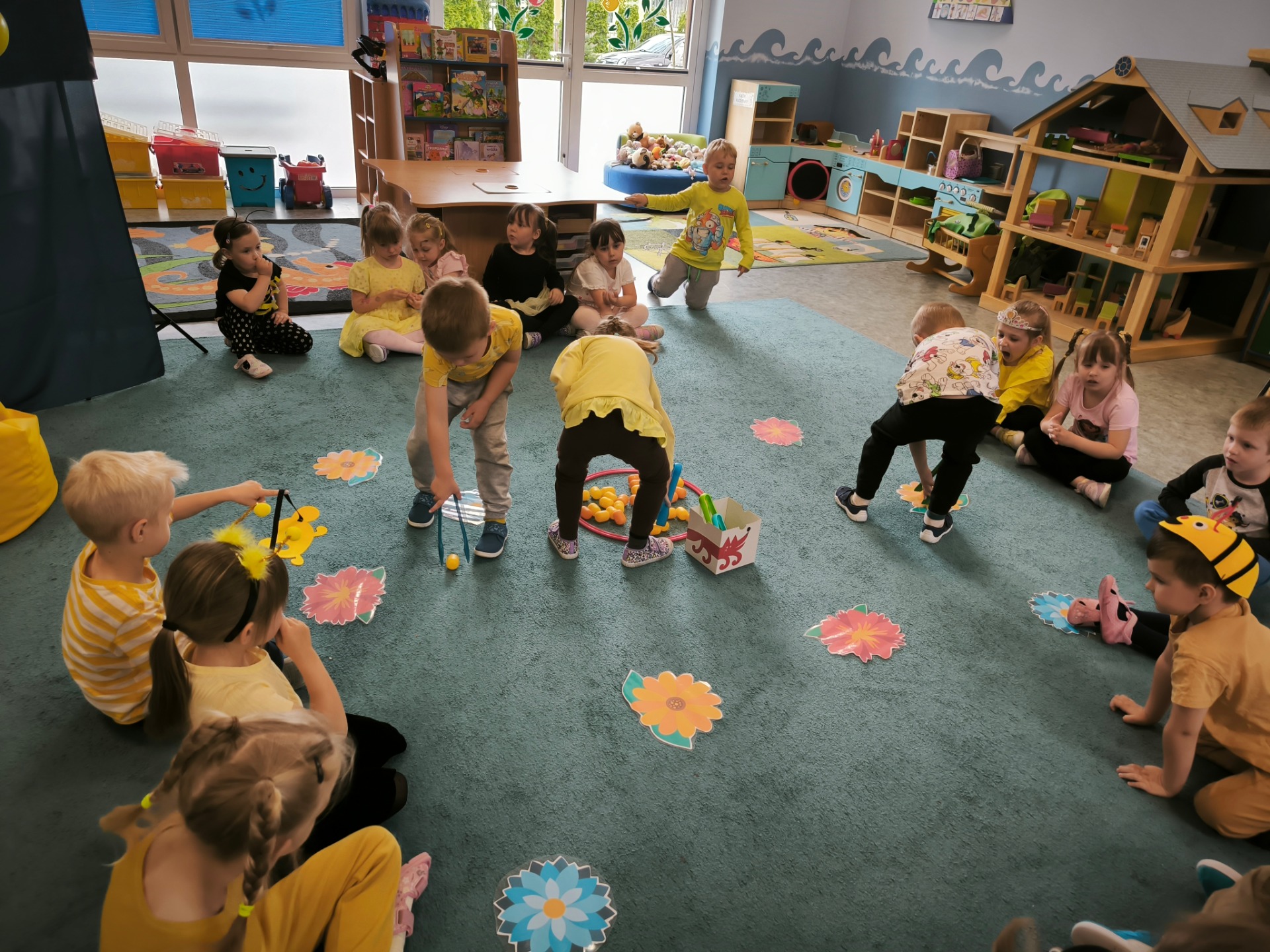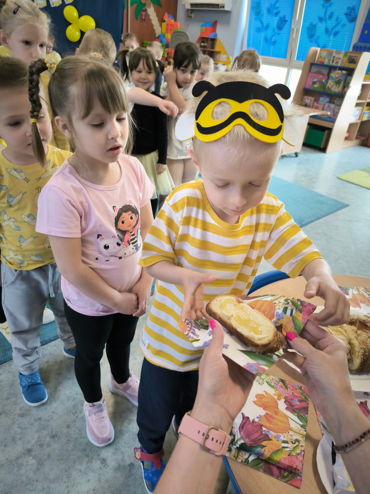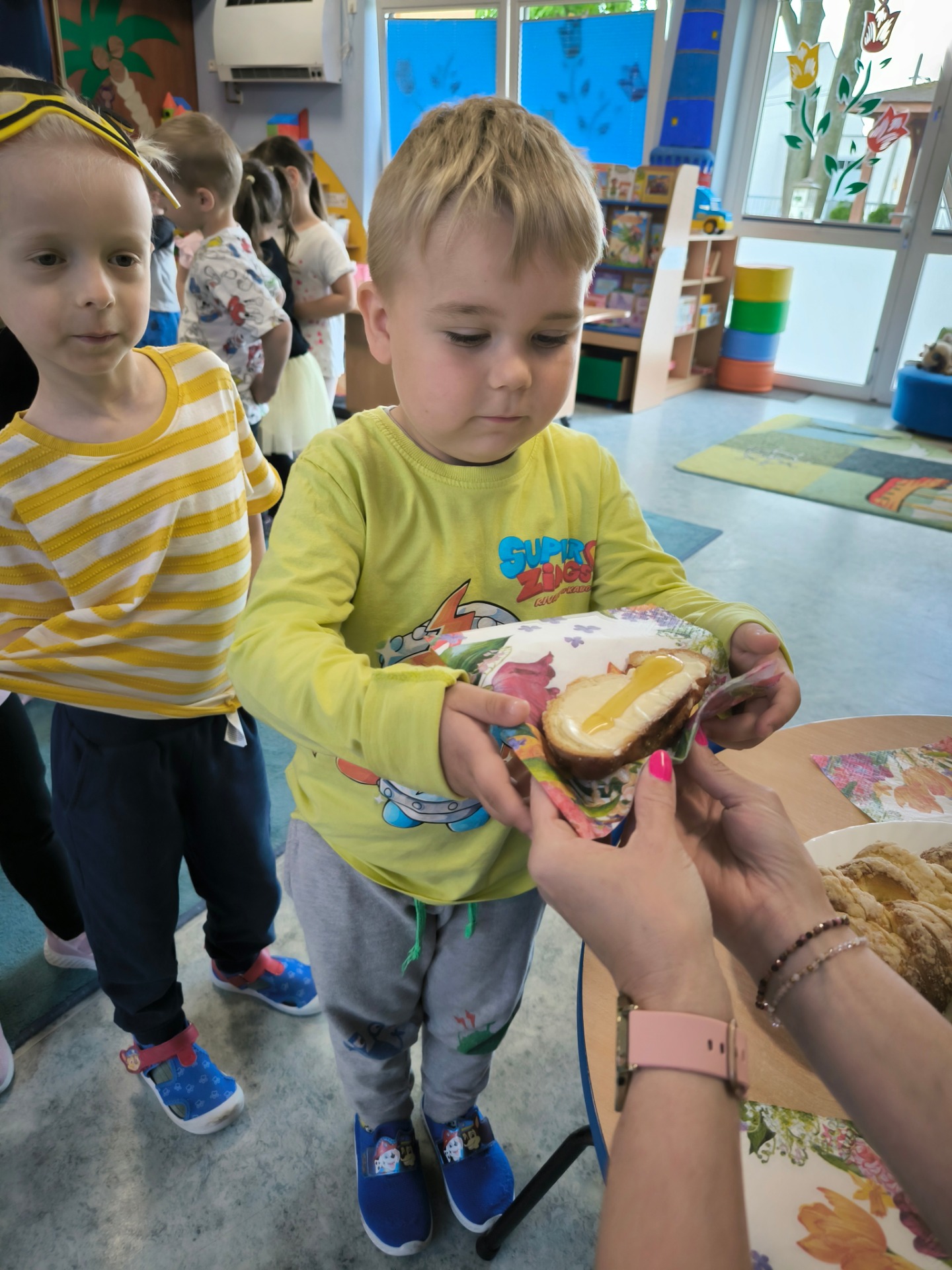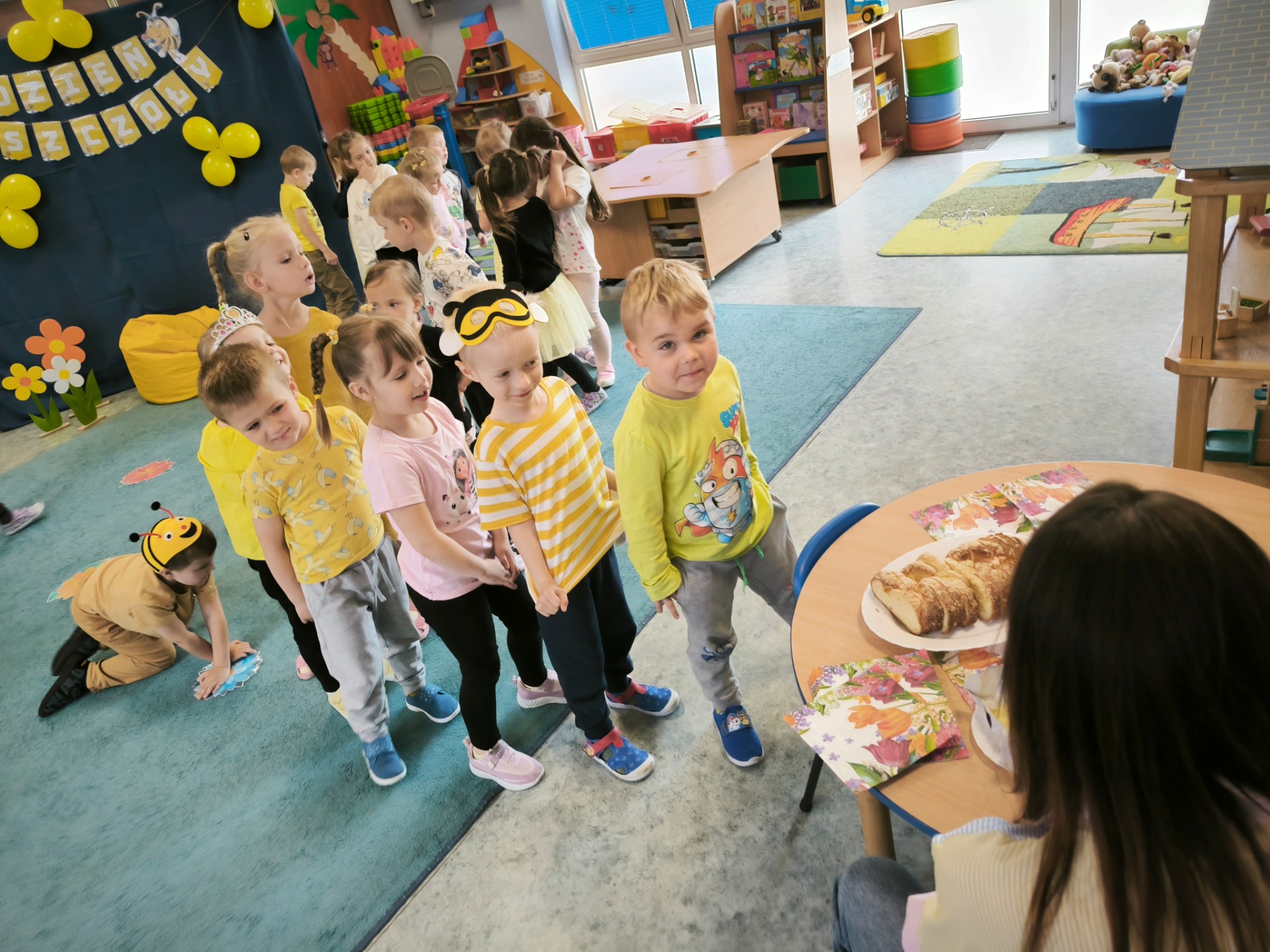 Piraci poznali niektóre tajemnice z życia pszczół, poprzez zabawę rozwijali swoją wiedzę przyrodniczą oraz dużą i małą motorykę. Ciocia Ewelina upiekła domową chałkę, którą dzieci zjadły z pysznym miodem.
